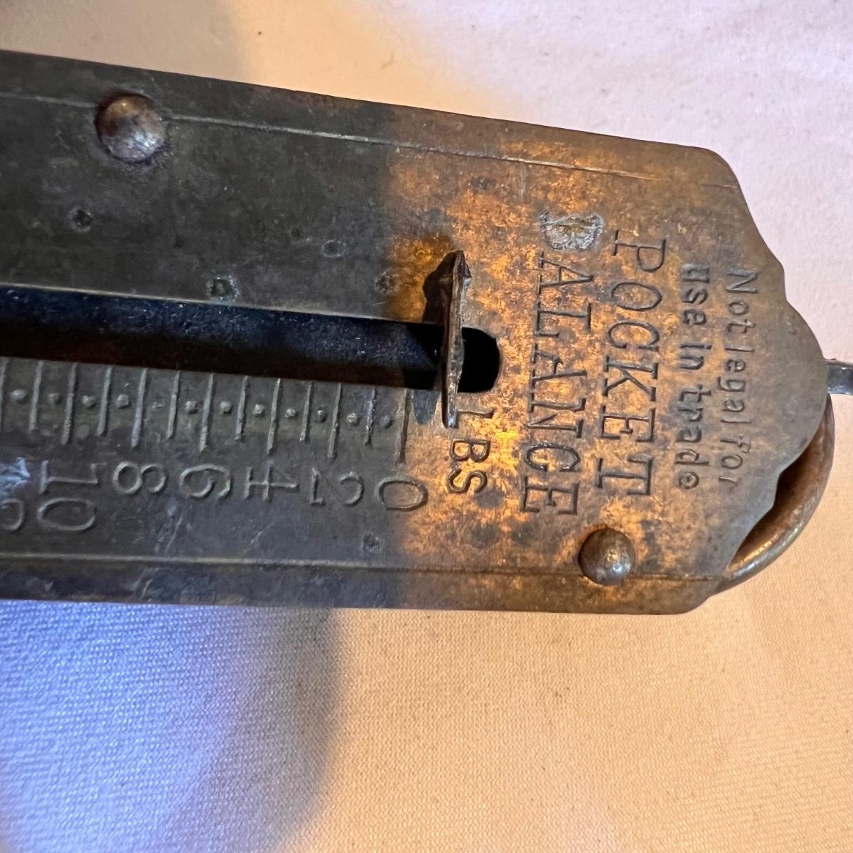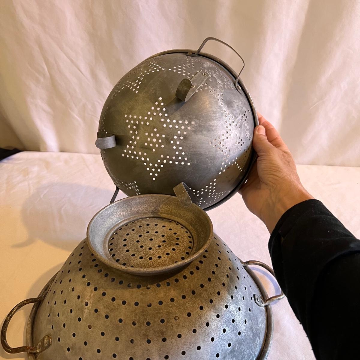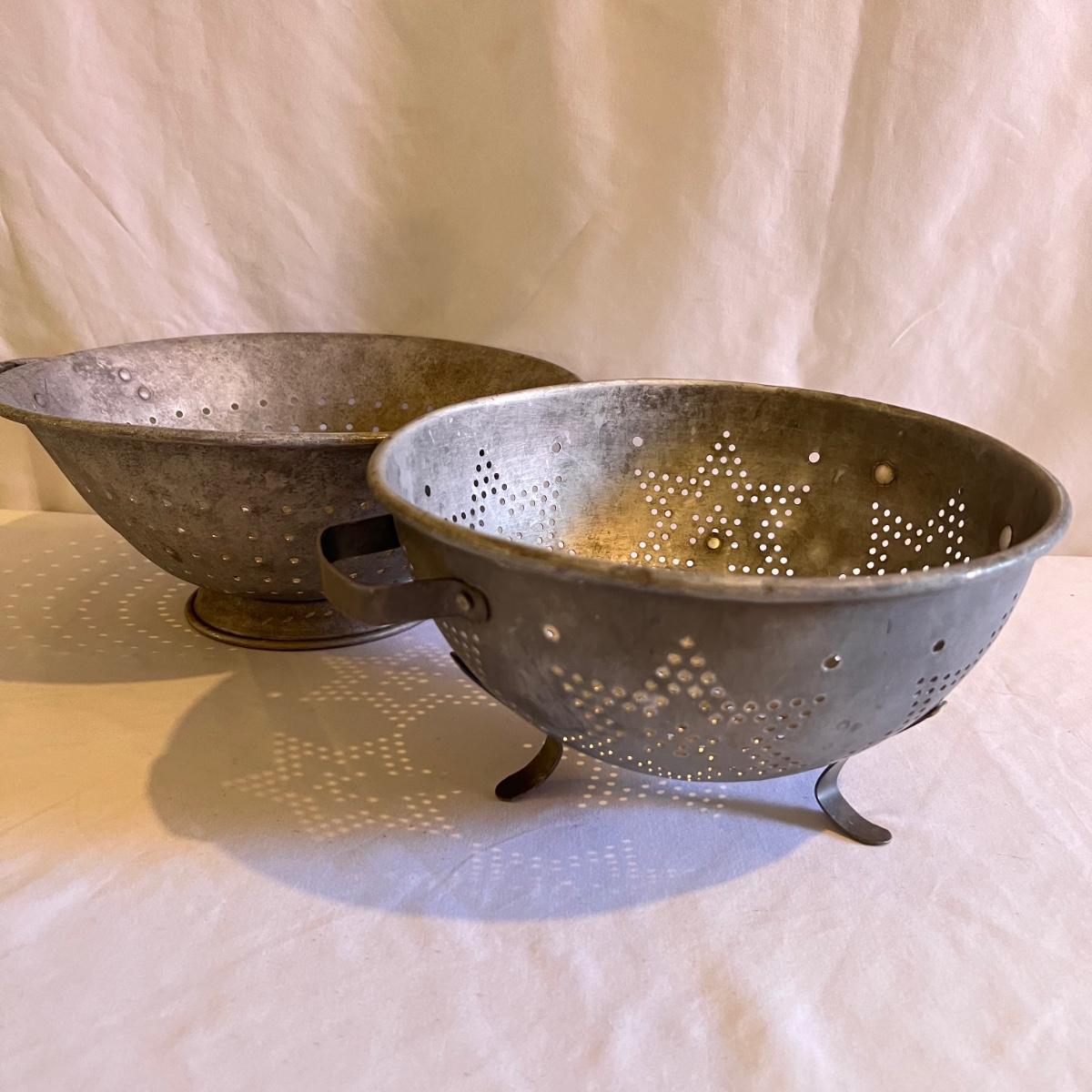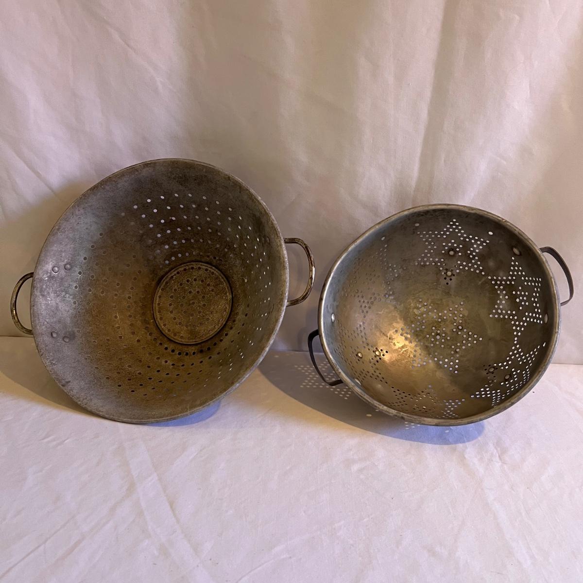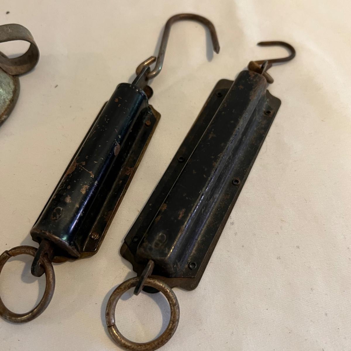 Nine items all with some age to them. The two spring balance scales are Central Scientific from Chicago and a Pocket Balance from Germany. Largest colander measures 12”D x 5”H.