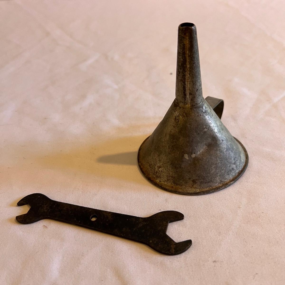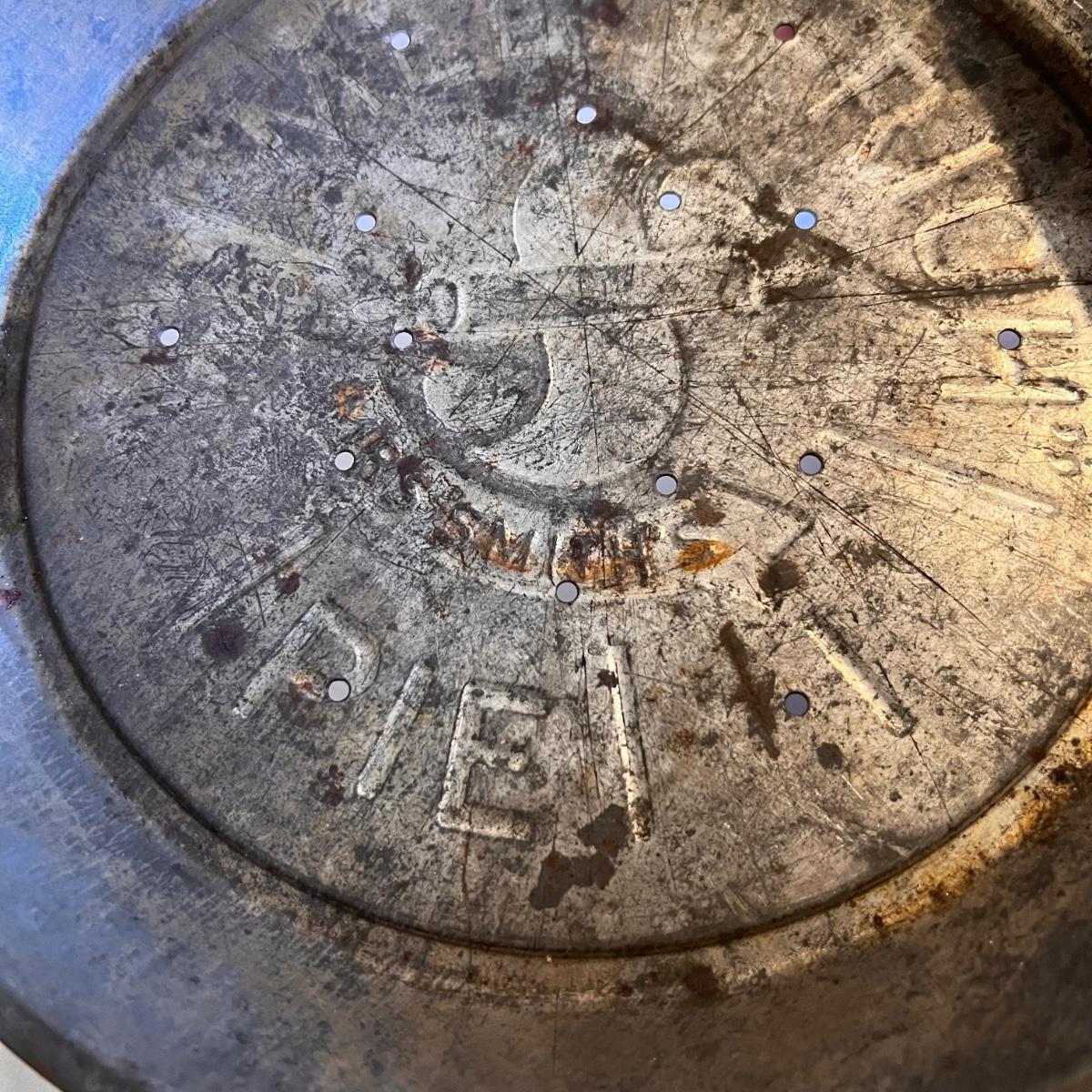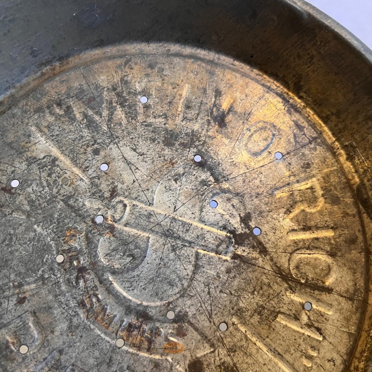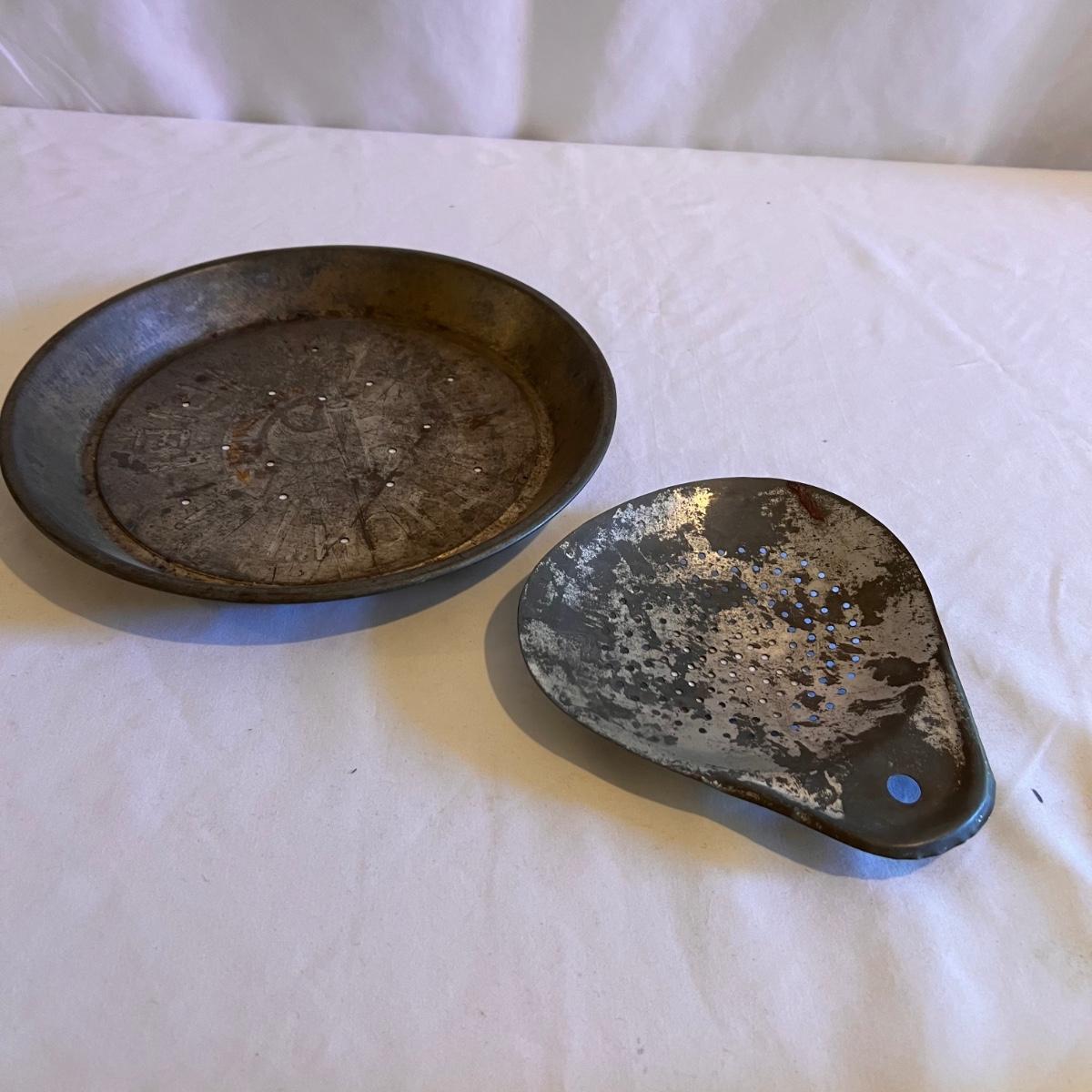 Nine items all with some age to them. The two spring balance scales are Central Scientific from Chicago and a Pocket Balance from Germany. Largest colander measures 12”D x 5”H.