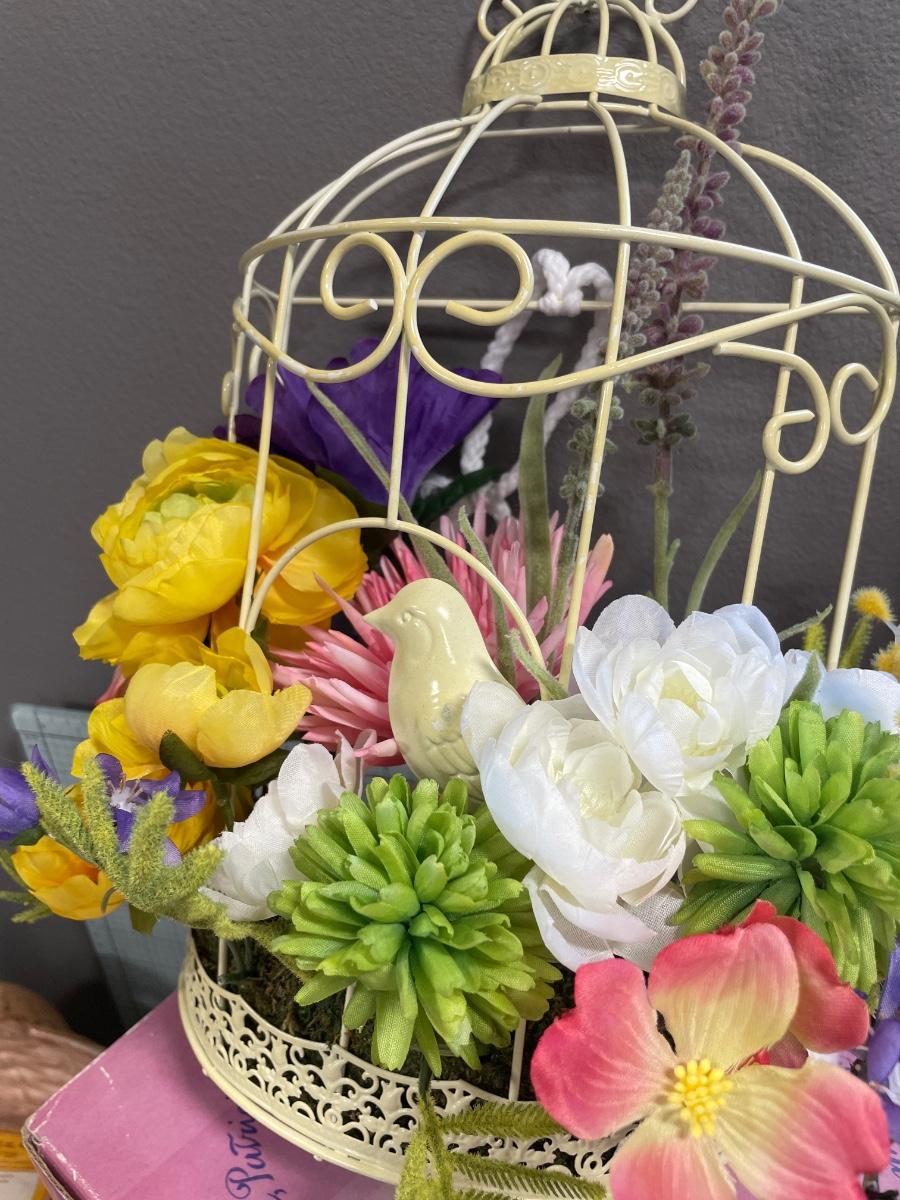 Faux birdhouse with faux flowers