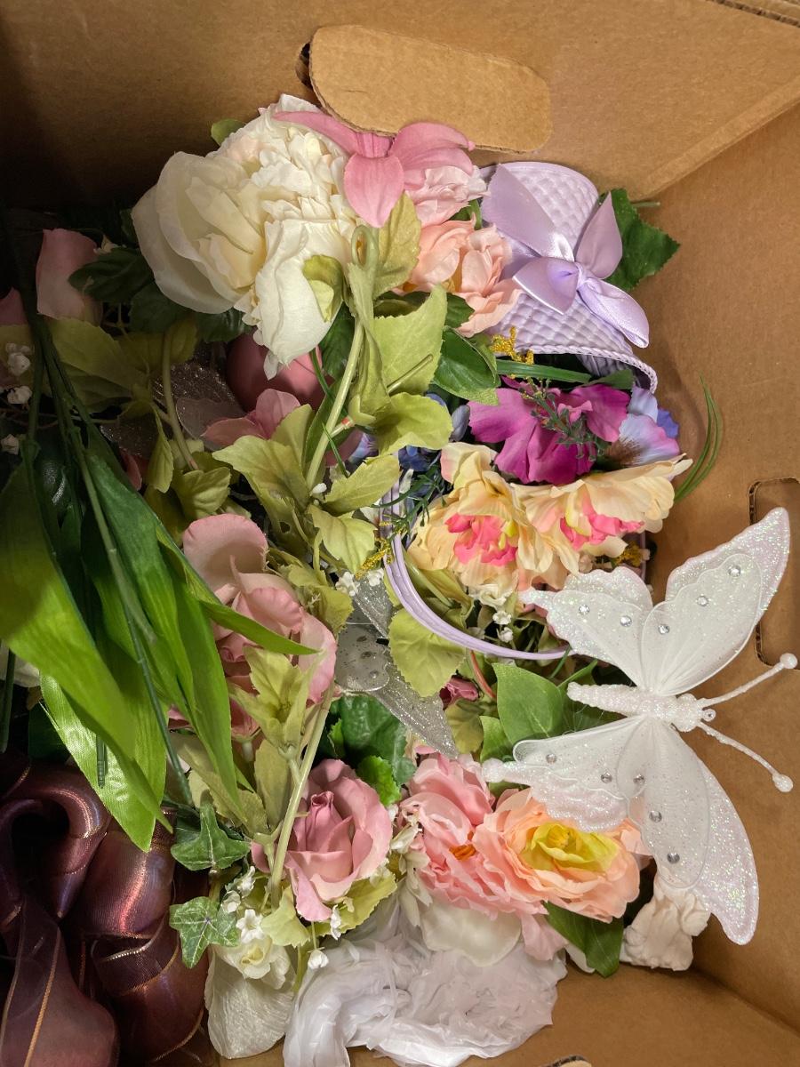 Box of decorative flowers and more