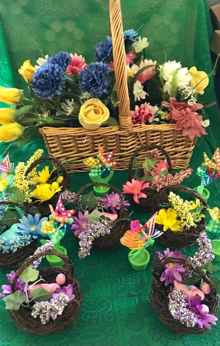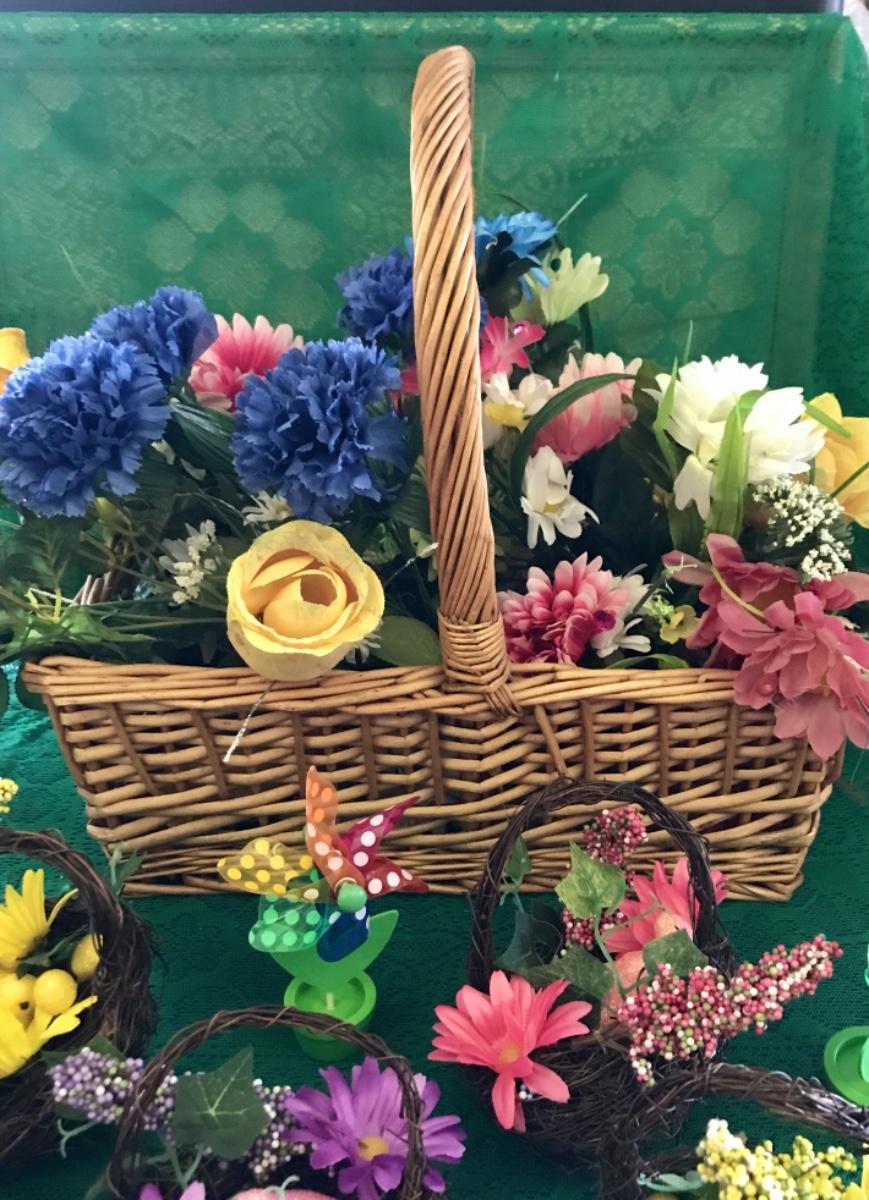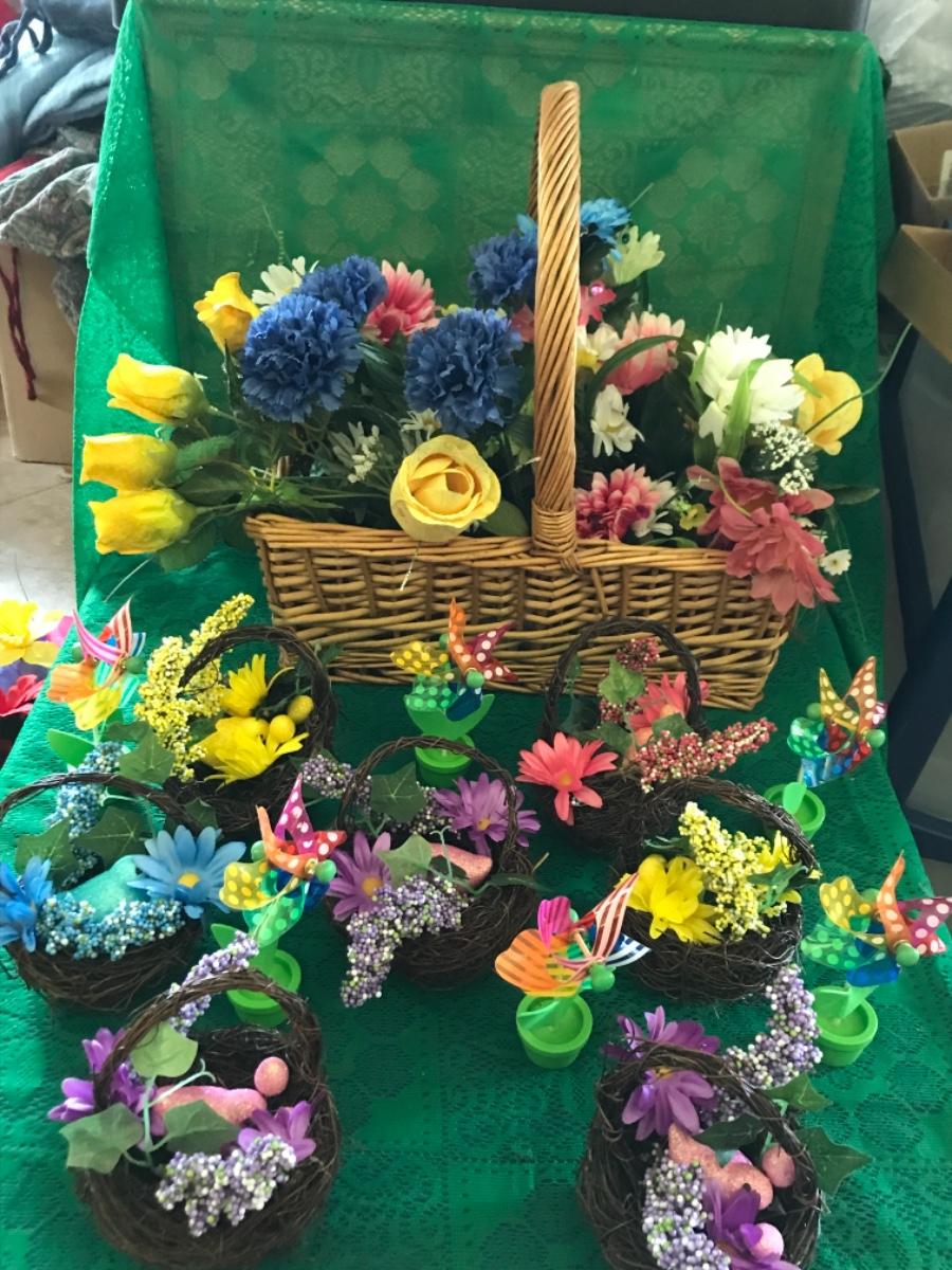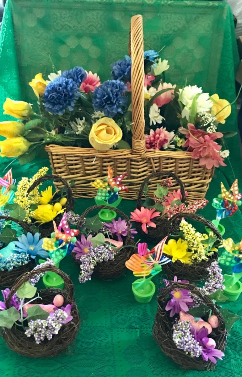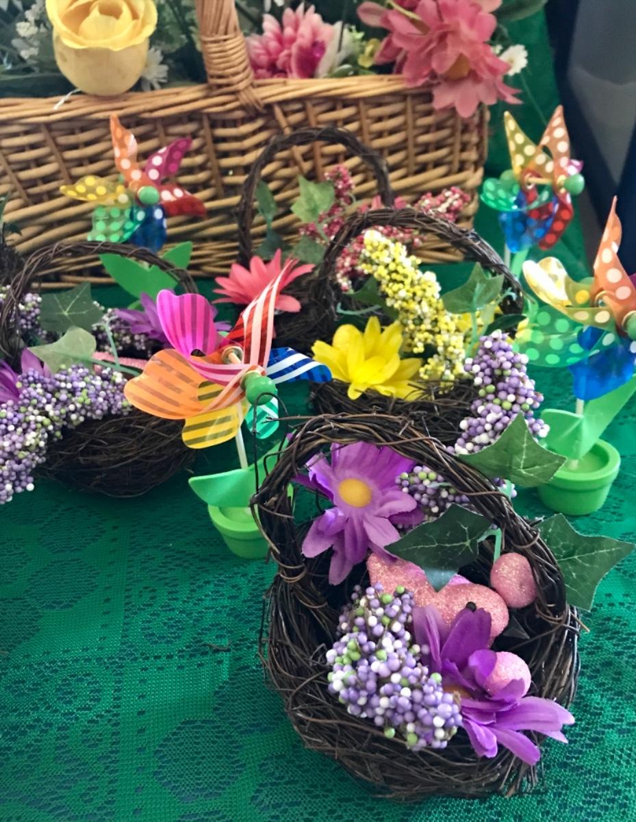 Spring Floral Table Decor Lot: baskets, flowers, pinwheels, etc