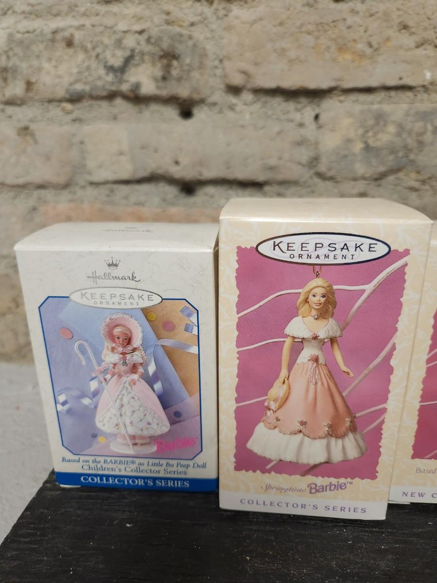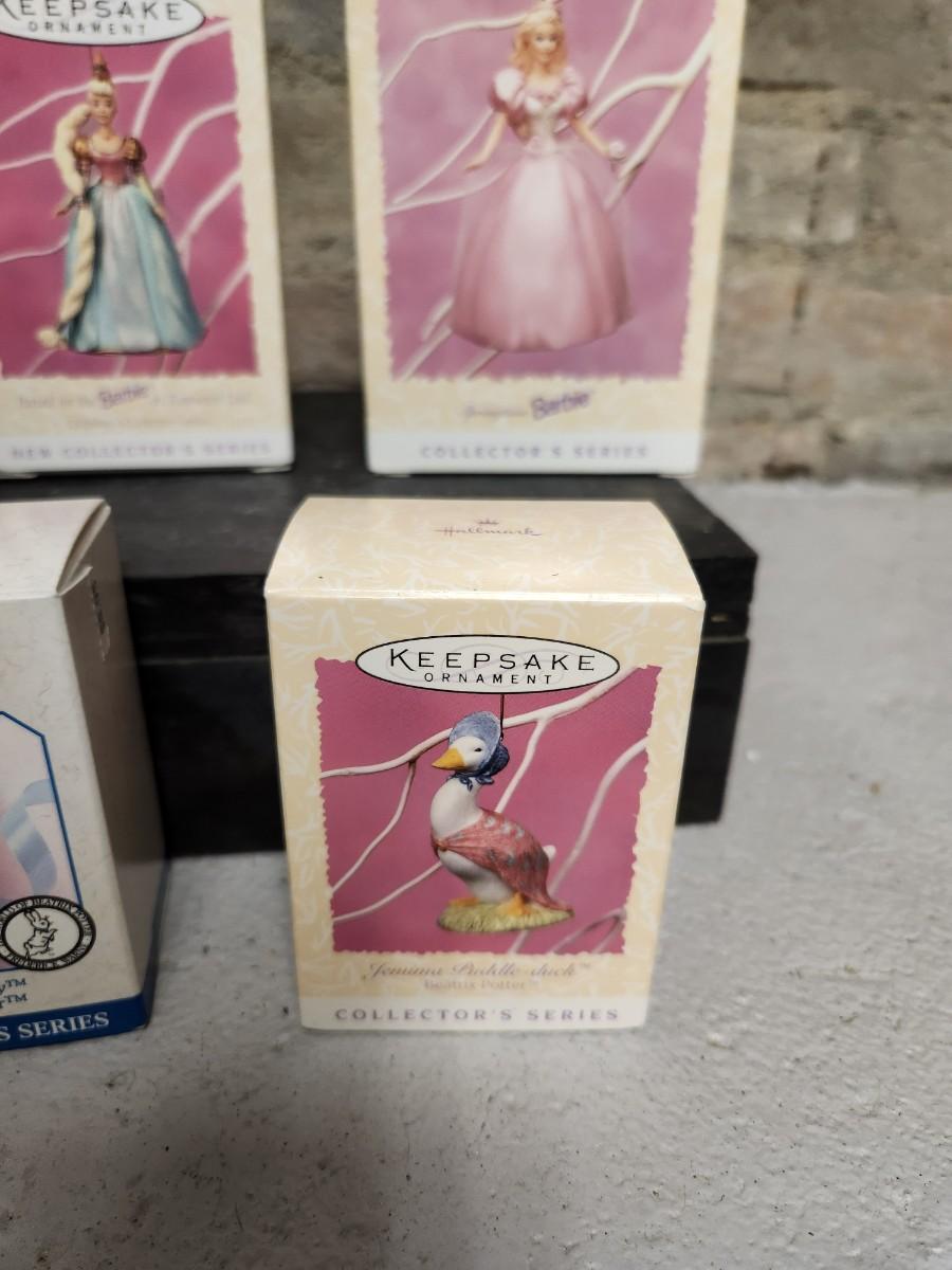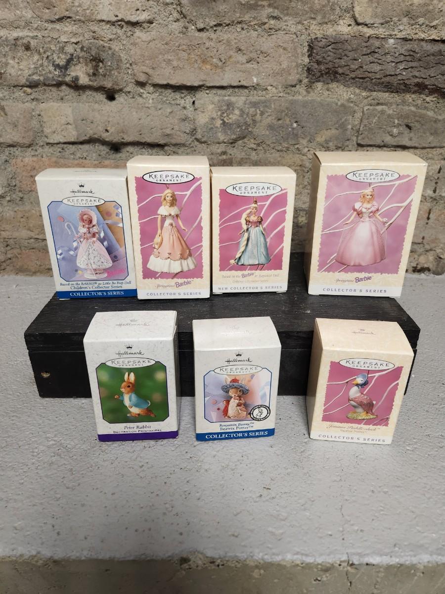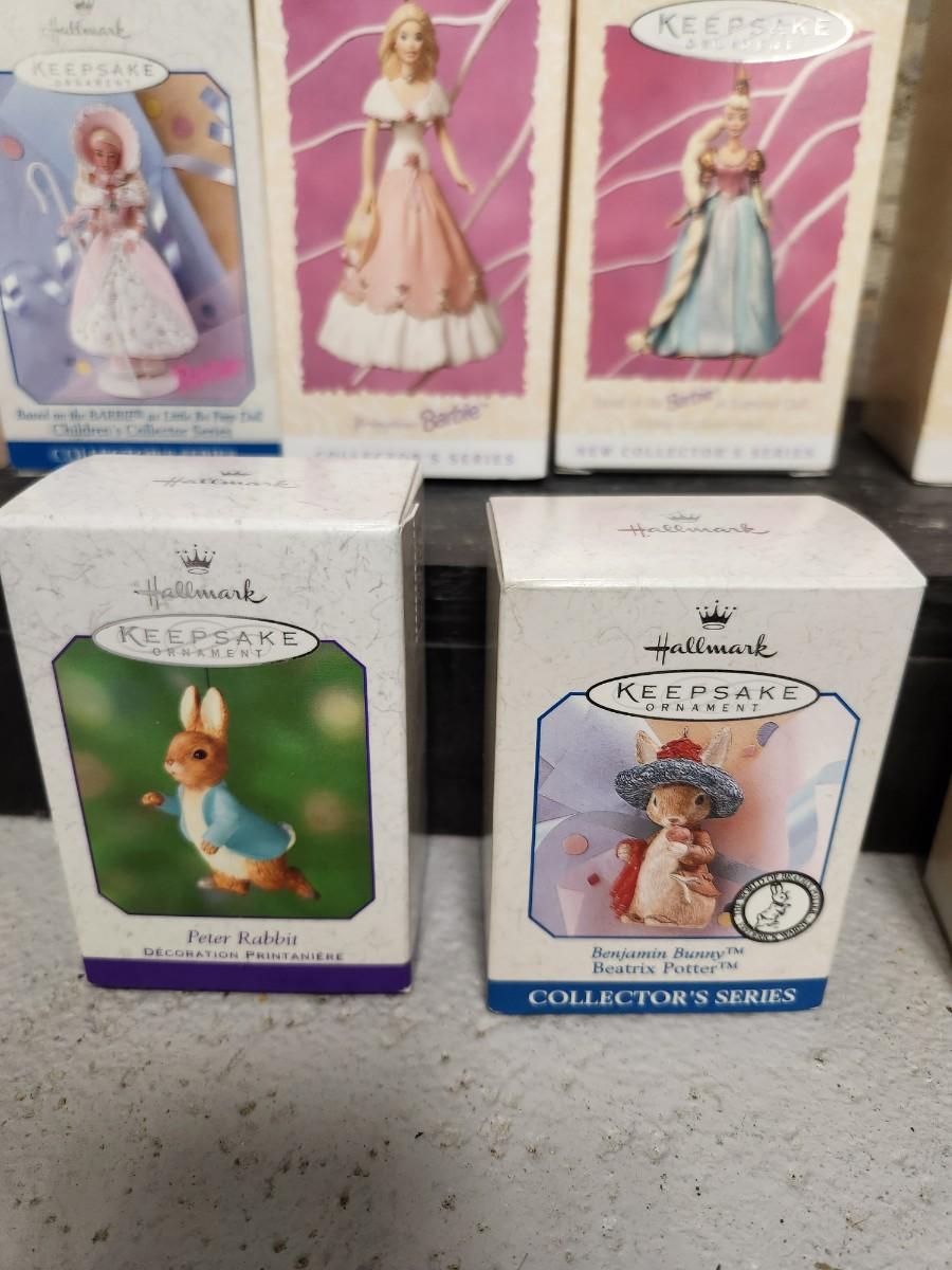 7 NIB Hallmark spring ornaments. Never been opened. Barbie and Peter Rabbit lot
