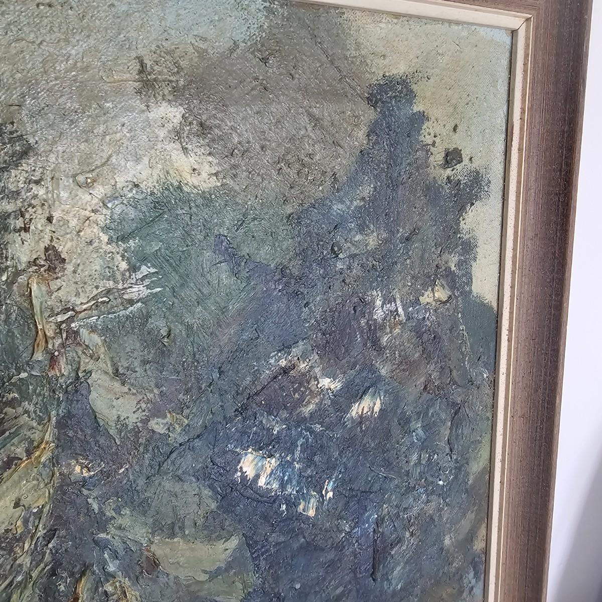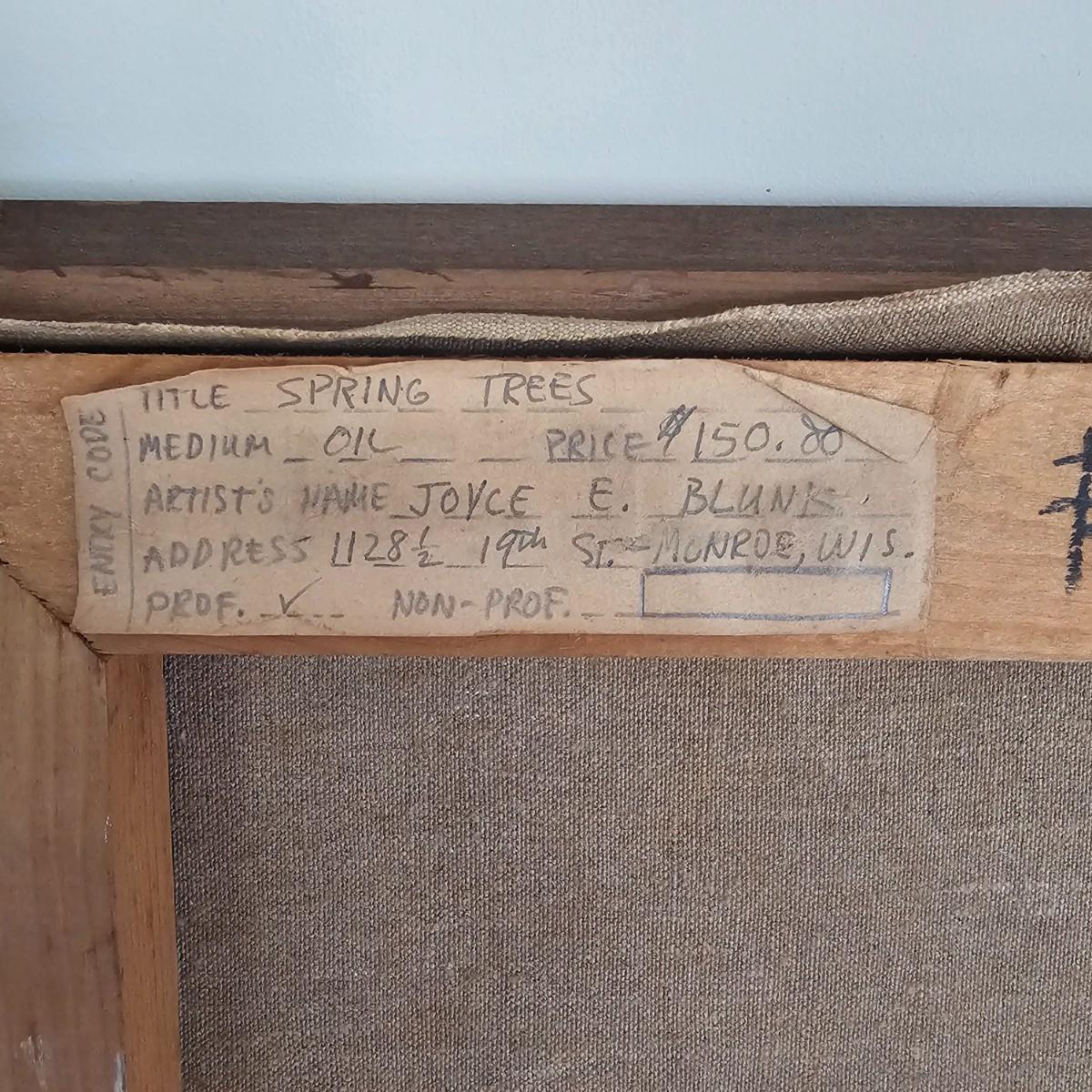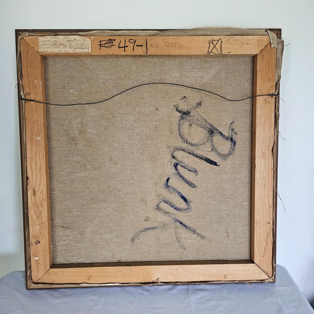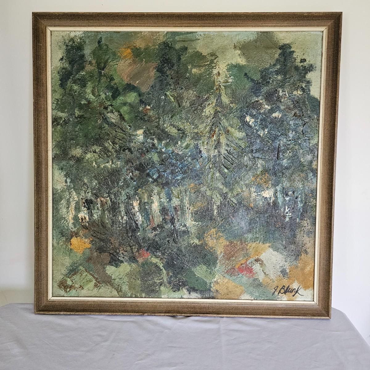 Impressionist style oil on canvas by J. Blunk entitled 'Spring Trees'. Wood framed, measures 26" x 26"H. Signed and info on tag on back of frame. Bold use of color and brush strokes to simulate light. See photos for details. Shipping available. Shipping can be costly. We suggest contacting our preferred local shipping provider, Postage Express, with dimensions and getting an estimate before bidding: (828) 255-9250 or shipping@postageexpressnc.com.