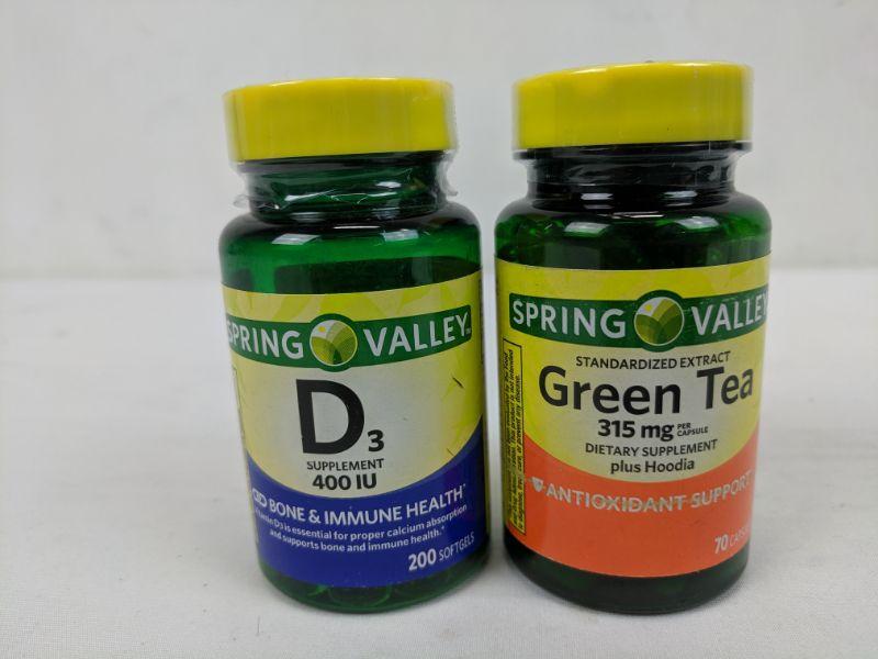Spring Valley Pills: D3 Supplements 400 IU 20 Softgels & Green Tea 315 MG 70 Capsules - New
