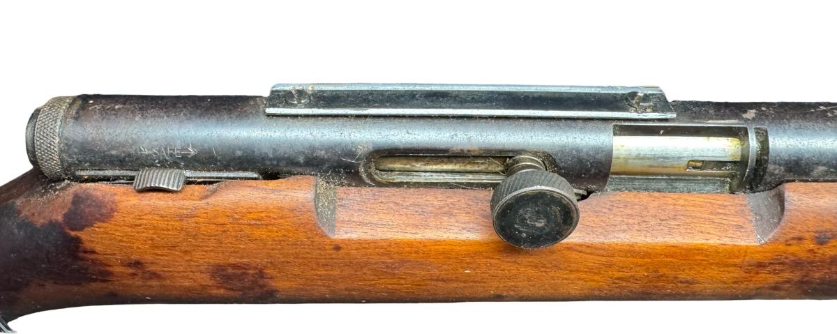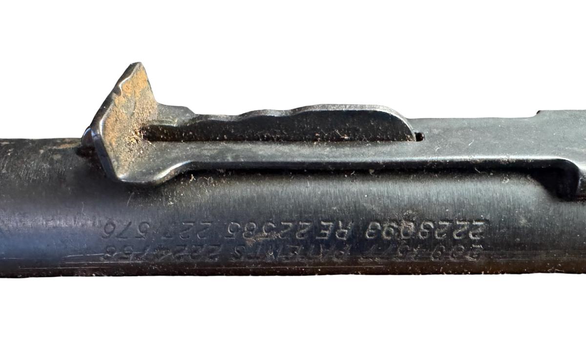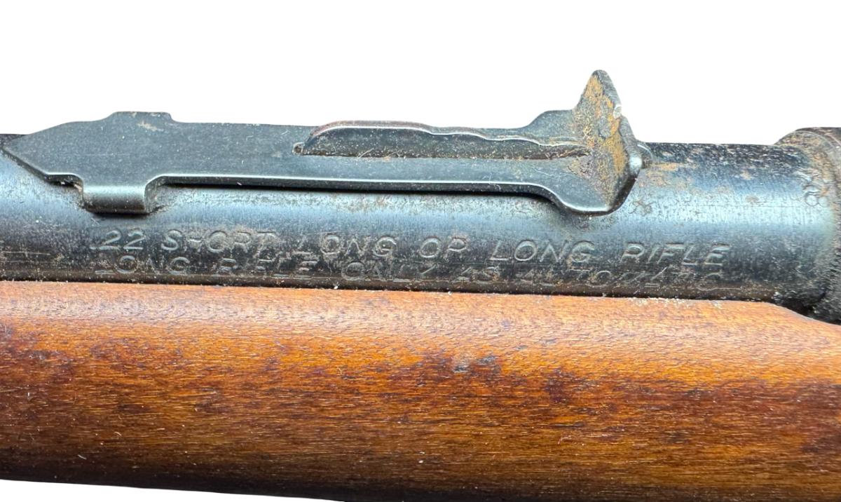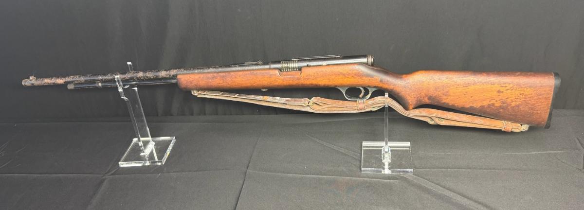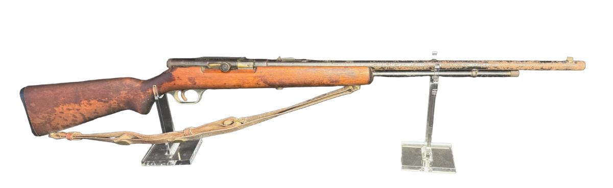 This is a tube fed .22 caliber semi-automatic rifle. It fires .22 short, long, and long rifle. It comes with swivels and shoulder strap. It has a hardwood stock. Barrel length is 24 inches. Overall length is 44 inches. There is no visible serial number. Not tested. [KD]