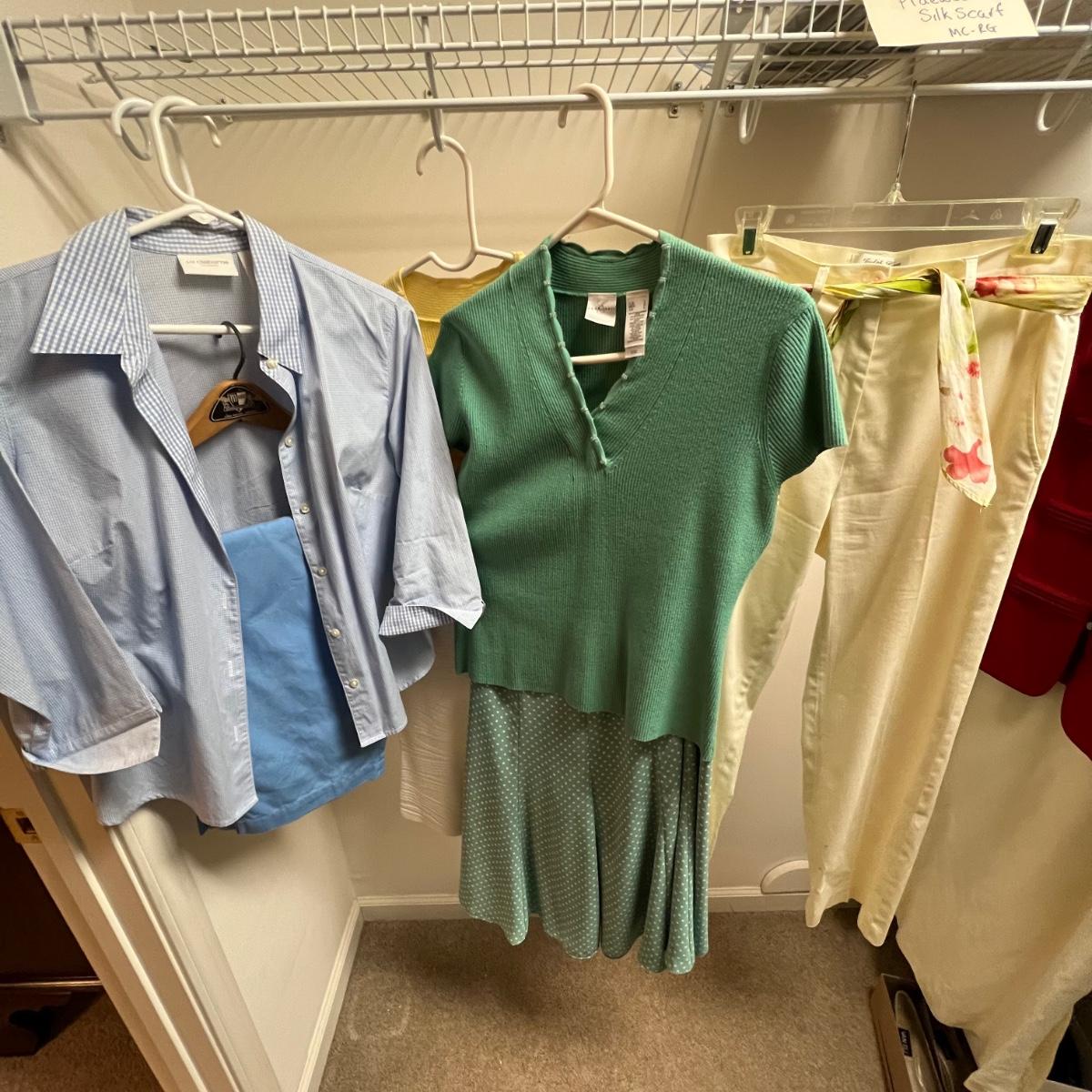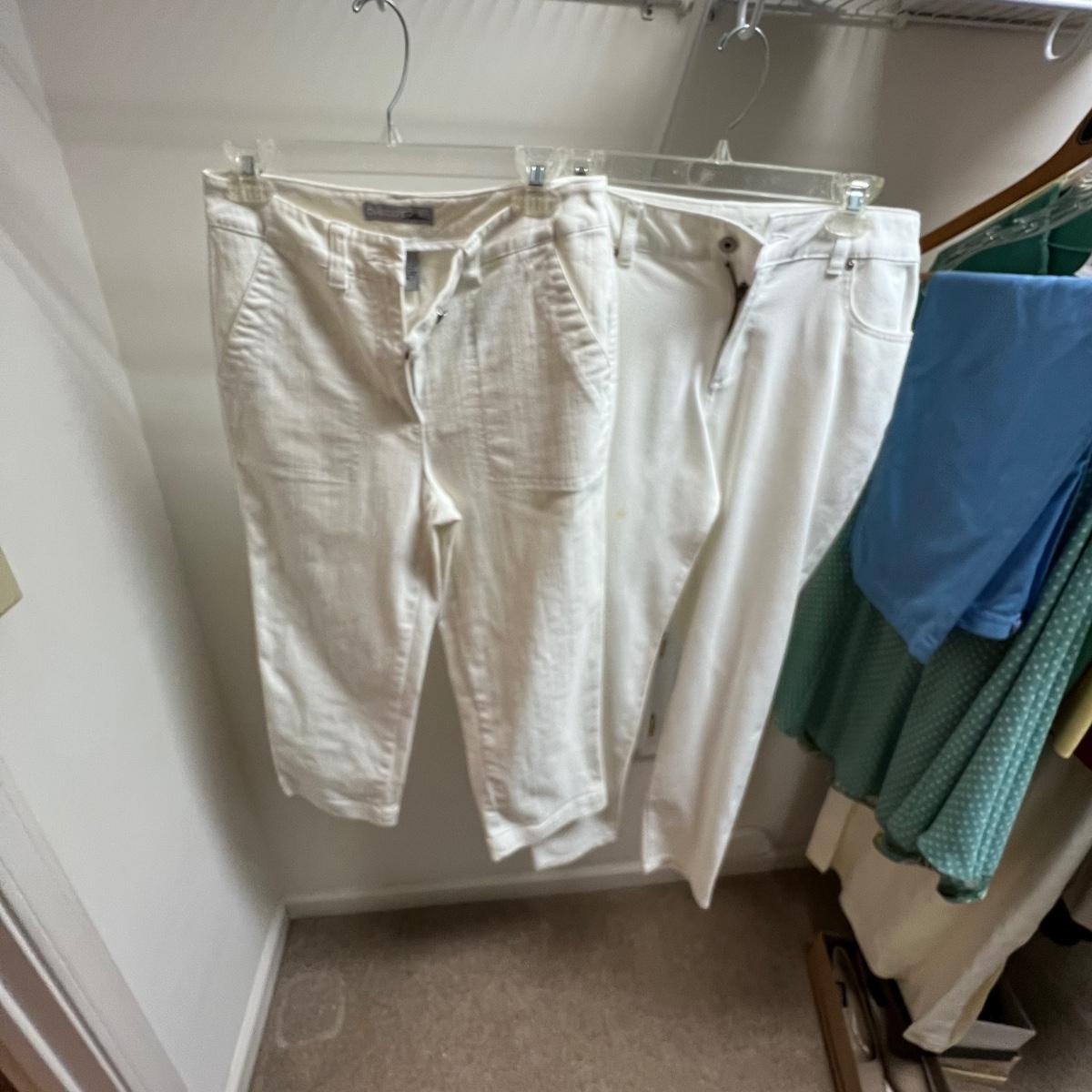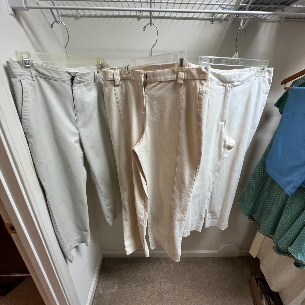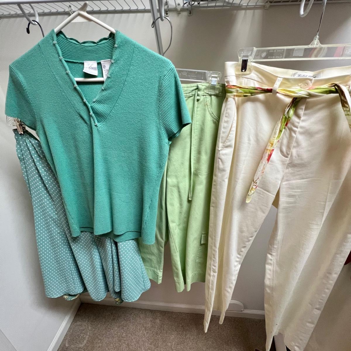 A nice assortment of lightweight garments that includes a skirt, nine pairs of pants and six tops. See images for brand names and sizes. Note one pair of white pants has a small stain and the blue pants have some fading on the waistline.