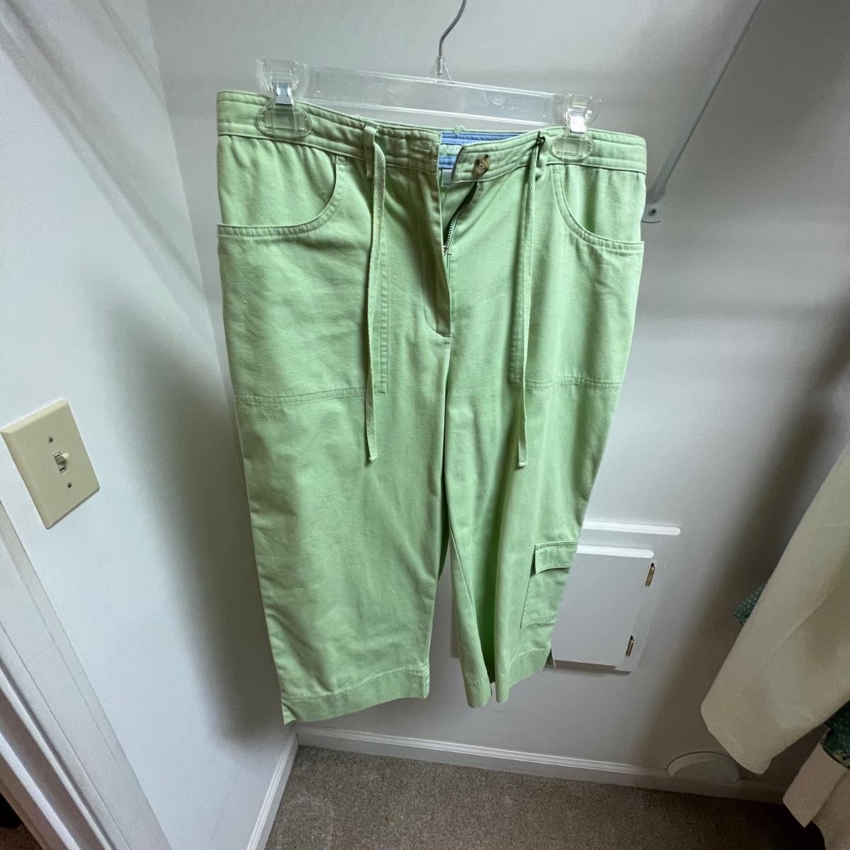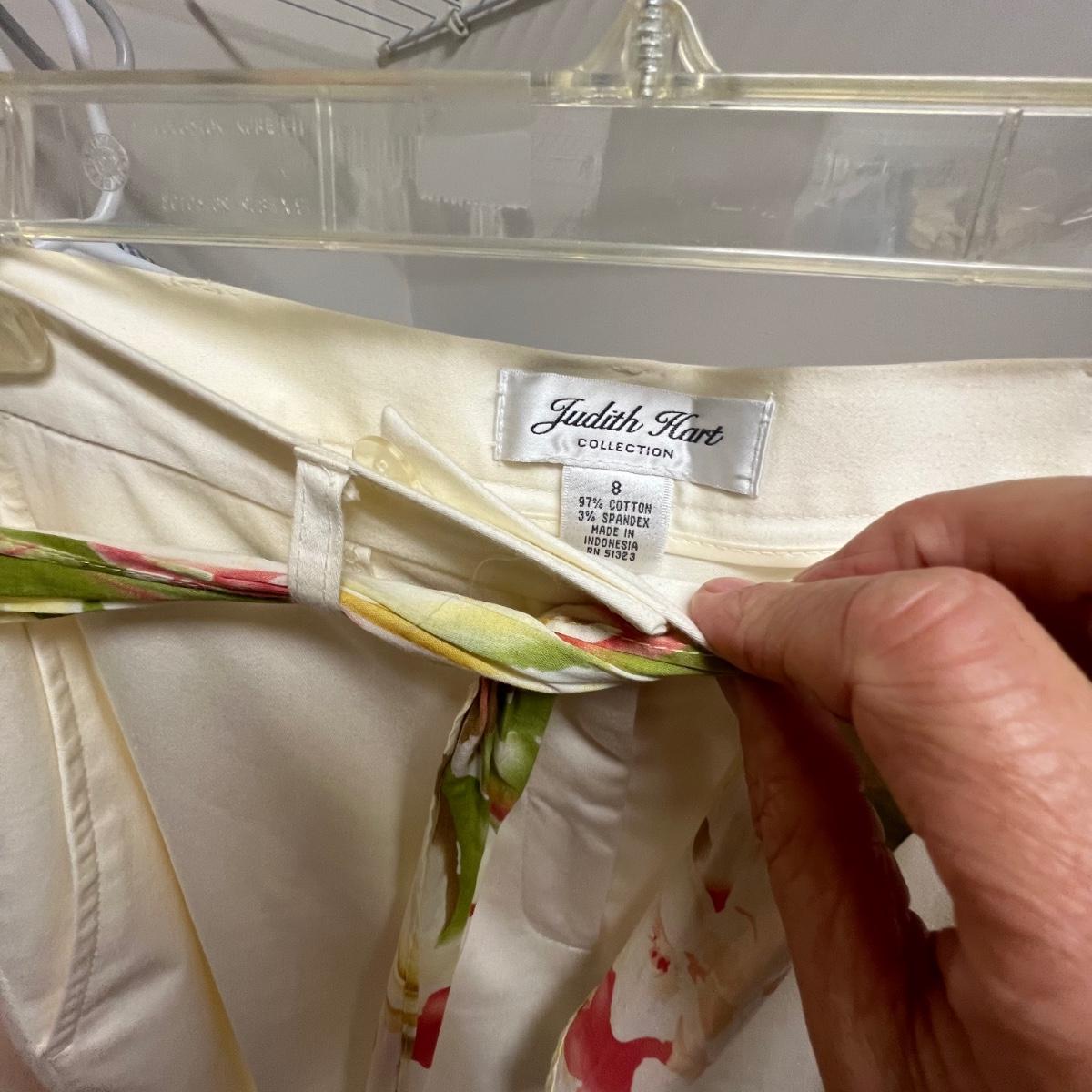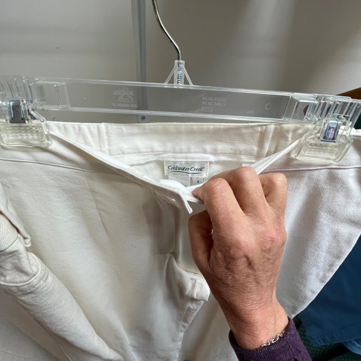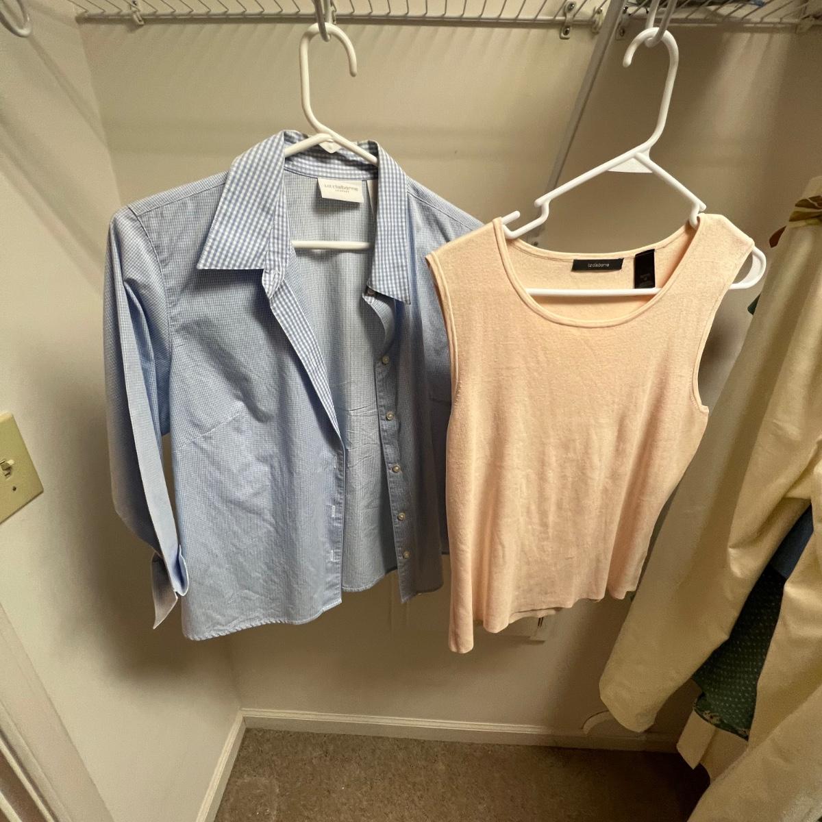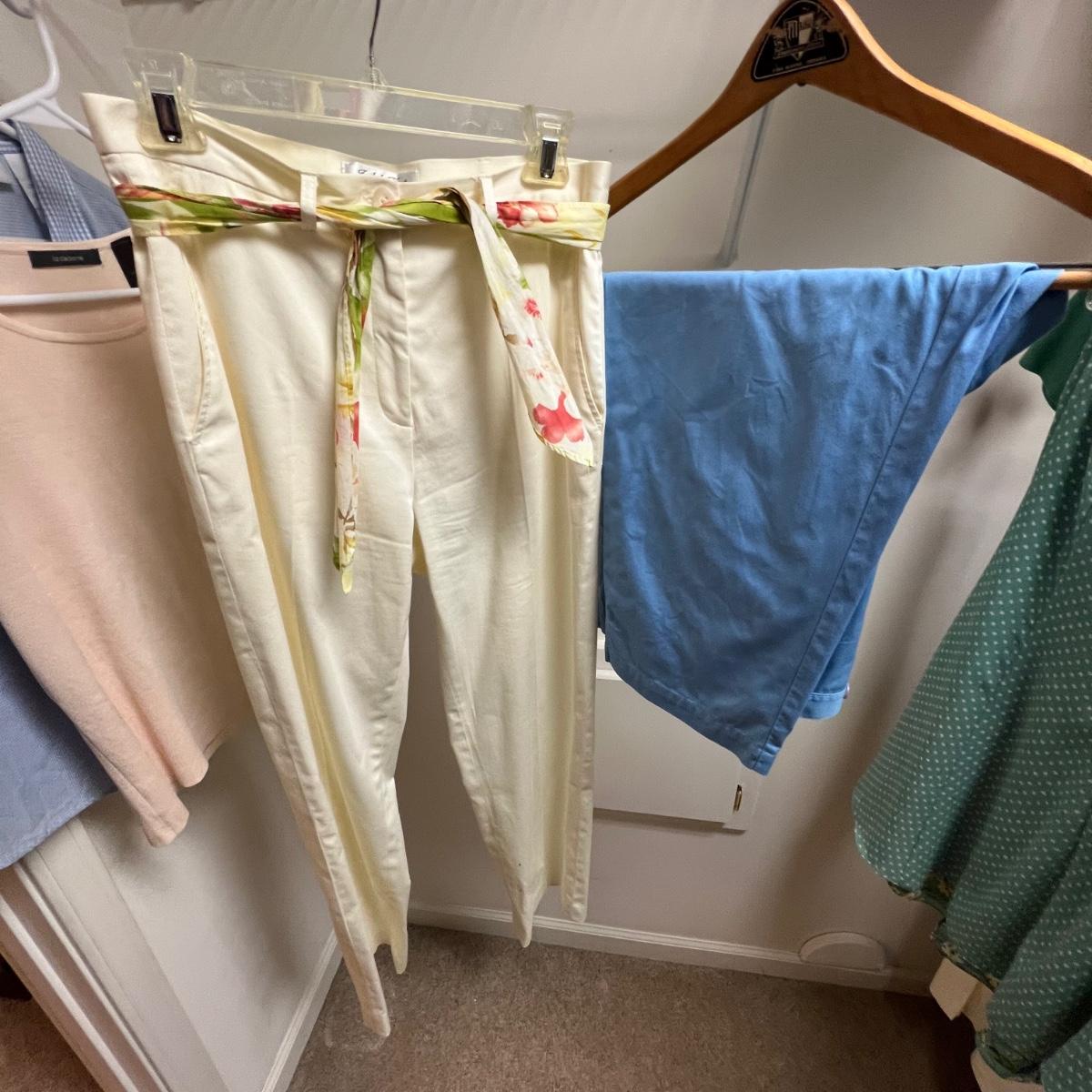A nice assortment of lightweight garments that includes a skirt, nine pairs of pants and six tops. See images for brand names and sizes. Note one pair of white pants has a small stain and the blue pants have some fading on the waistline.
