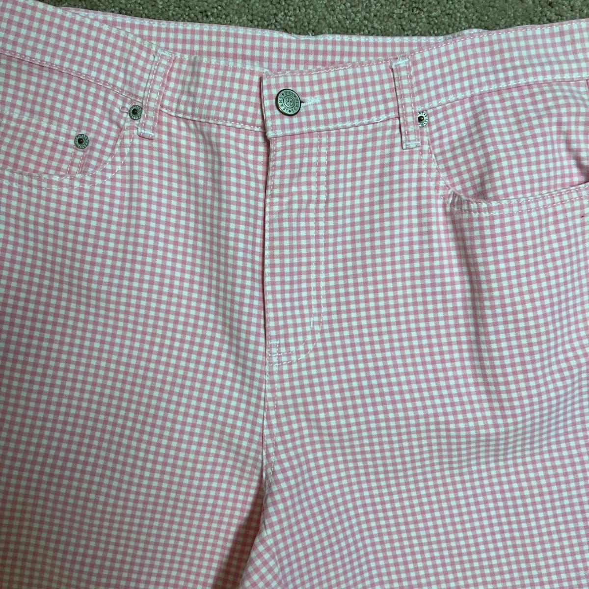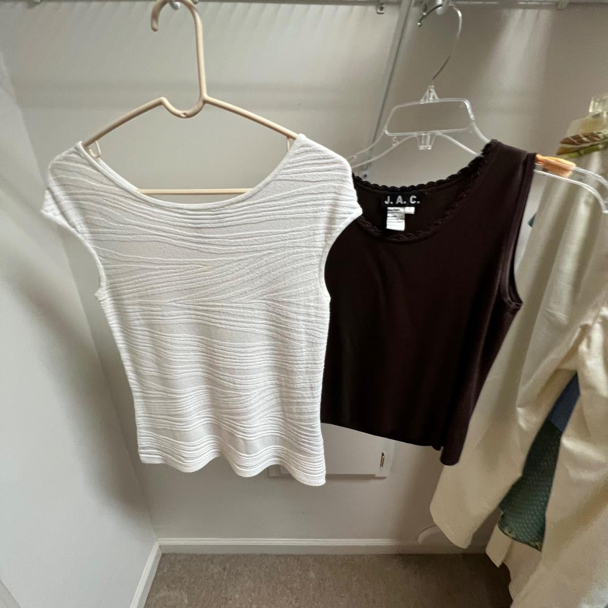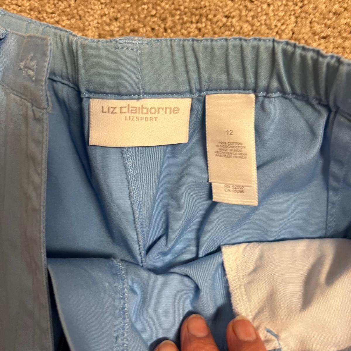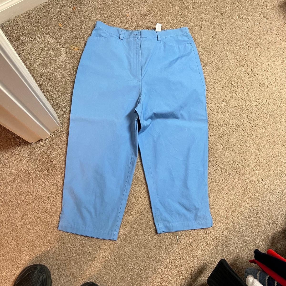 A nice assortment of lightweight garments that includes a skirt, nine pairs of pants and six tops. See images for brand names and sizes. Note one pair of white pants has a small stain and the blue pants have some fading on the waistline.