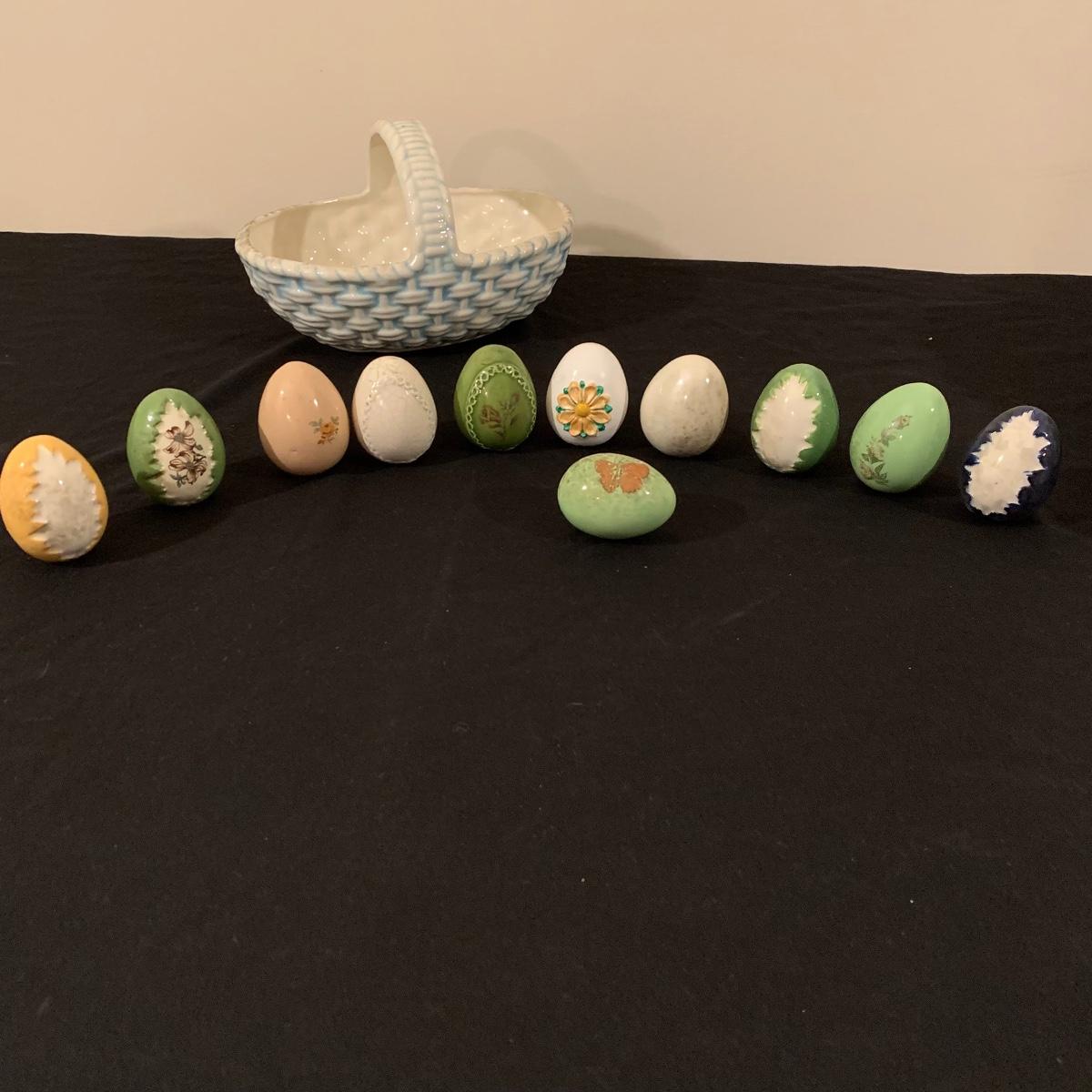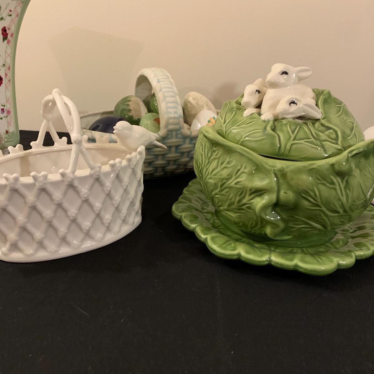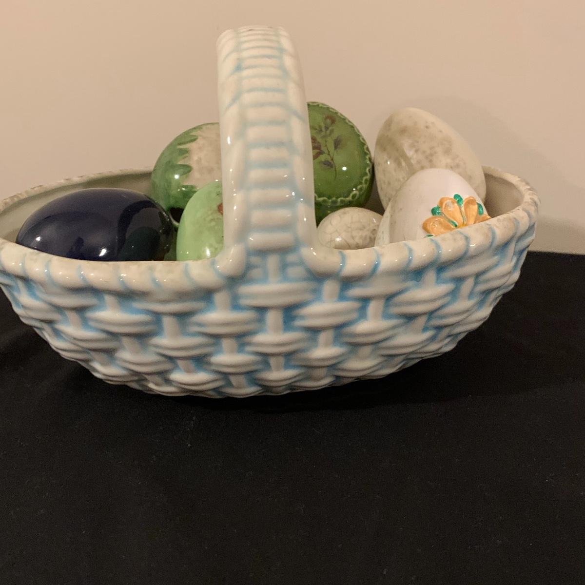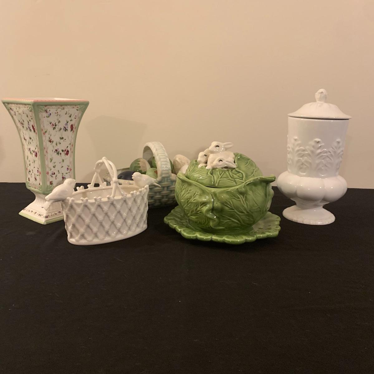 Five sections of Springtime feel make up this lot of two baskets, one vase and two canisters. Tall white canister has a seal lid and is the tallest piece at 9.5” tall. All decorated eggs in teal/white basket are also ceramic. Shipping available.