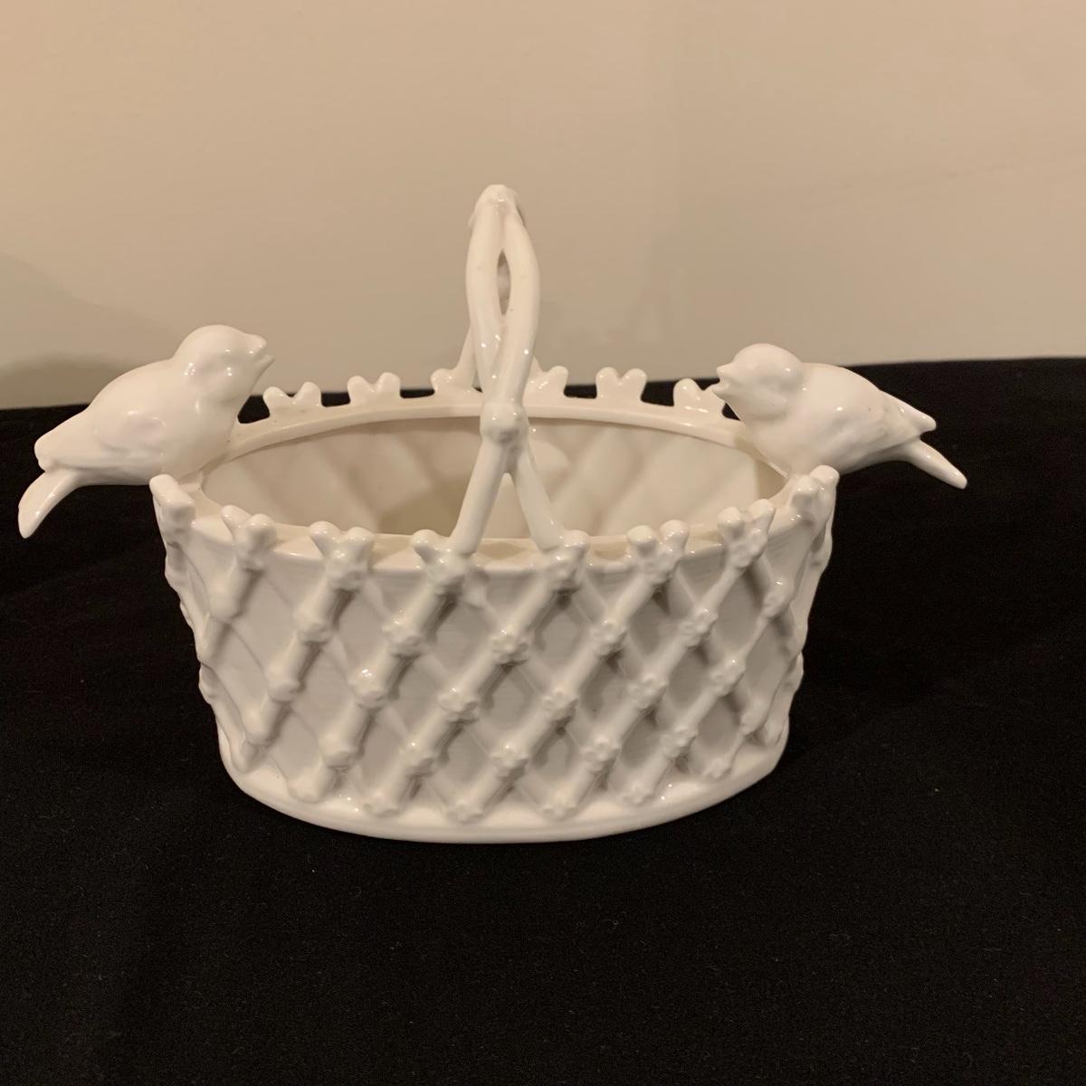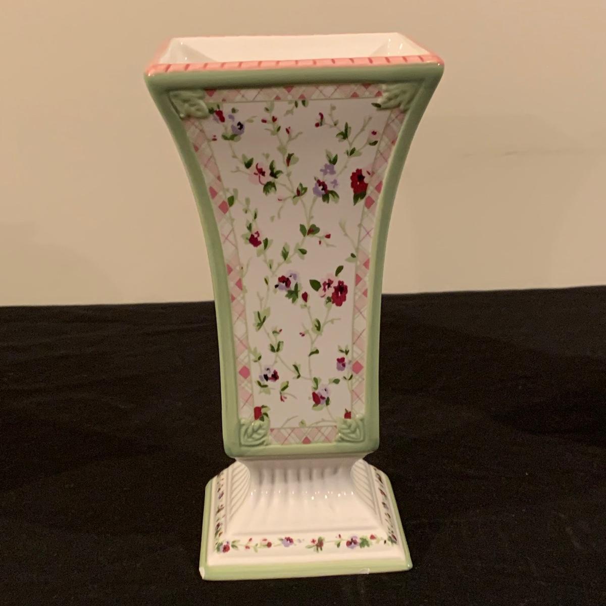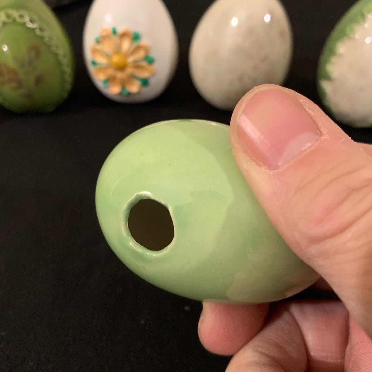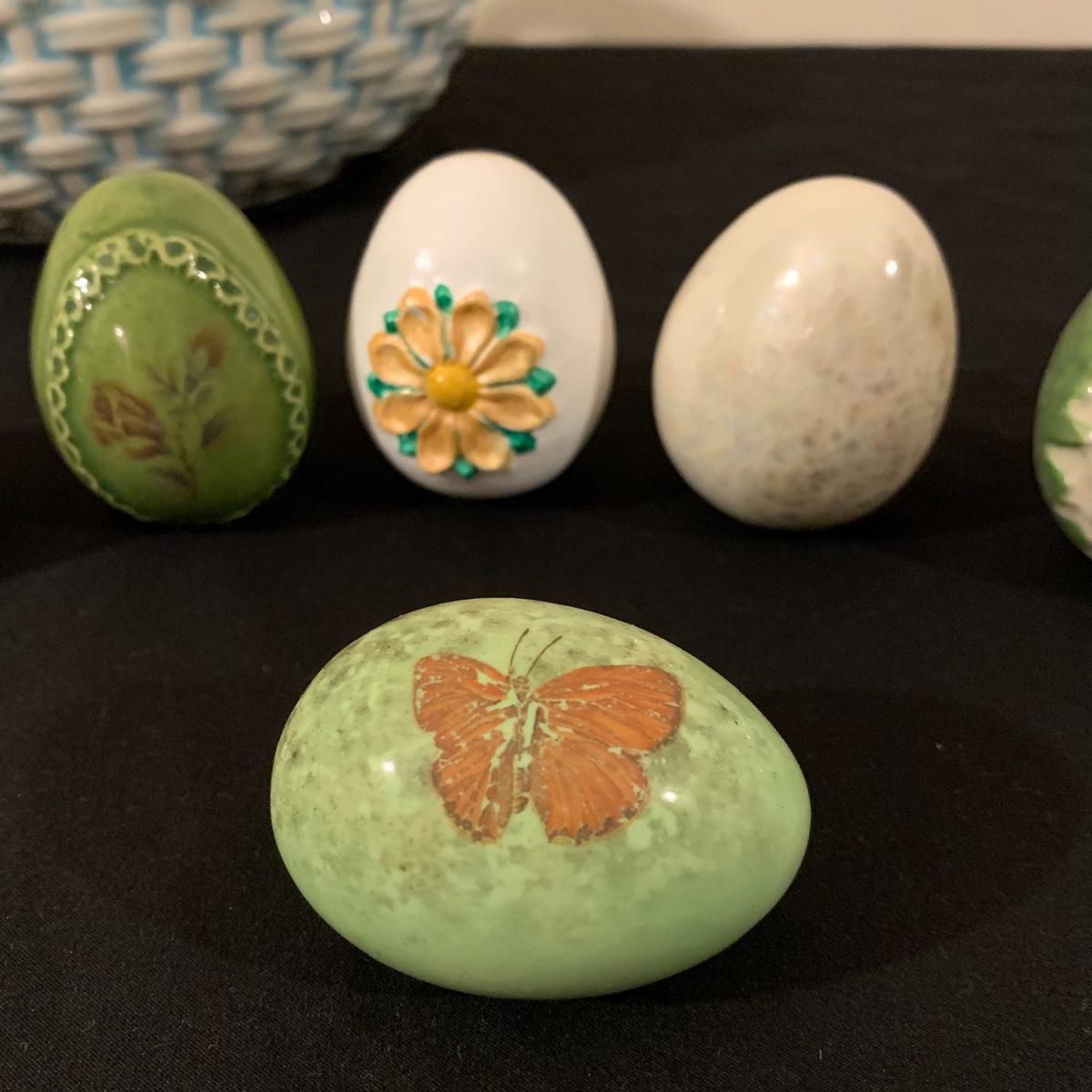 Five sections of Springtime feel make up this lot of two baskets, one vase and two canisters. Tall white canister has a seal lid and is the tallest piece at 9.5” tall. All decorated eggs in teal/white basket are also ceramic. Shipping available.