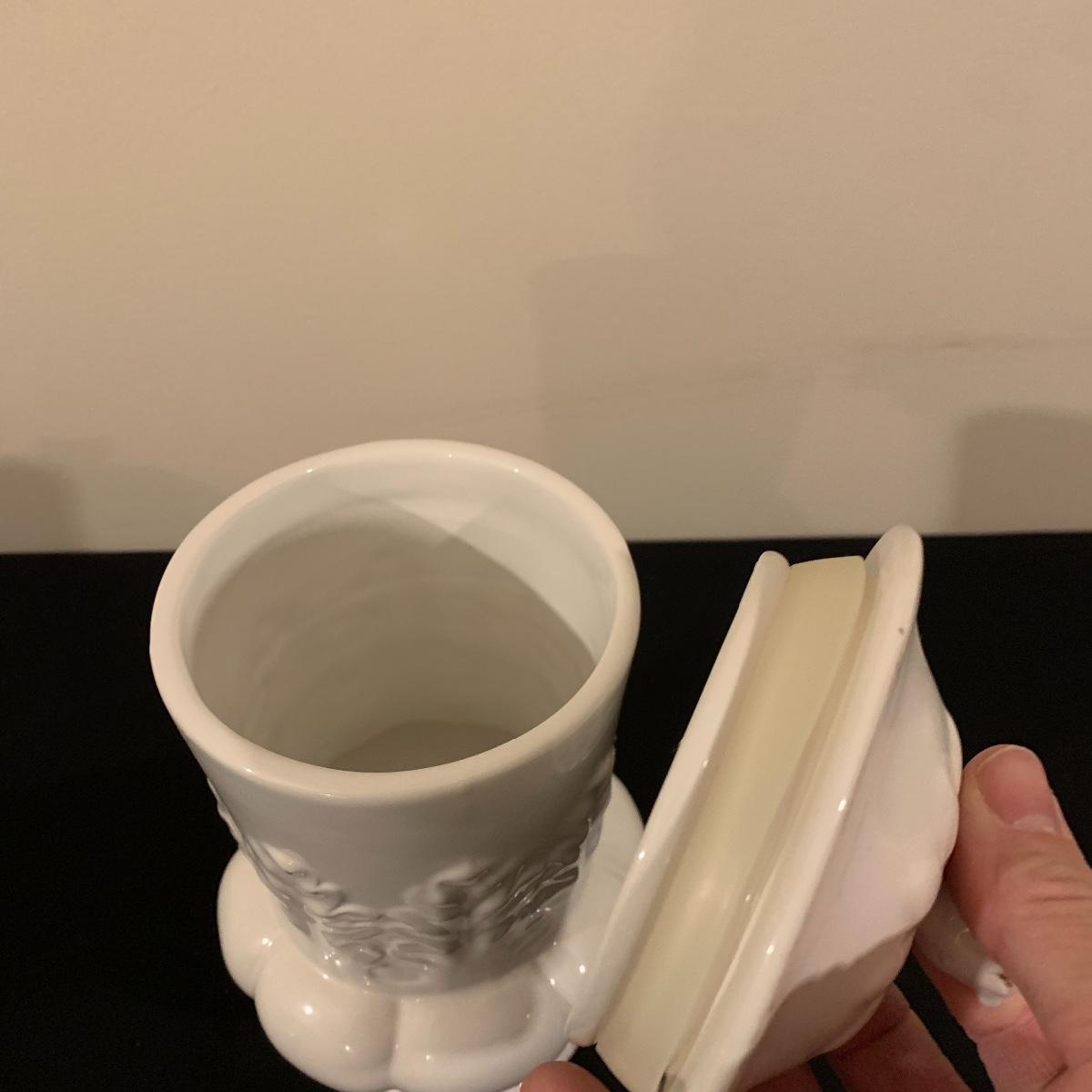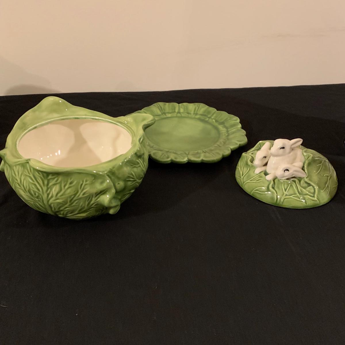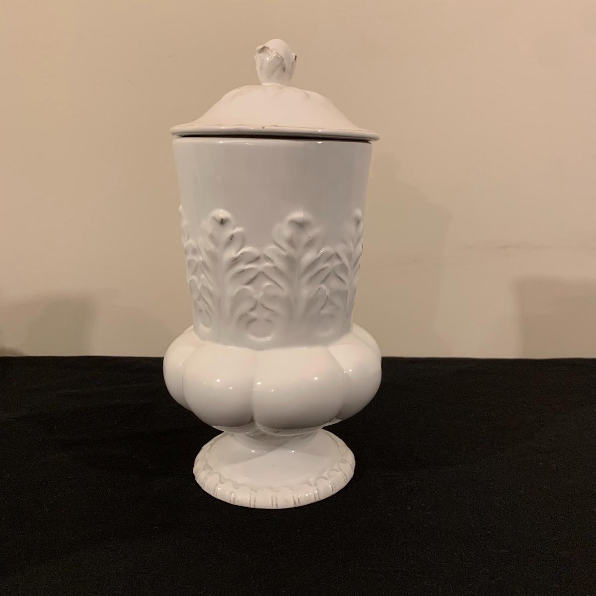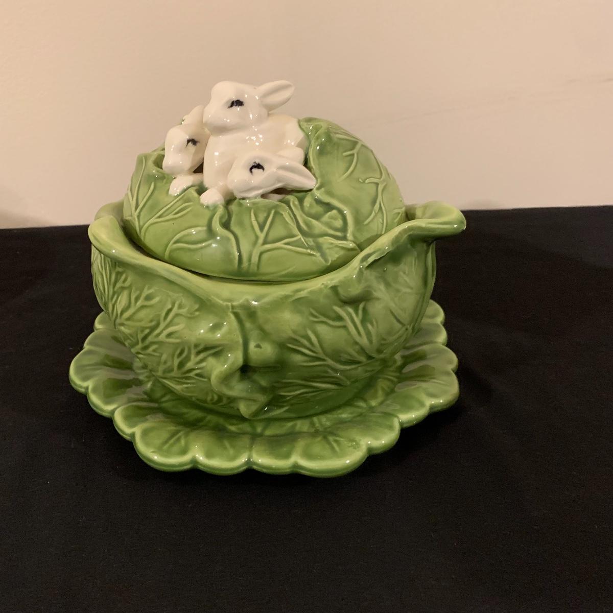 Five sections of Springtime feel make up this lot of two baskets, one vase and two canisters. Tall white canister has a seal lid and is the tallest piece at 9.5” tall. All decorated eggs in teal/white basket are also ceramic. Shipping available.