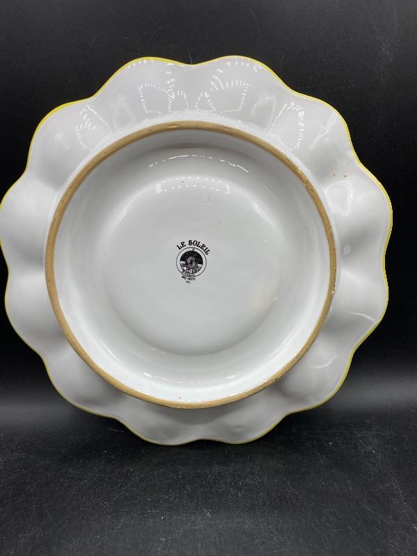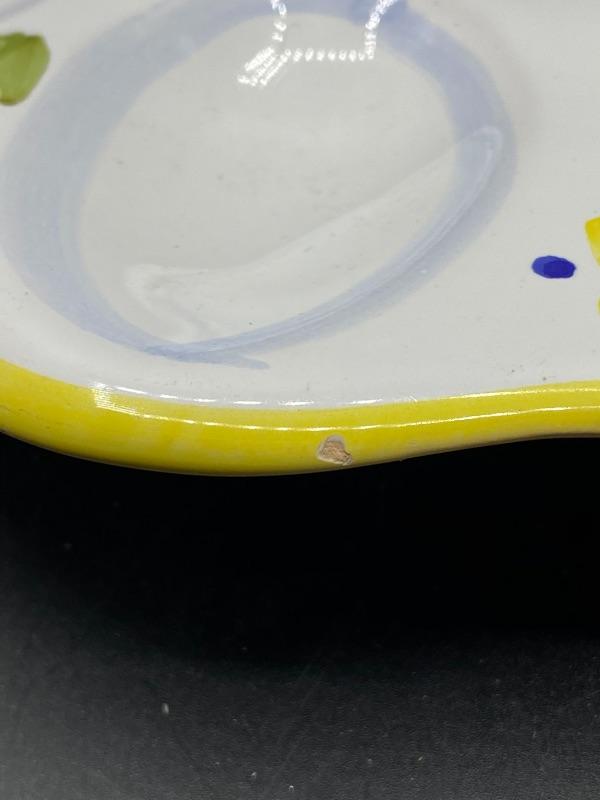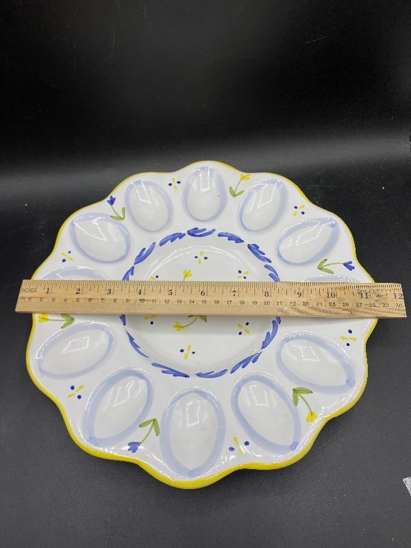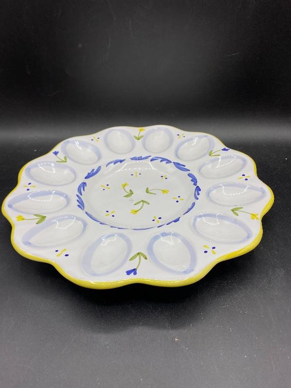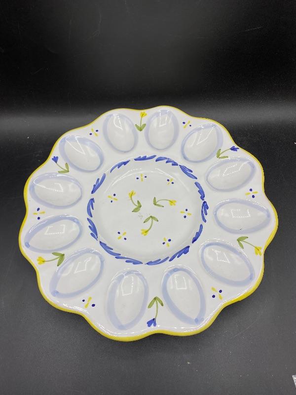 Springtime deviled egg serving plate. Great for any springtime event. Holds 12 eggs. Hand painted, made in Italy. There is a chip along plate bottom edge and rim, both on the same side. Almost 12" size.
