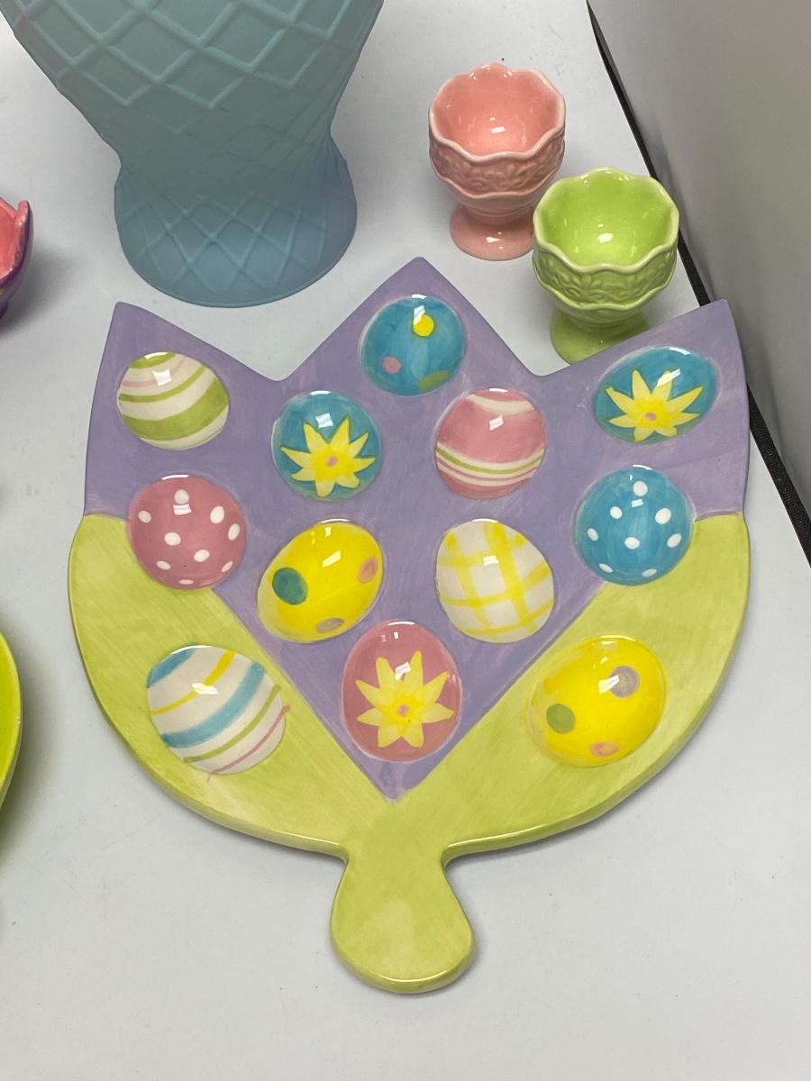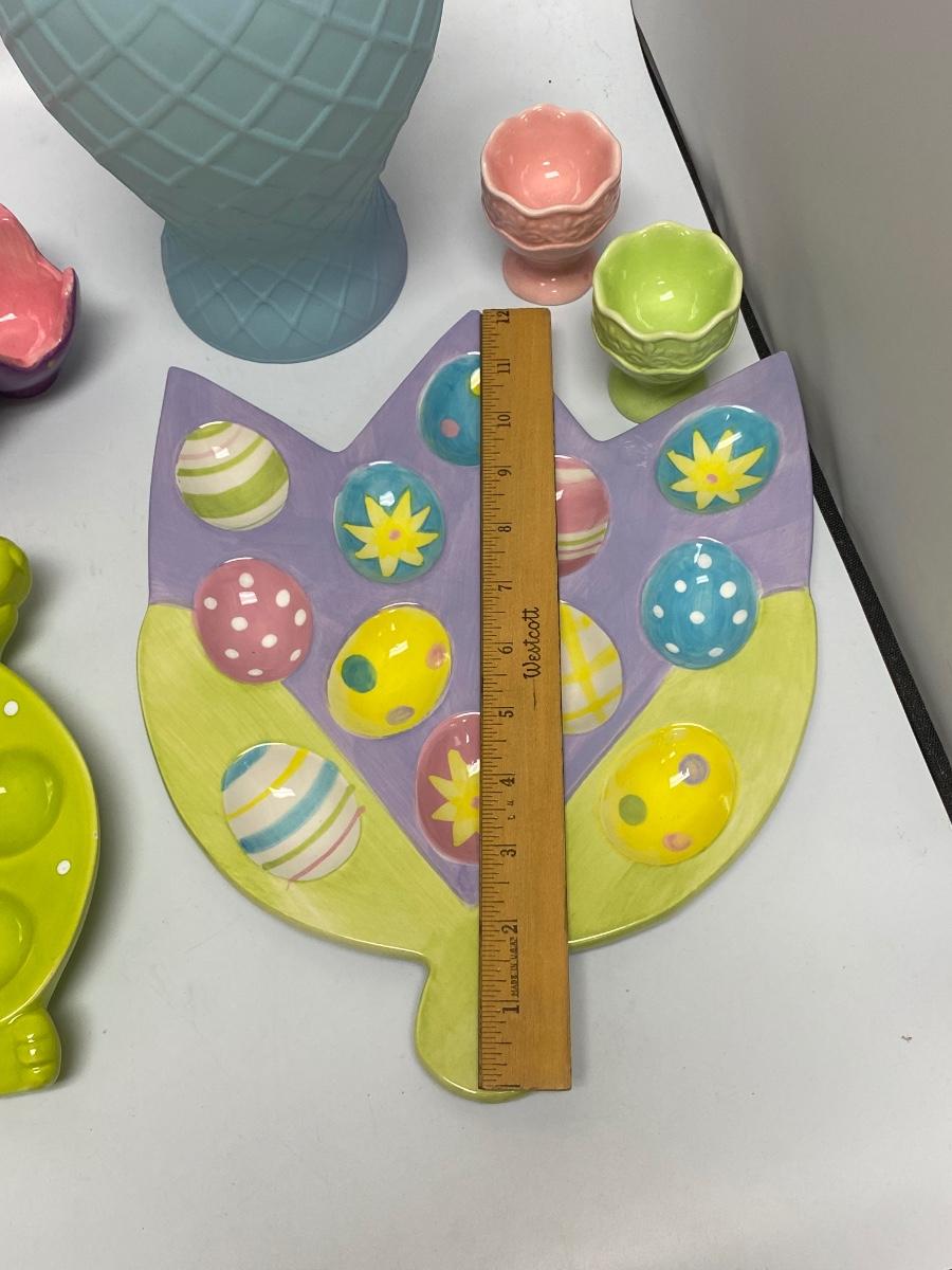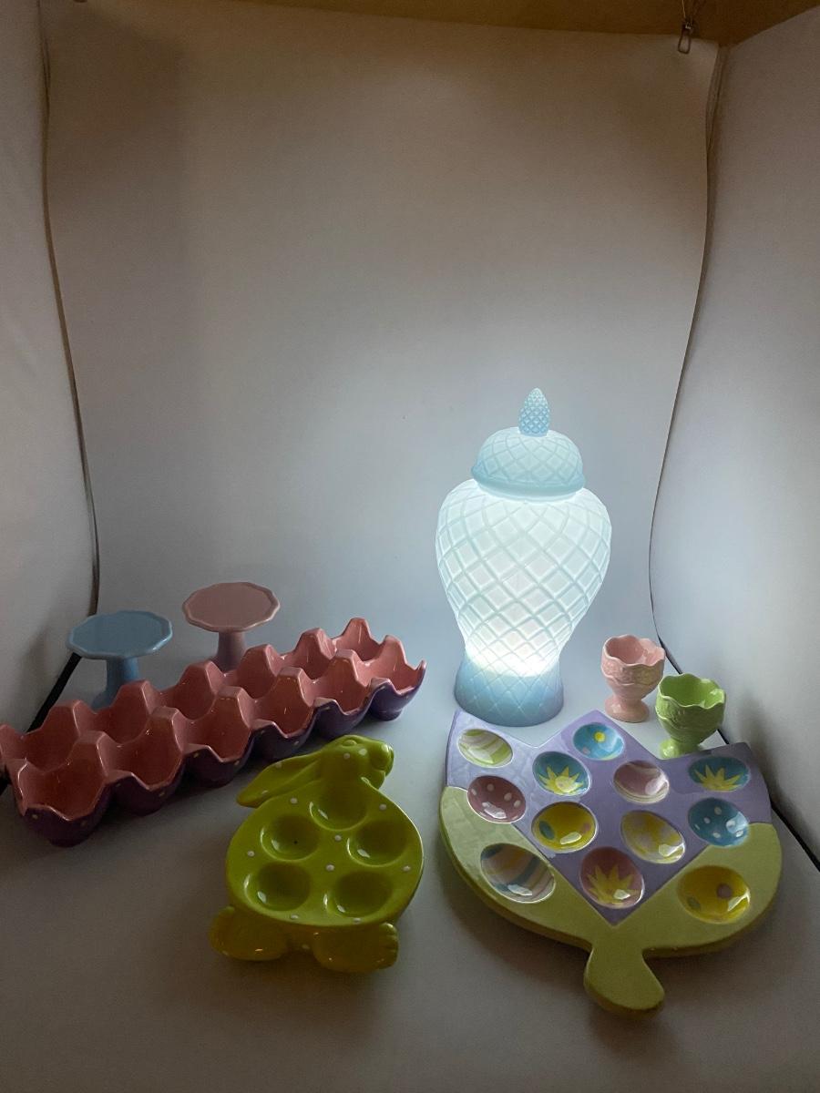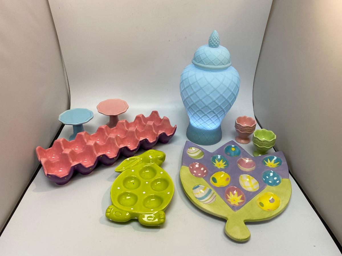Springtime Easter Ceramics Egg Holders Decor. Good condition. The urn lamp lights up and works. Everything is in good used condition, light signs of wear.