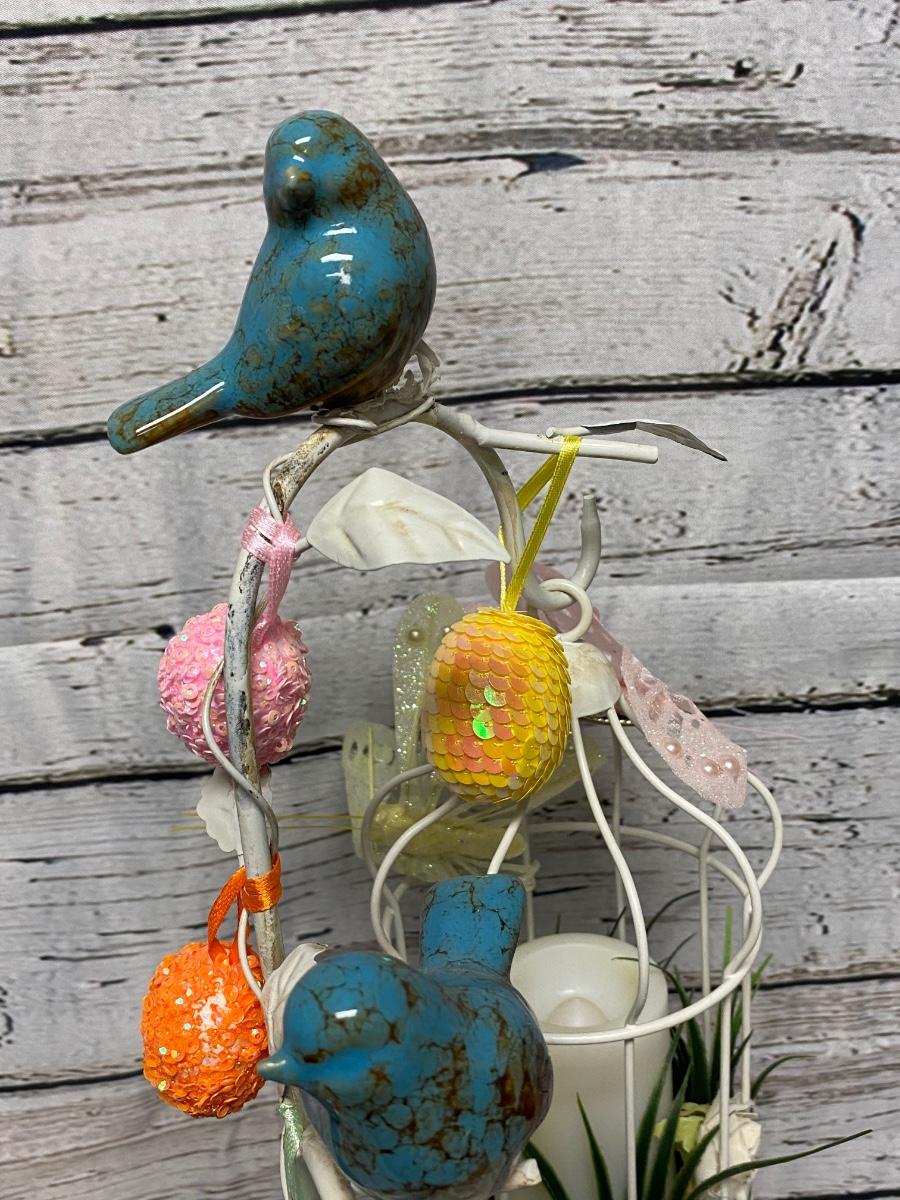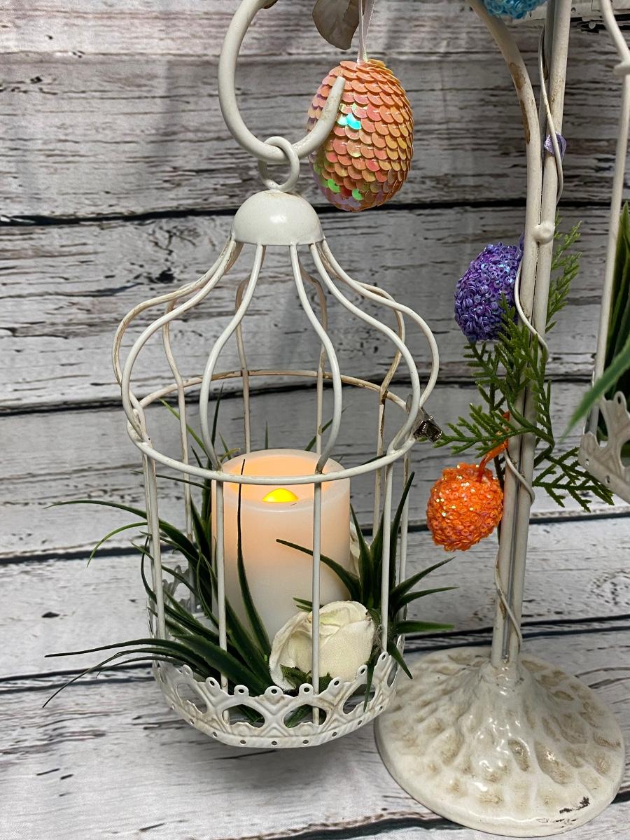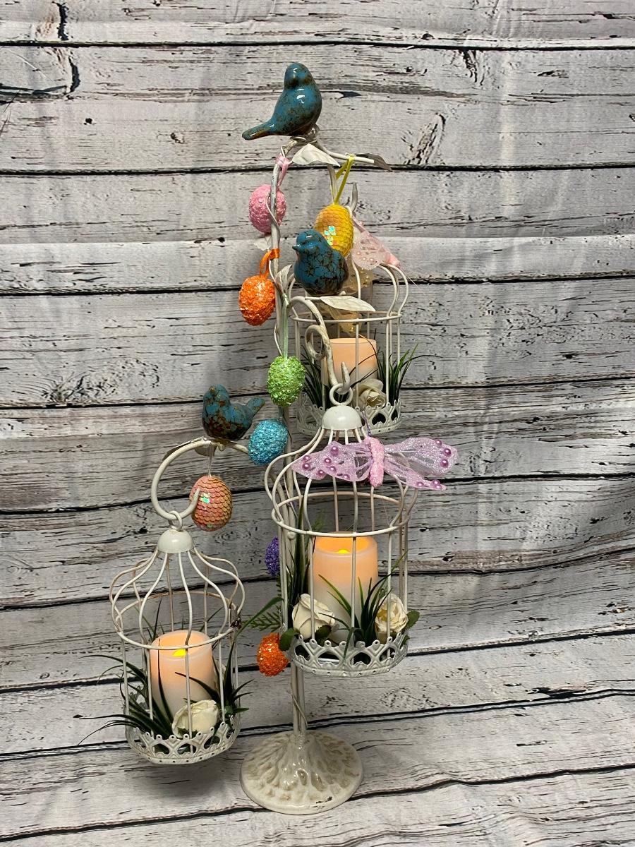 Springtime Easter decorated white metal candle lantern stand. Metal stand with three small birdcages hanging from it. Cages have battery operated candles in them, all candles are working. Patina birds on stand. Lanterns are removable and could be placed on surfaces or hung in trees if needed. Stand is about 24" tall. Springtime and Easter decorations are removeable and were added on by previous owner.