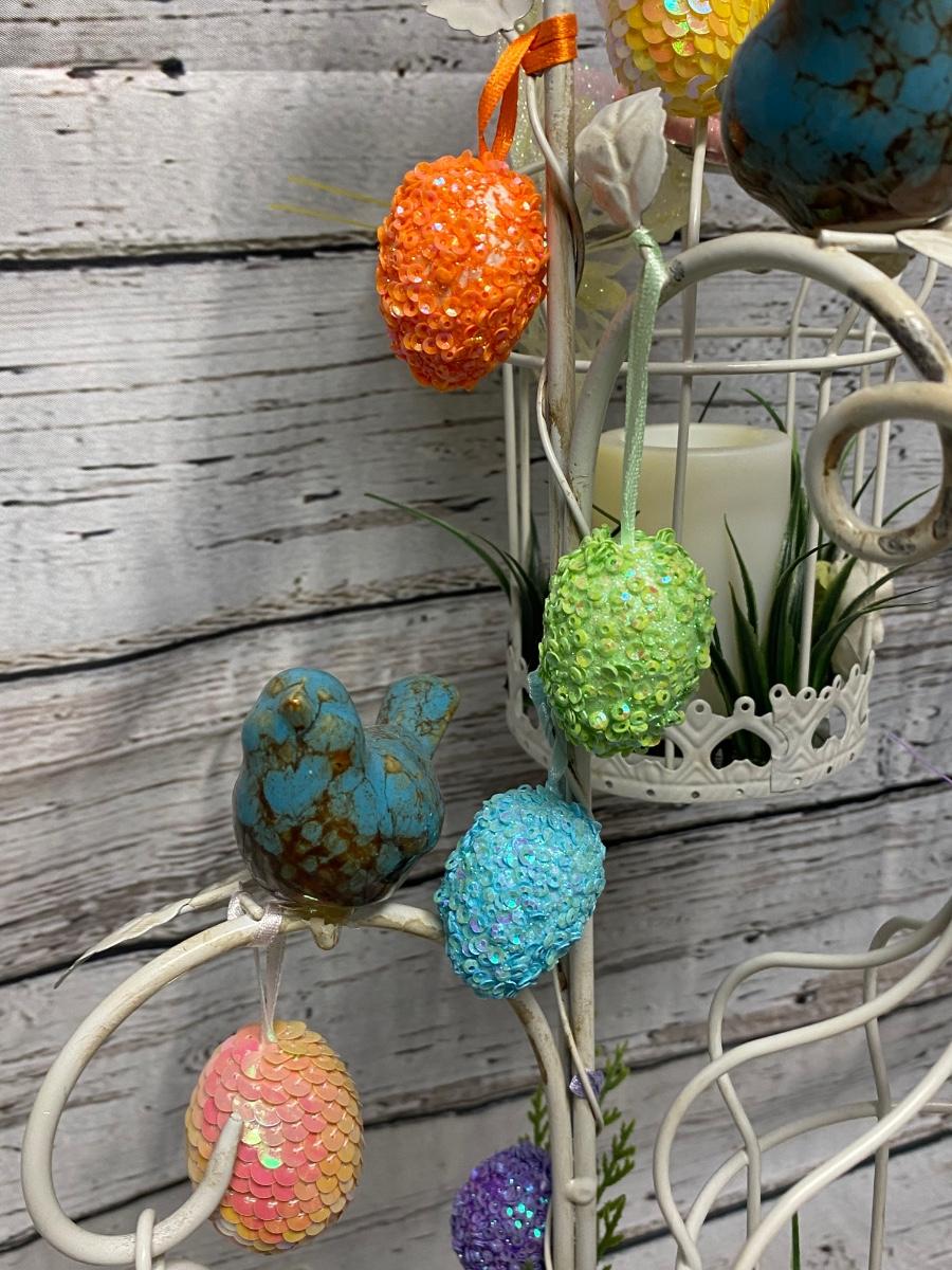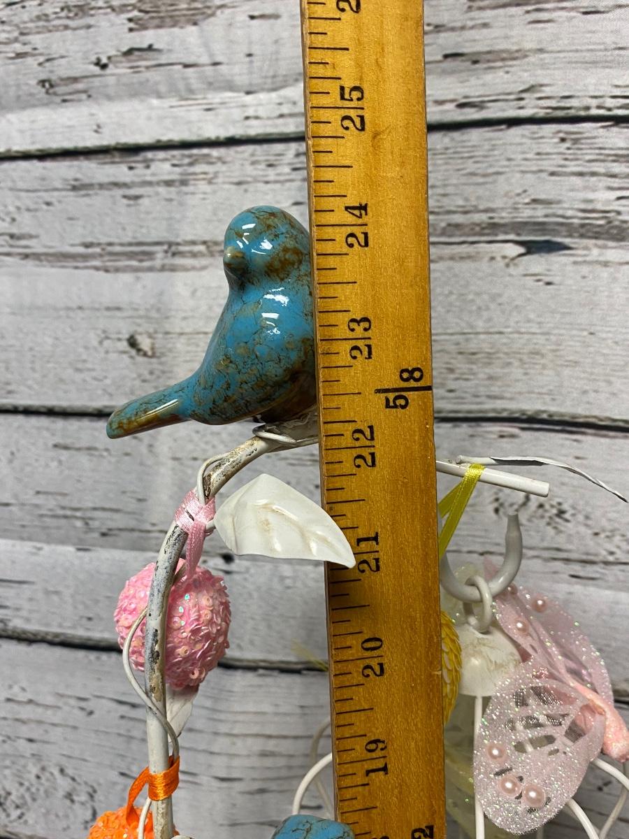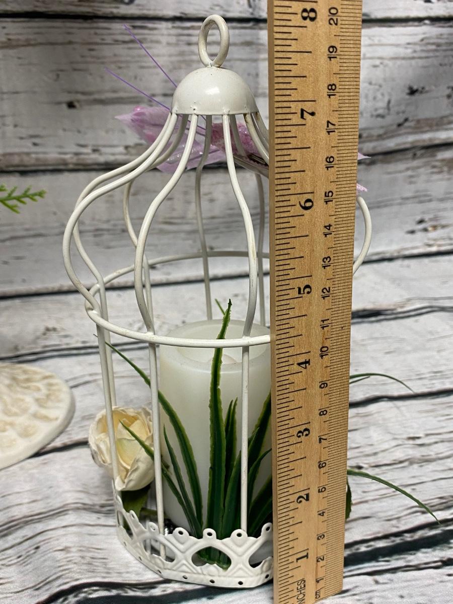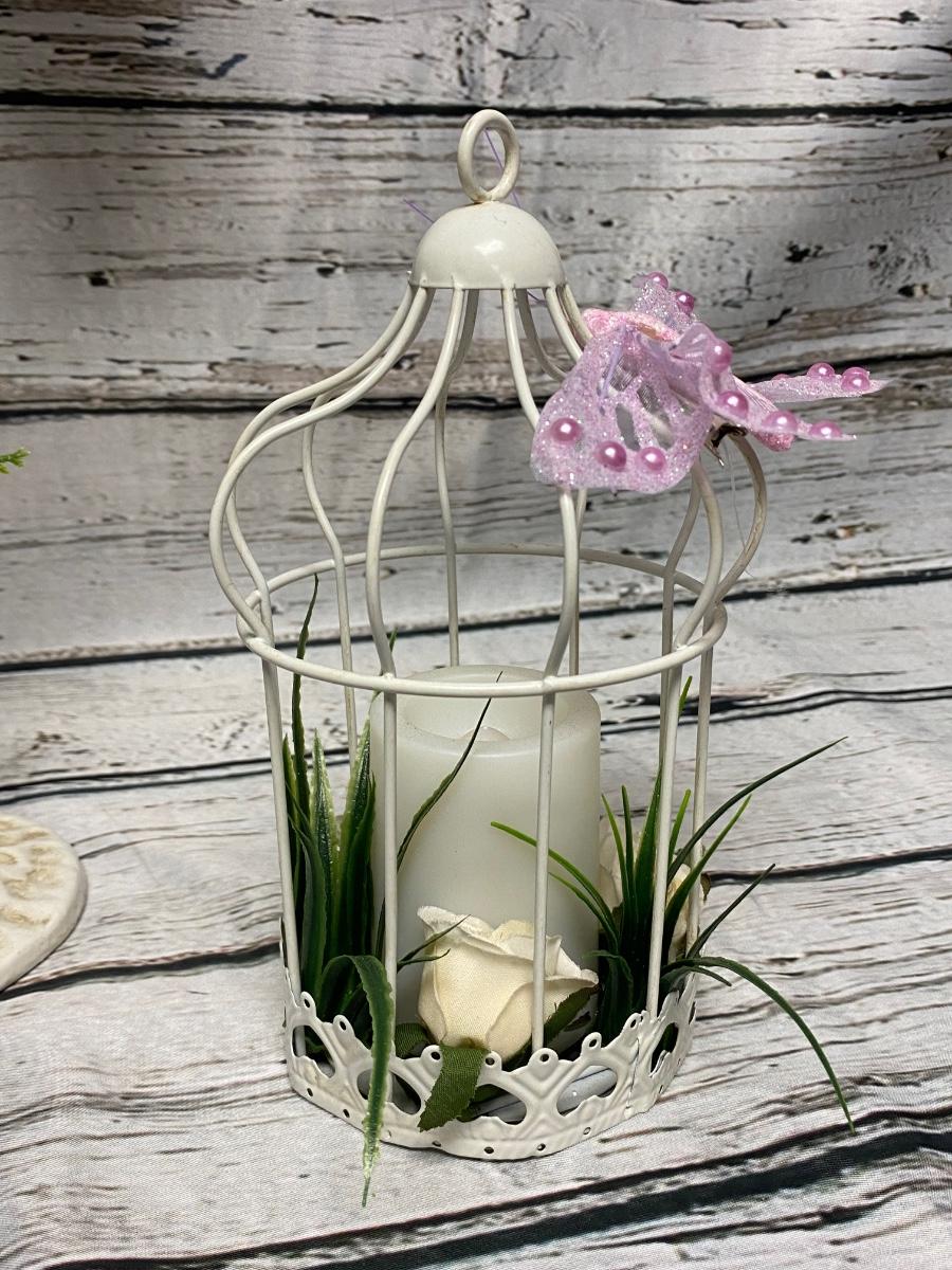 Springtime Easter decorated white metal candle lantern stand. Metal stand with three small birdcages hanging from it. Cages have battery operated candles in them, all candles are working. Patina birds on stand. Lanterns are removable and could be placed on surfaces or hung in trees if needed. Stand is about 24" tall. Springtime and Easter decorations are removeable and were added on by previous owner.