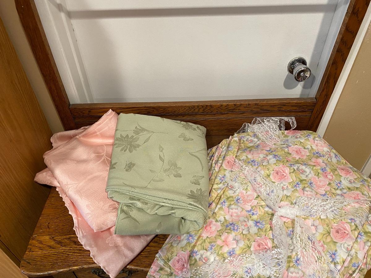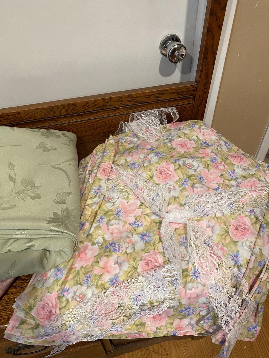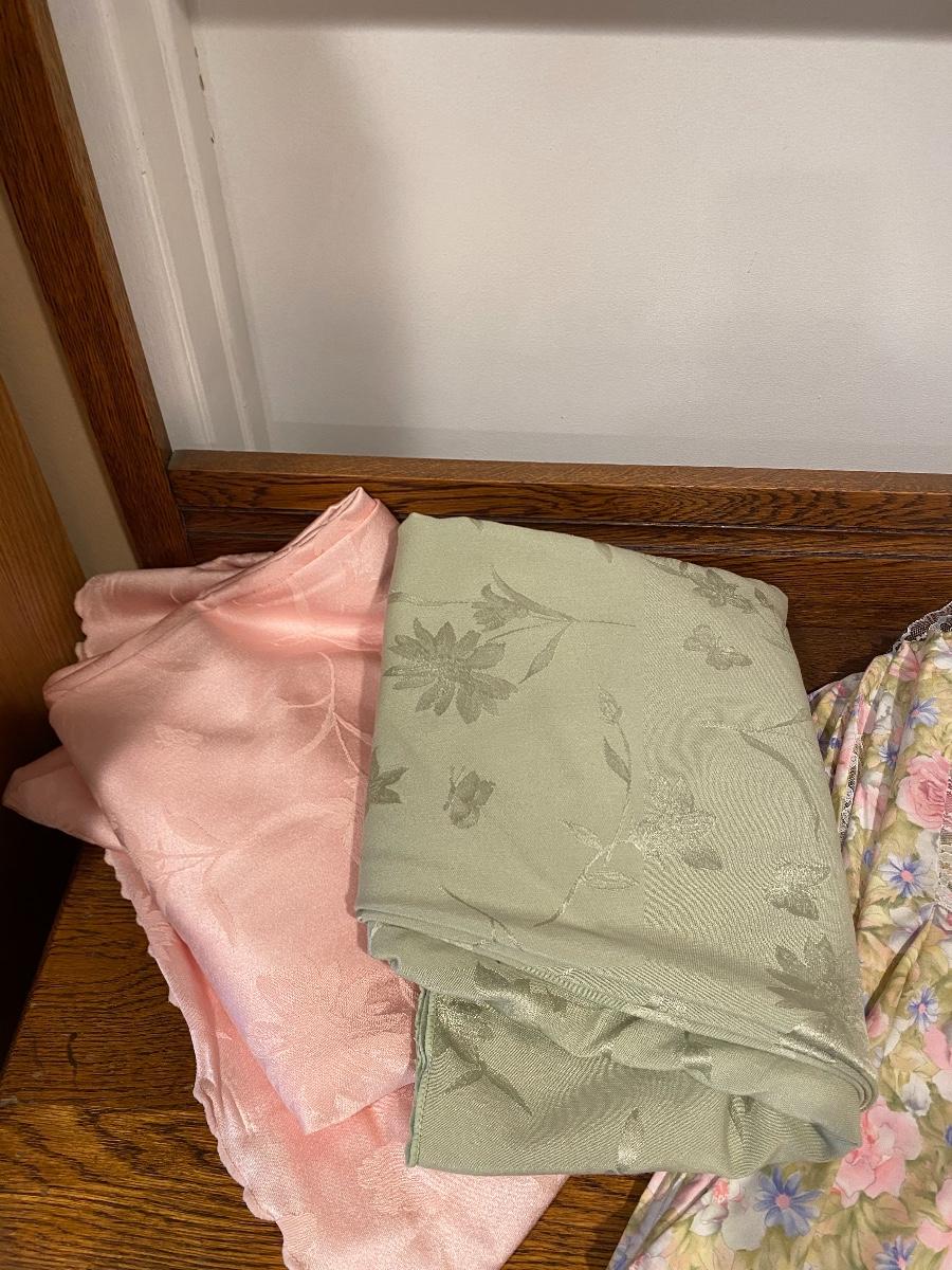 Springtime pink and green floral table linens. Two table clothes and 10 chair back covers.