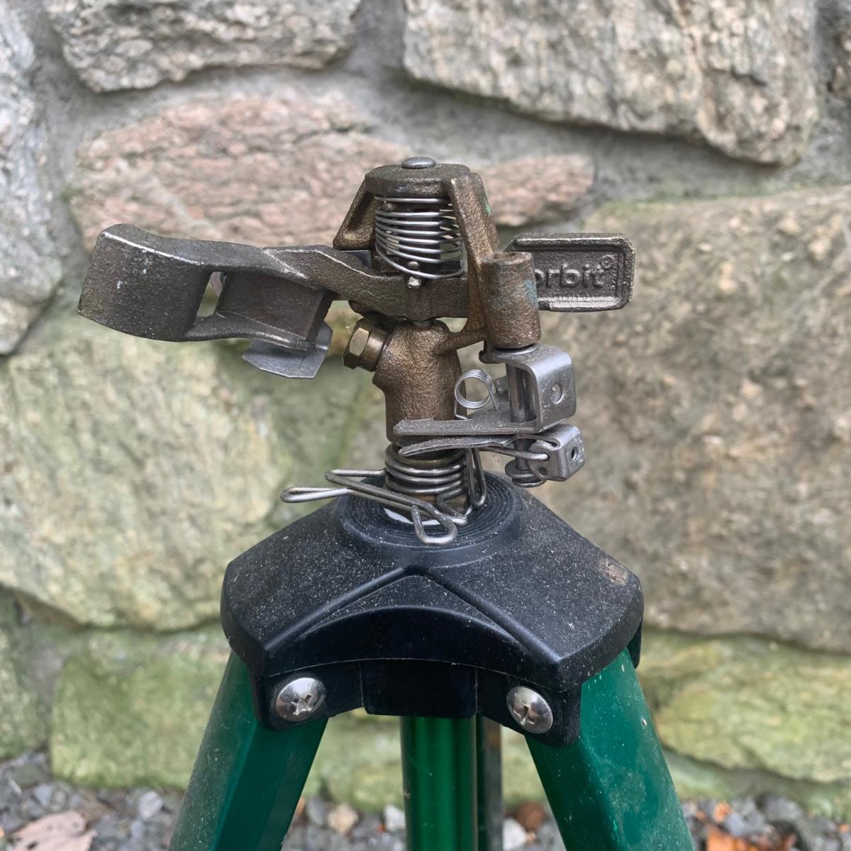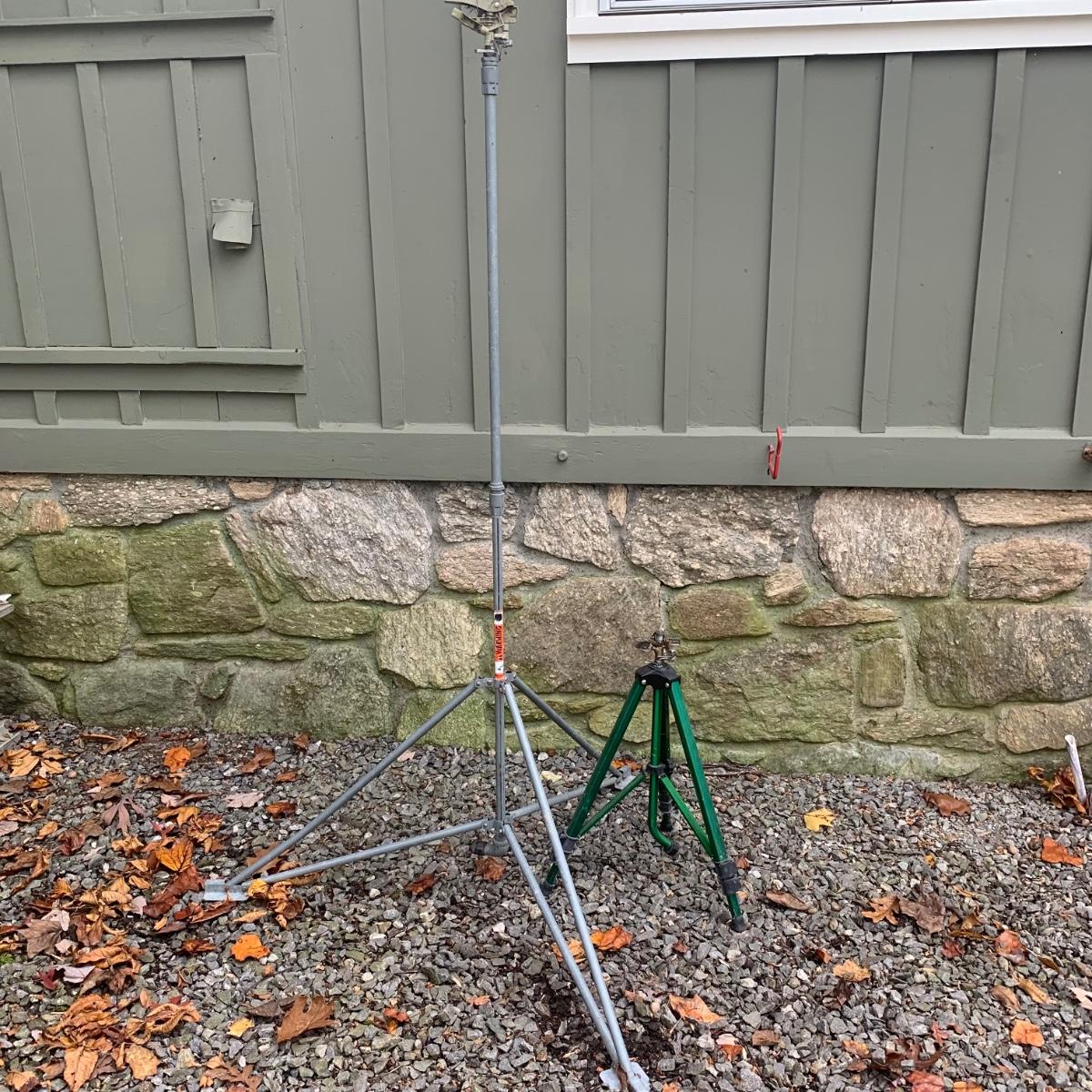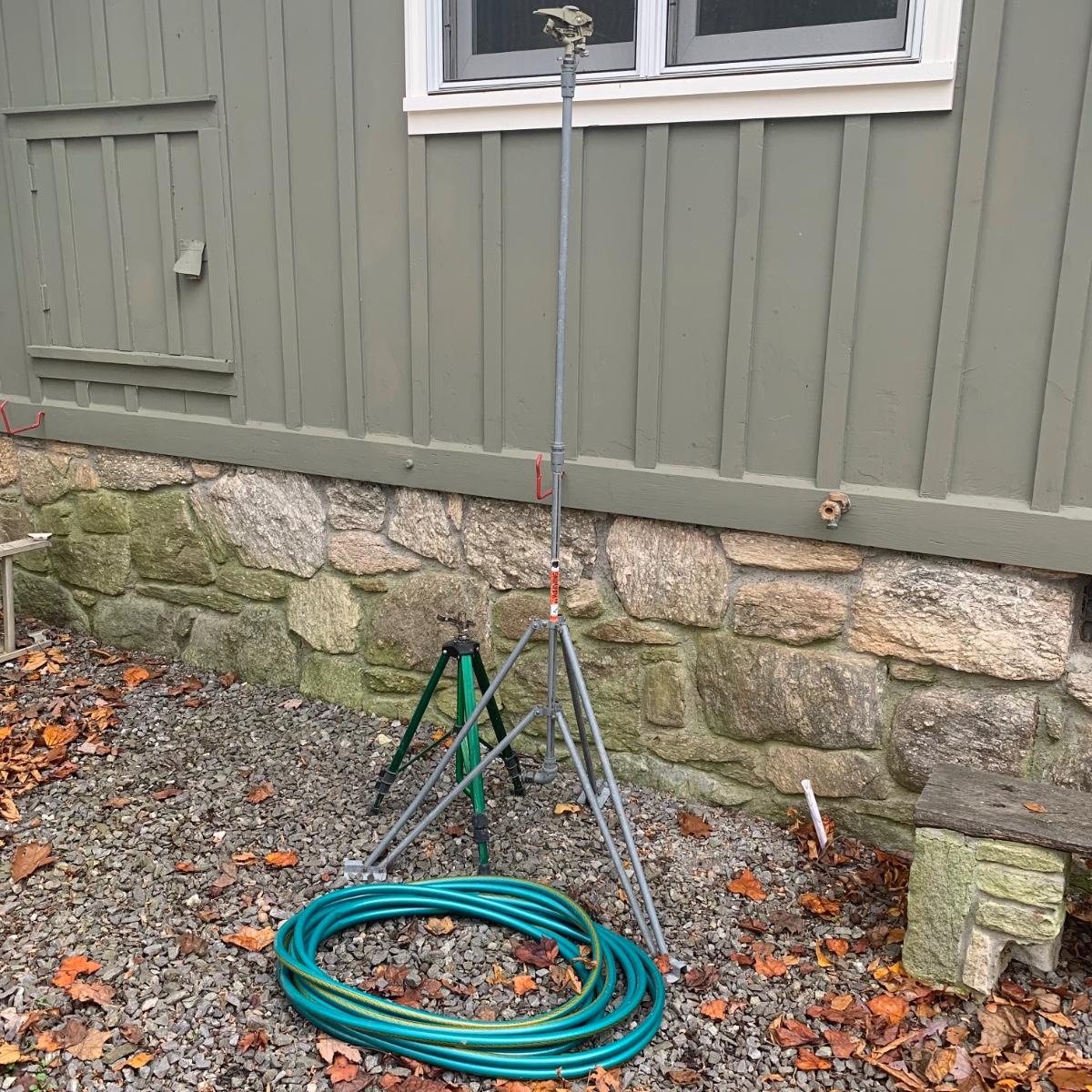 Lot includes two tripod sprinklers, one of which is Orbit brand. Both tripod sprinklers are adjustable, with the tallest sprinkler measuring, 77”H. Lot also includes a Neverkink hose. All items are used, but in good condition.