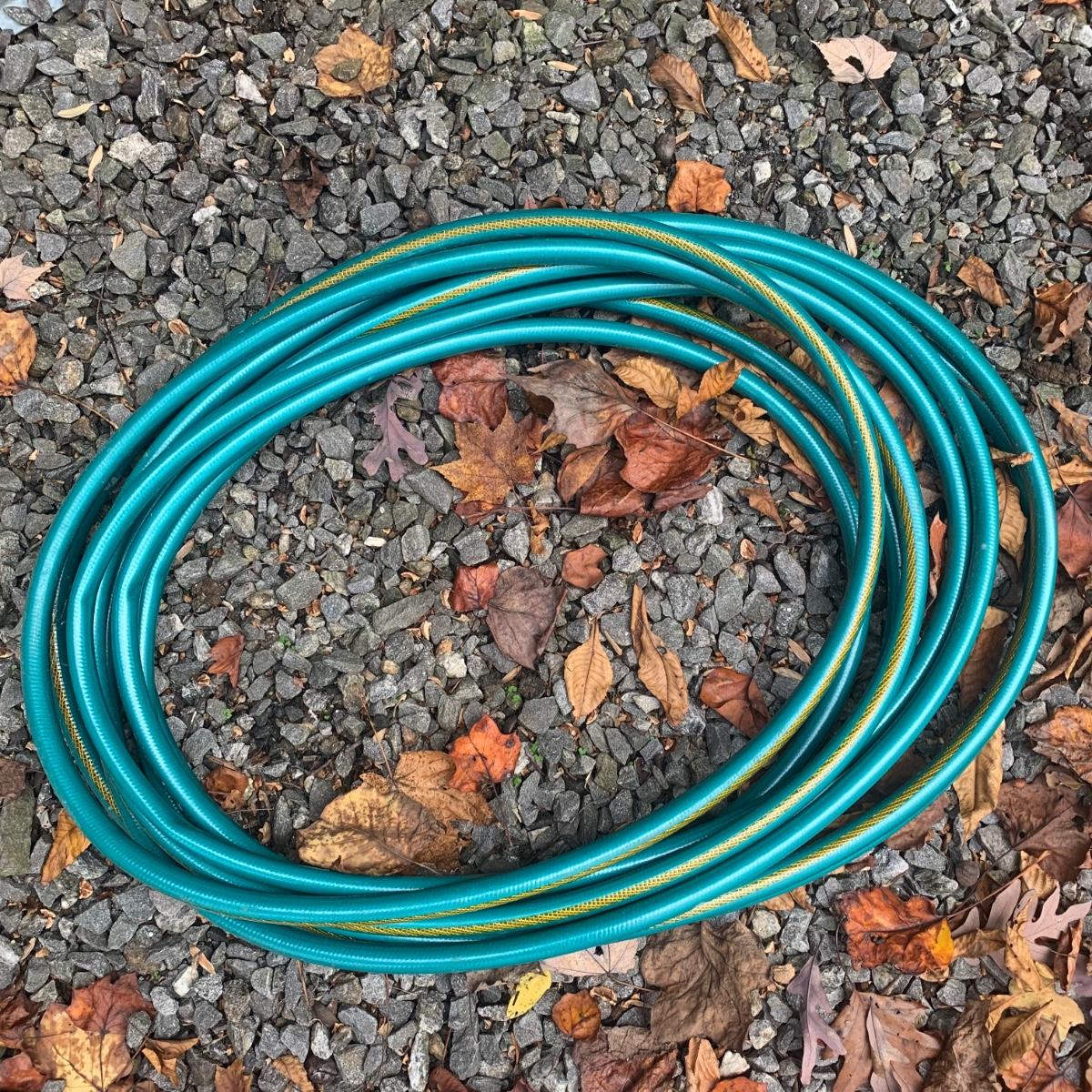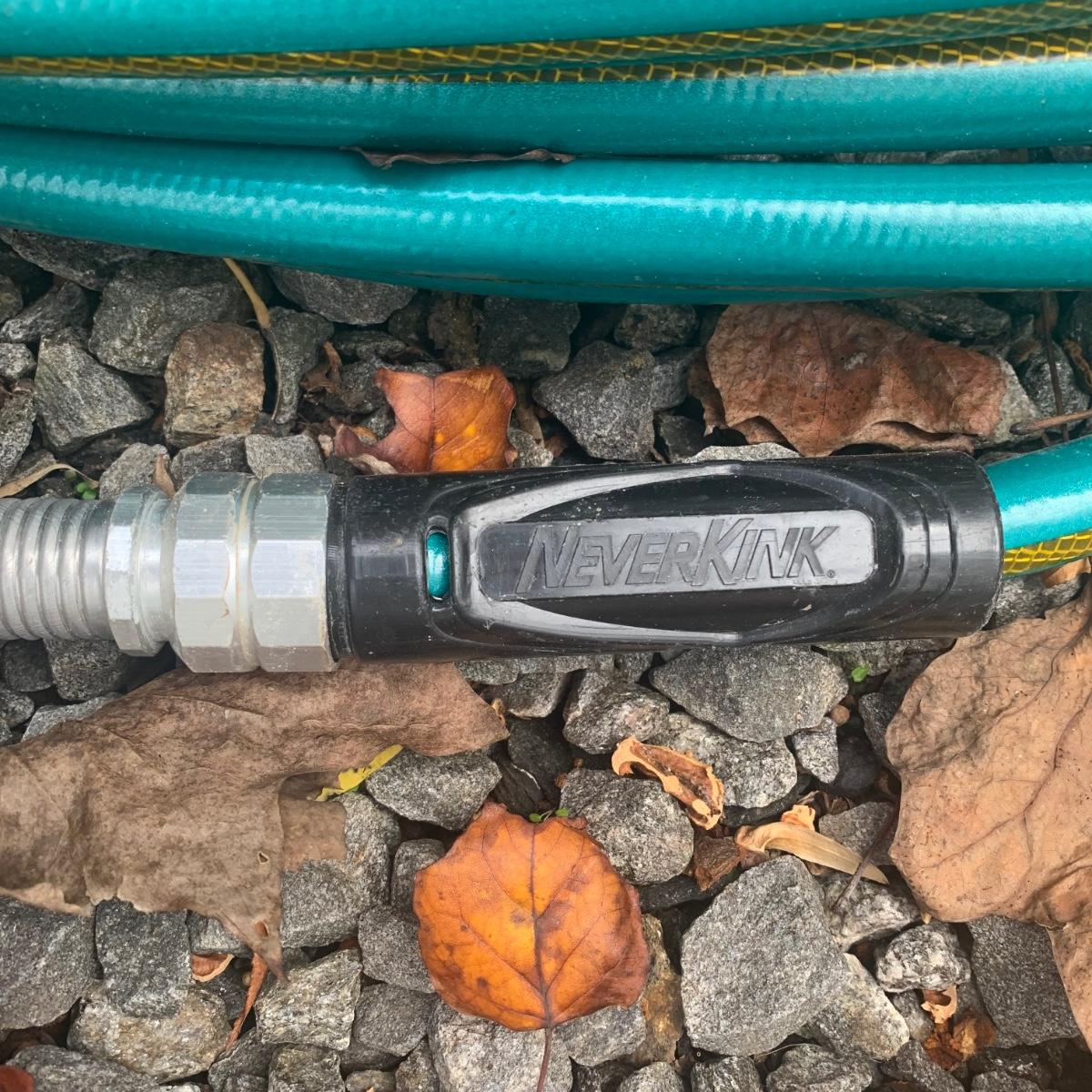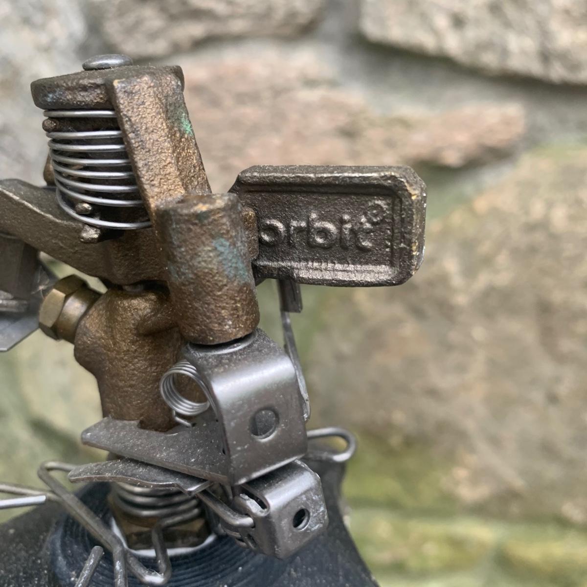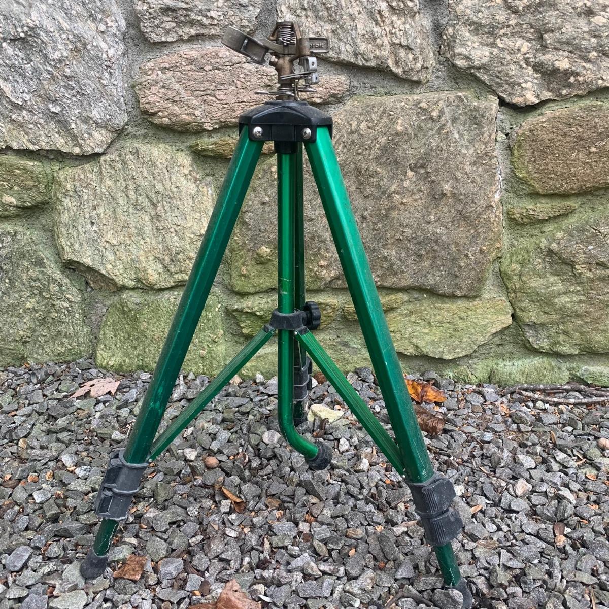 Lot includes two tripod sprinklers, one of which is Orbit brand. Both tripod sprinklers are adjustable, with the tallest sprinkler measuring, 77”H. Lot also includes a Neverkink hose. All items are used, but in good condition.