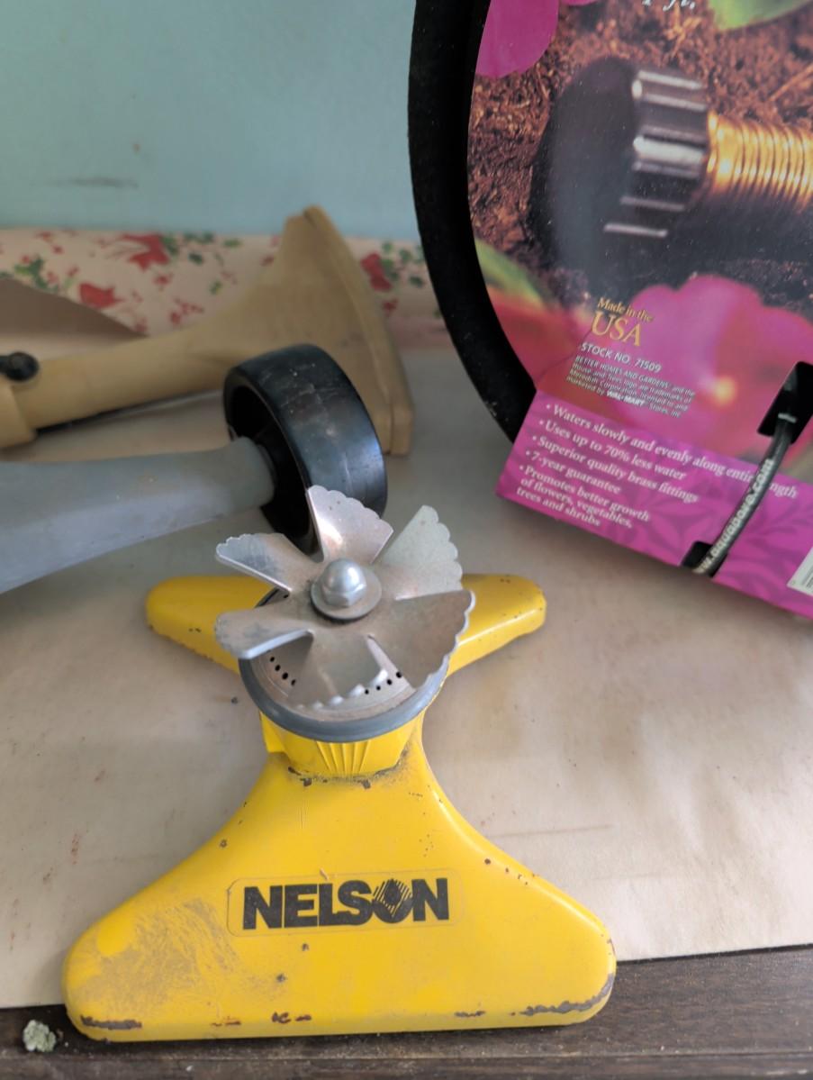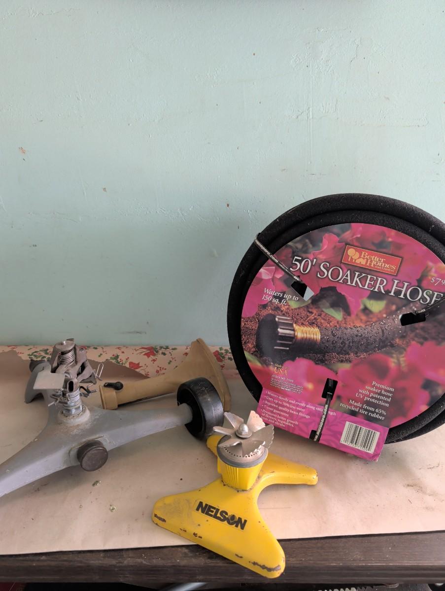 Soaker hose, rainbird sprinkler, nelson sprinkler, and water sprayer that fits on a hose.