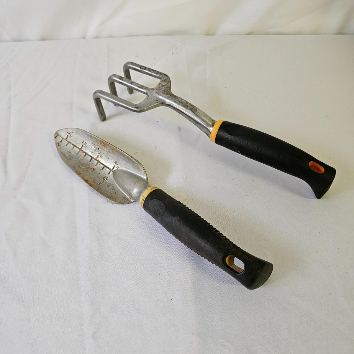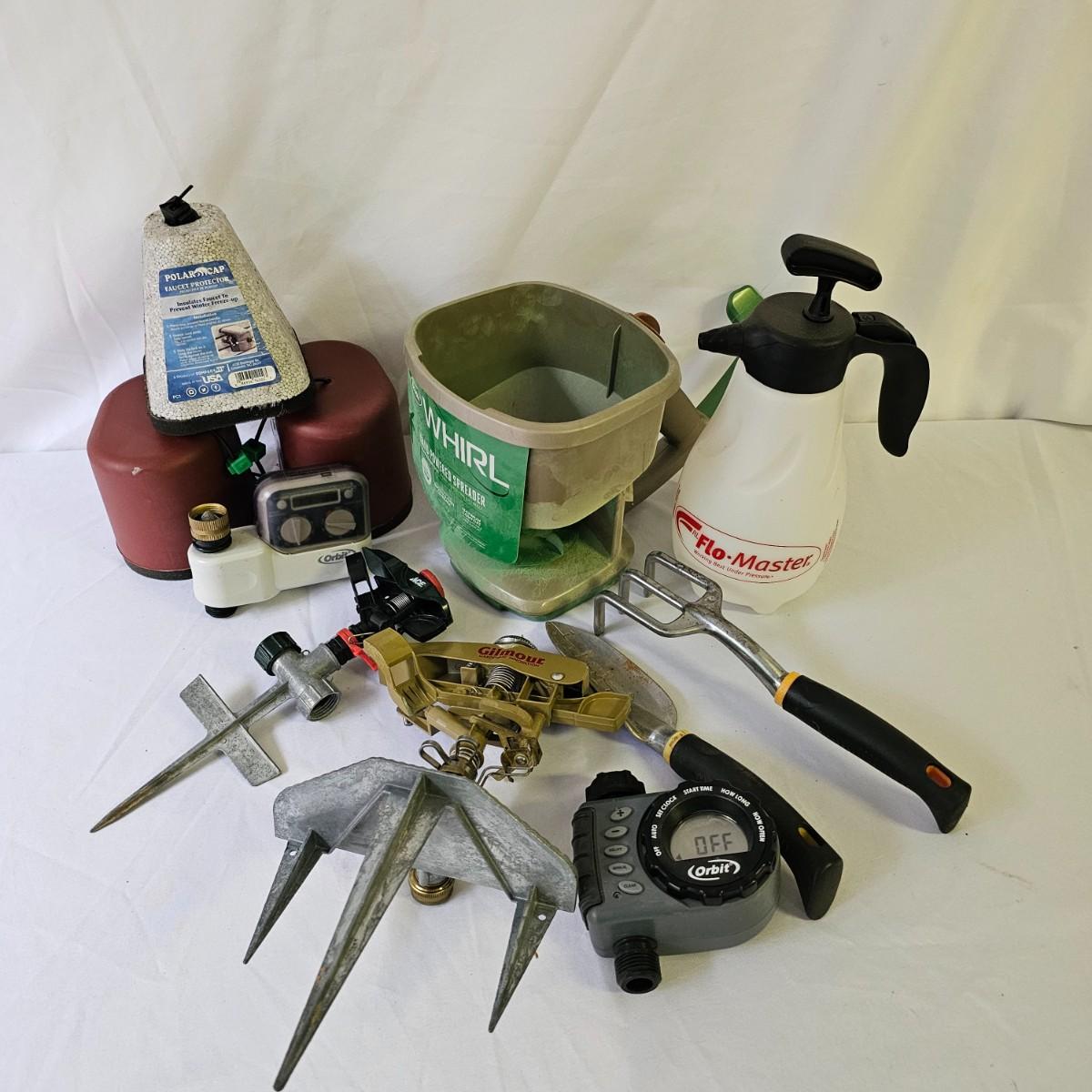 Several yard care items. One Scotts hand spreader, 8" x 16" x 9"H. One FloMaster pump sprayer, 1/2 gal capacity. Three faucet covers for winter. A pair of hand tools for planting. Two oscillating sprinkler heads, one Ace and one Gilmour. Also includes two watering cycle timers by Orbit, battery operated. See photos for details. Shipping available.