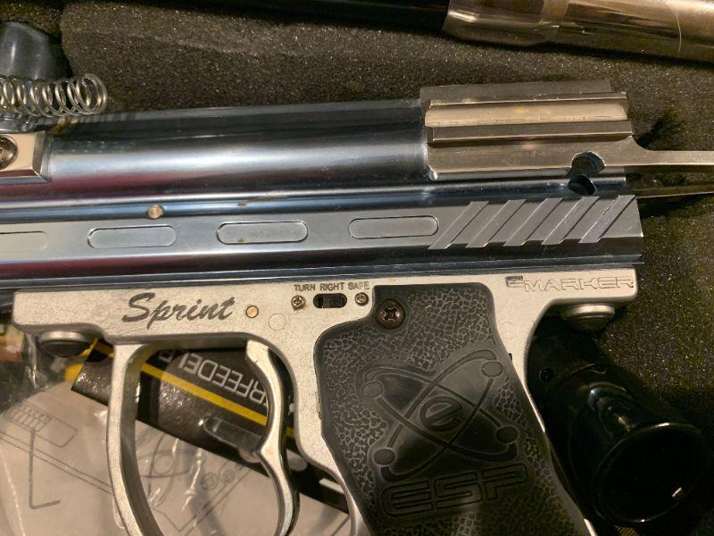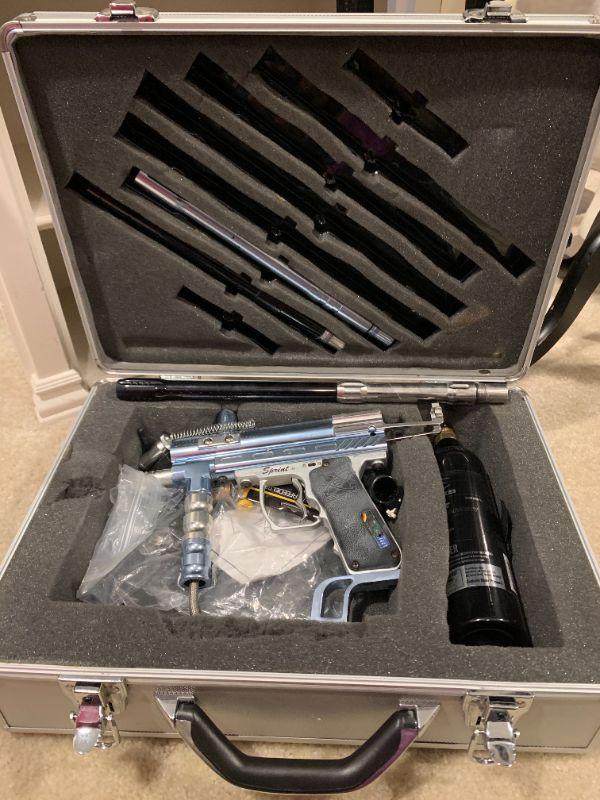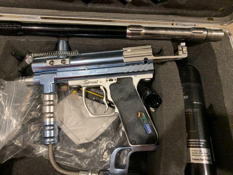 Sprint Marker Paintball gun with case and accessories as shown. Not believed to be working, but has never been tested properly by owners.