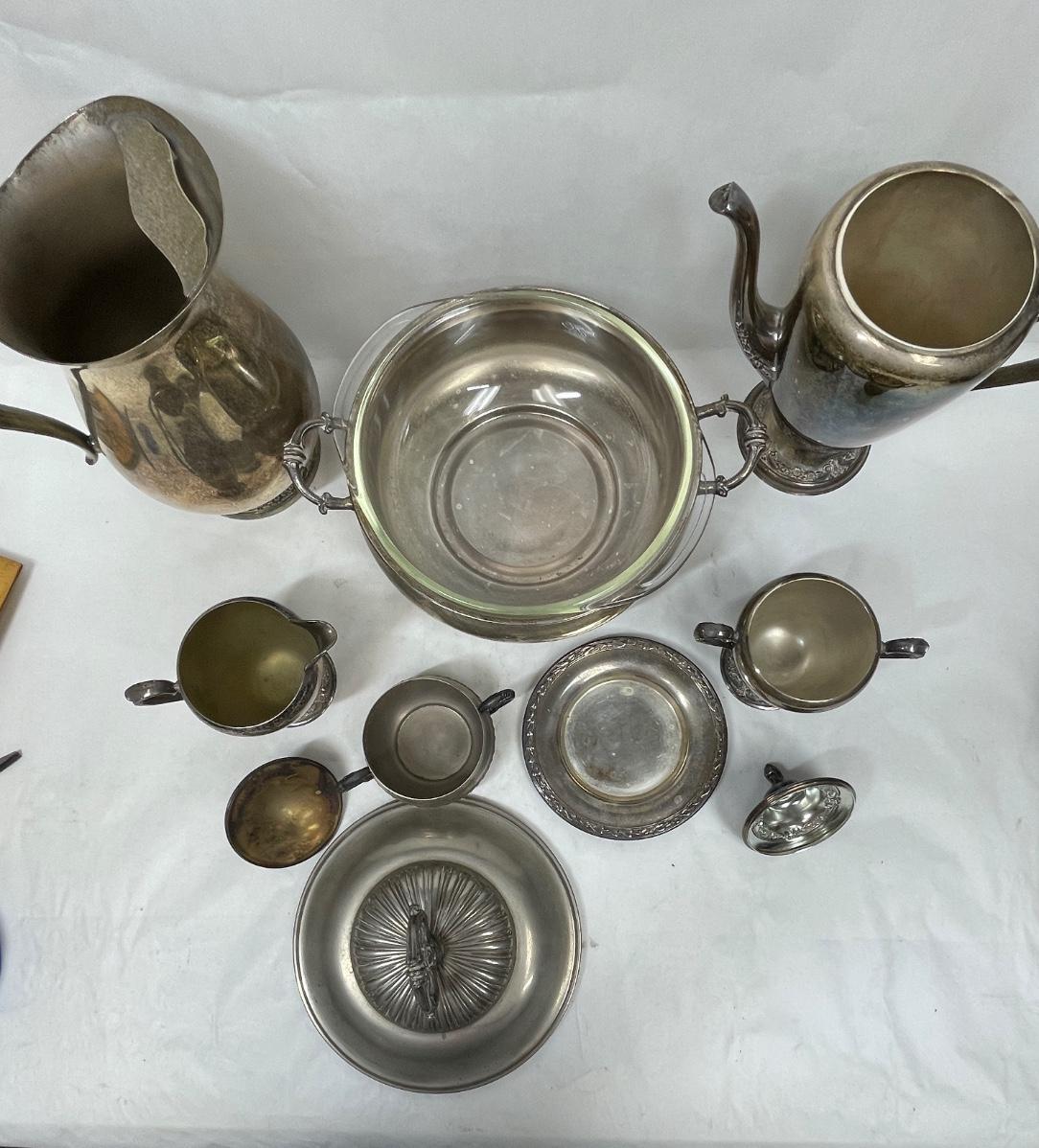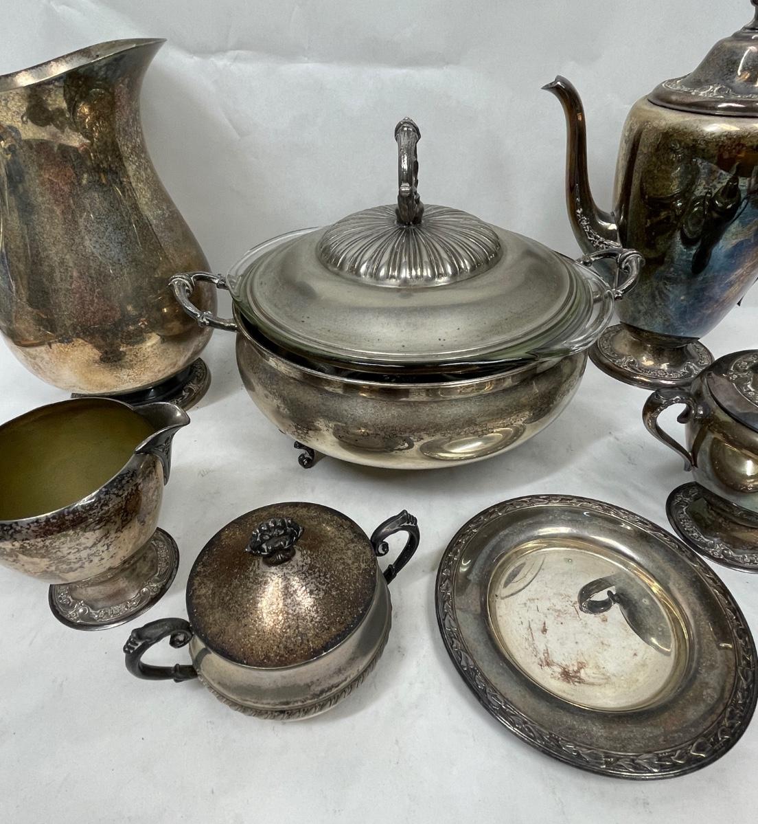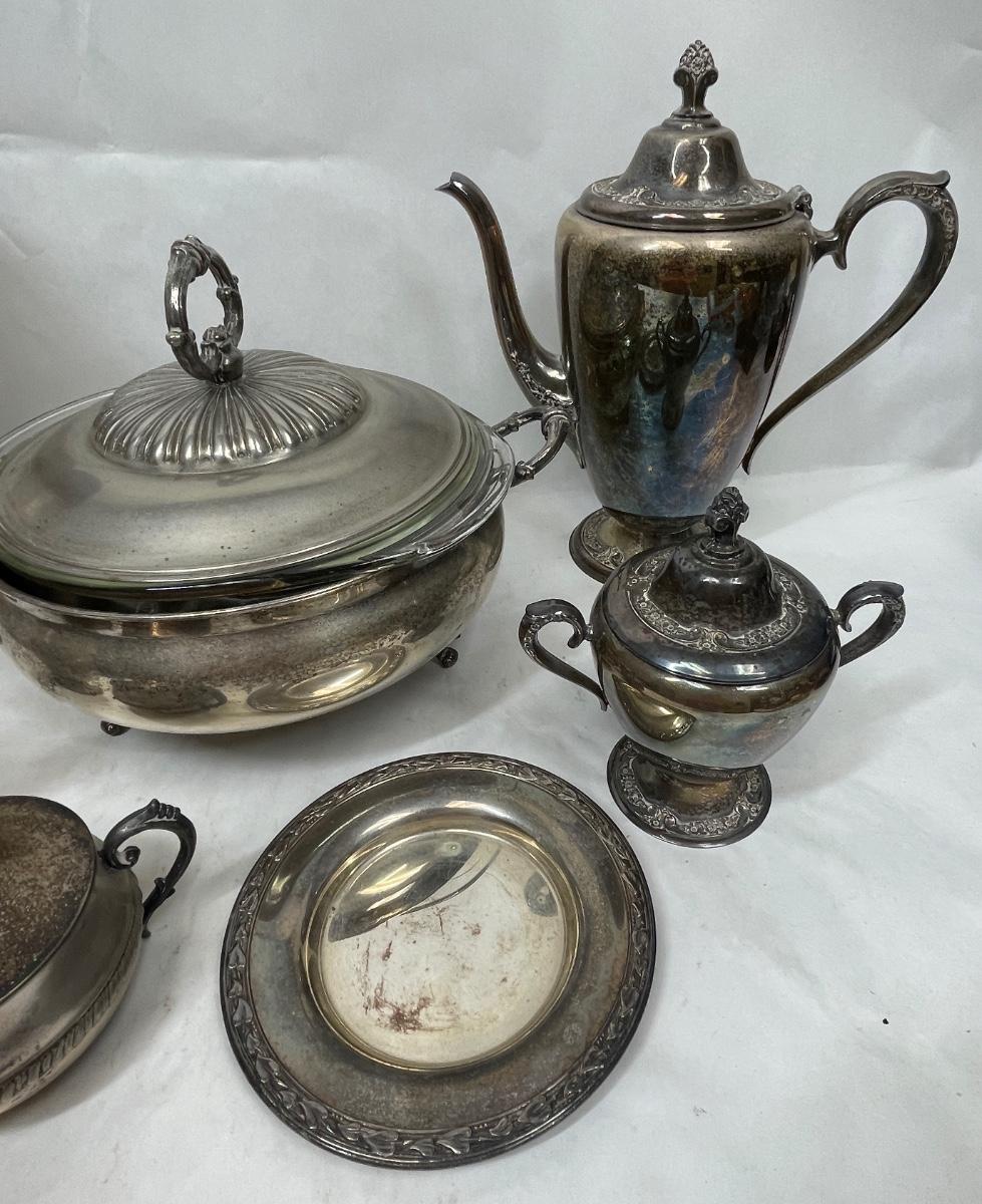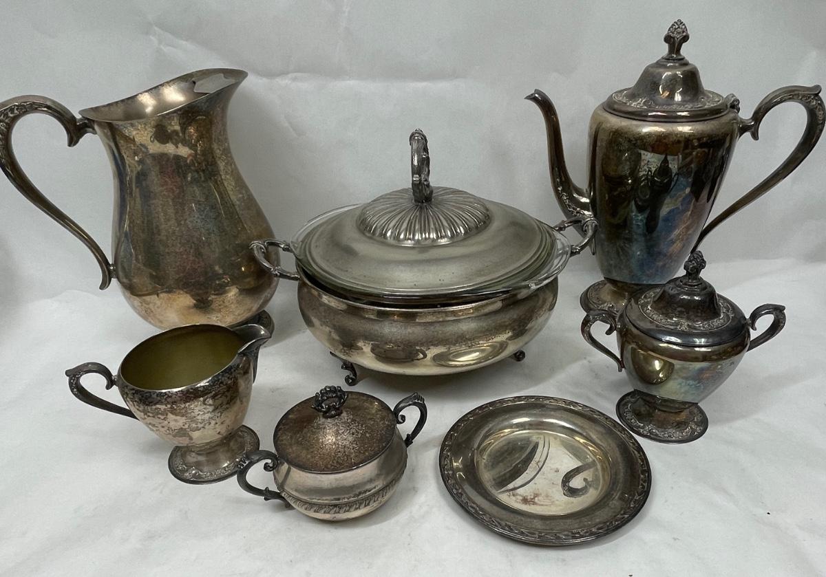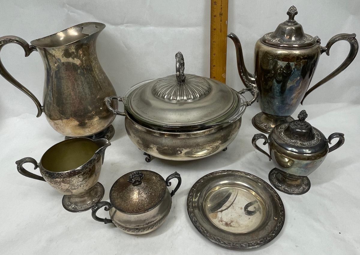 Mixed Lot of Silverplate Serving Pieces - casserole, pitcher, Coffee Pot, Cream & Sugar, small plate