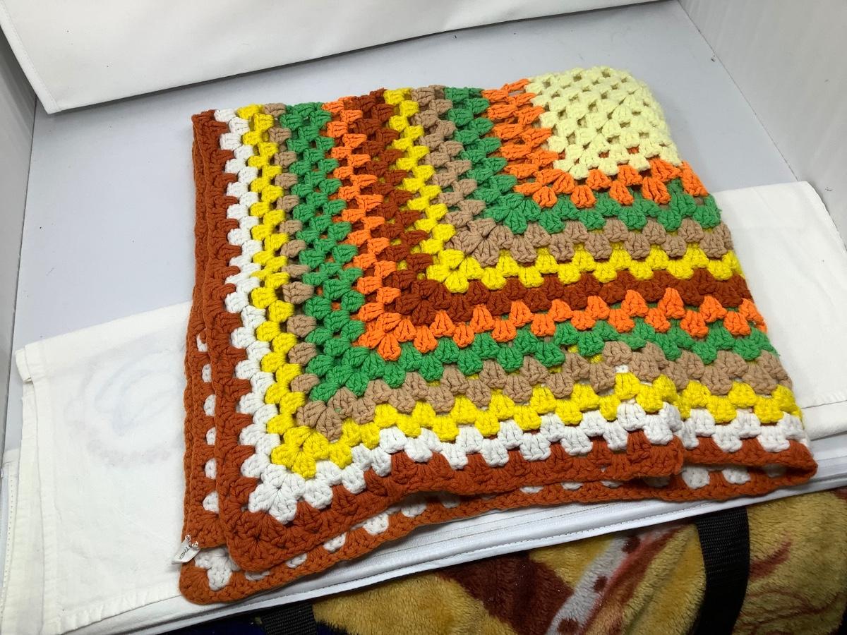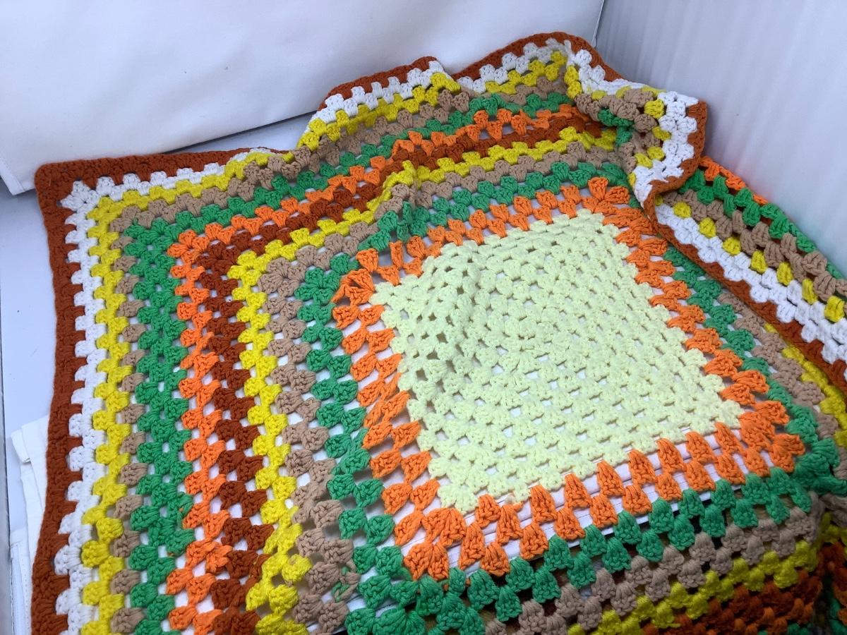 Brown, white, rust, green, orange, and yellow square crocheted afghan. 41 X 41 inches square. Very nice