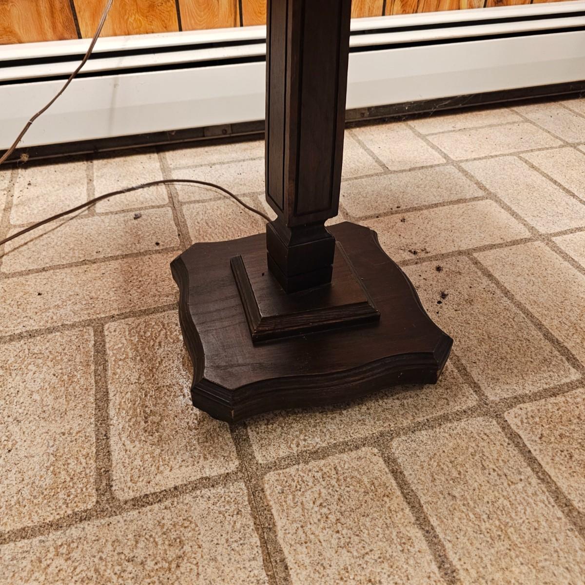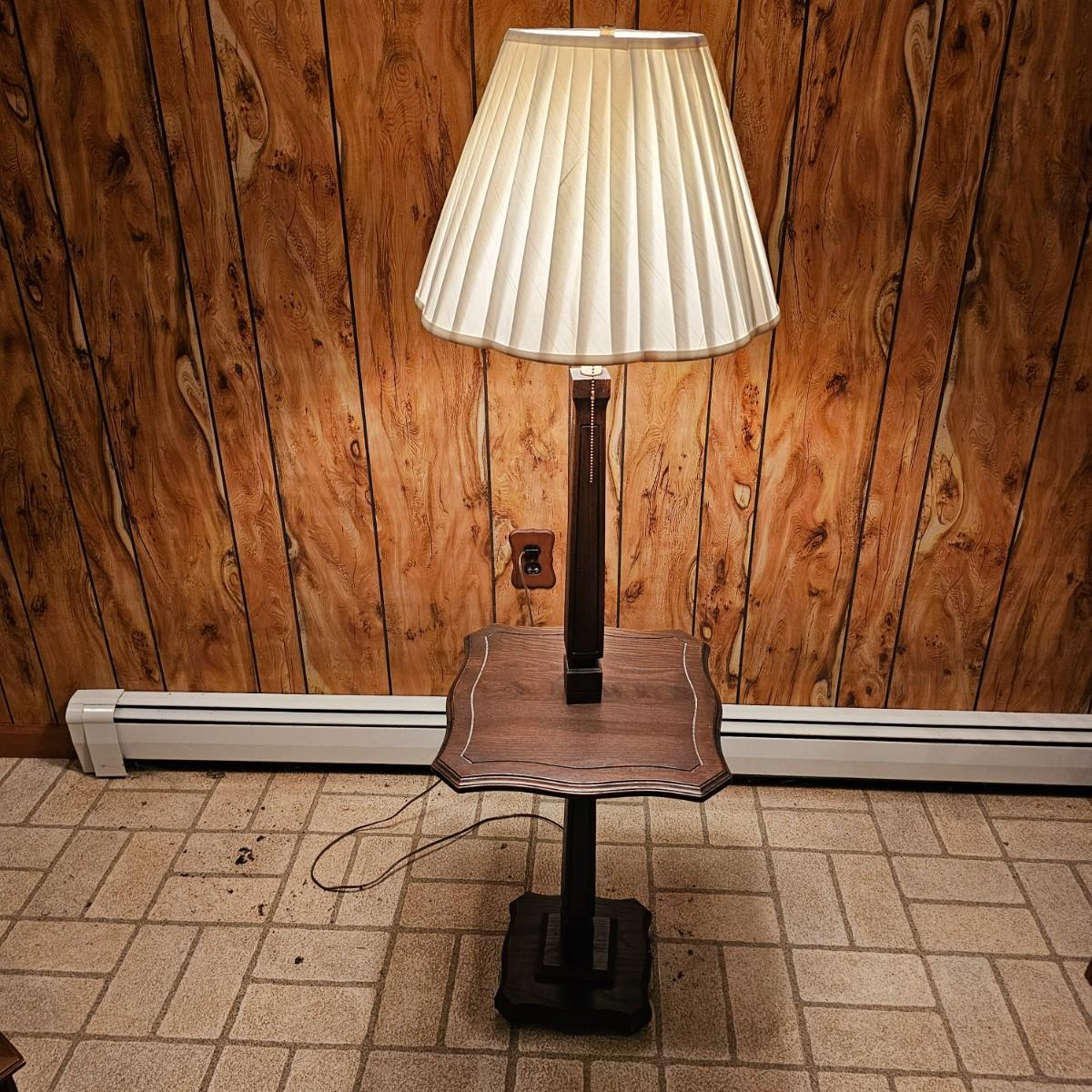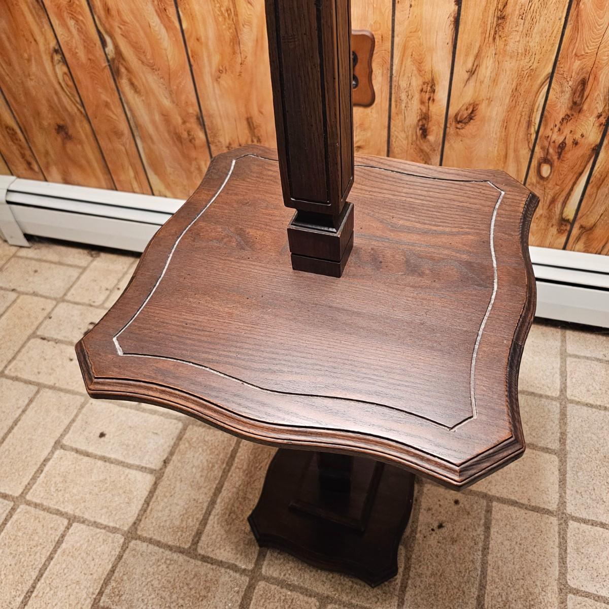 Solid wood table and lamp combination piece. Tapered columns in middle and decorative edge tabletop, this piece has a 3-way switch and measures 15.5" x 15.5" x 56"H. Pleated off-white shade on top. Lamp powered on when plugged in. See photos for details. Local pickup only.