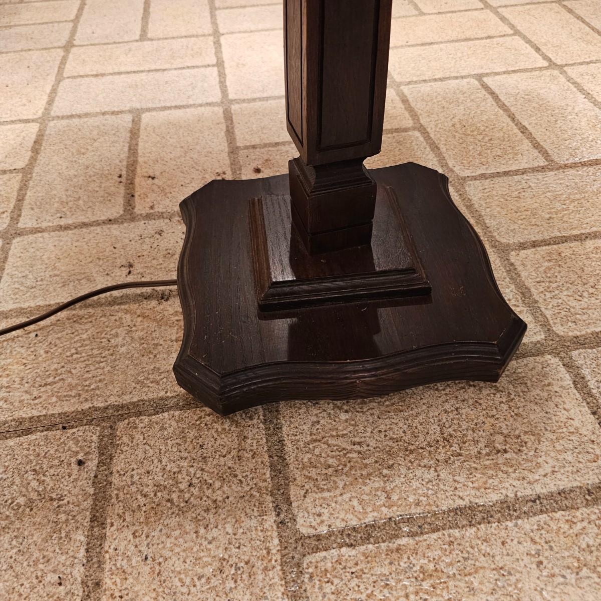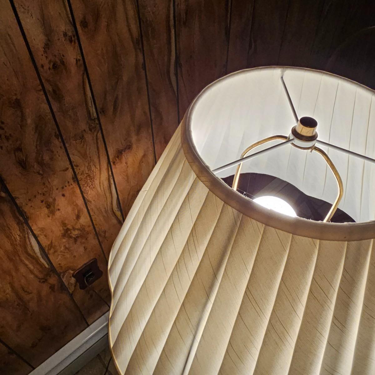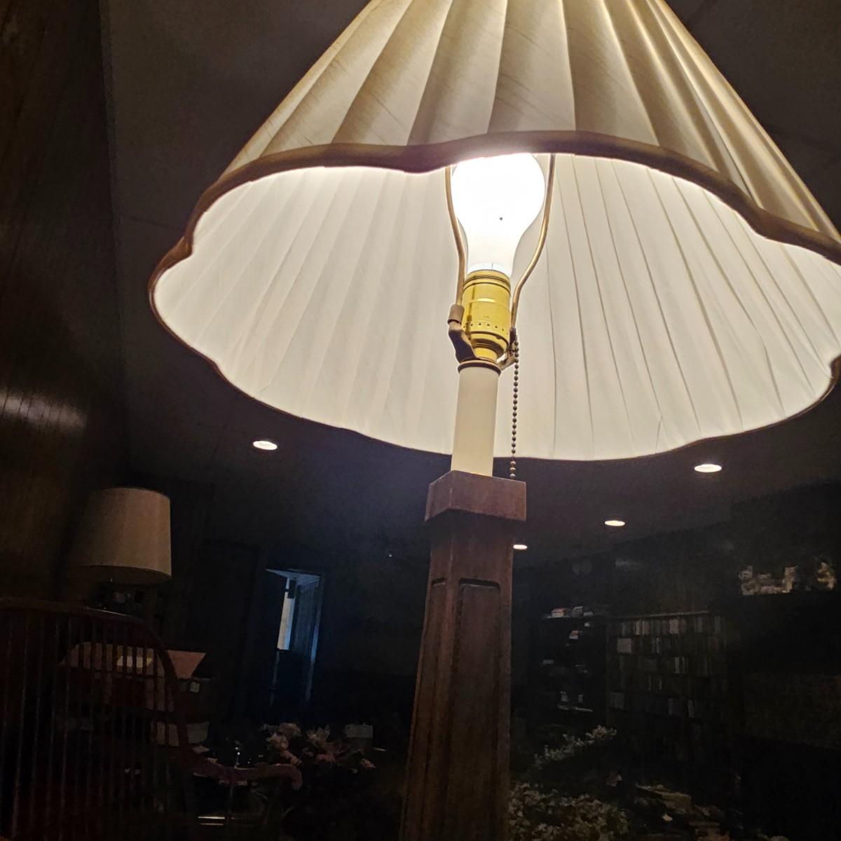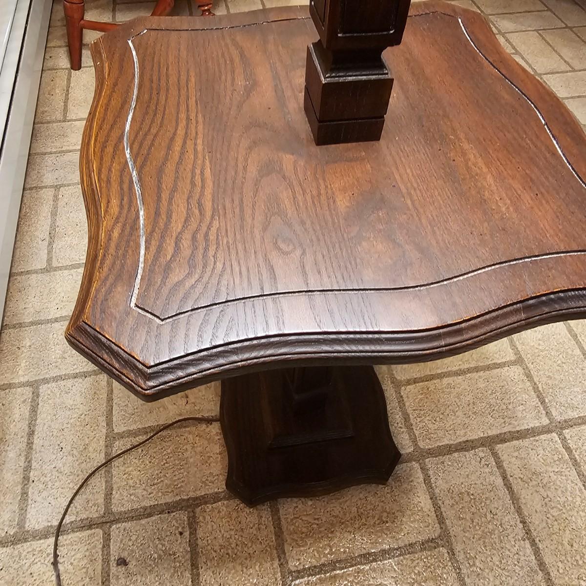Solid wood table and lamp combination piece. Tapered columns in middle and decorative edge tabletop, this piece has a 3-way switch and measures 15.5" x 15.5" x 56"H. Pleated off-white shade on top. Lamp powered on when plugged in. See photos for details. Local pickup only.