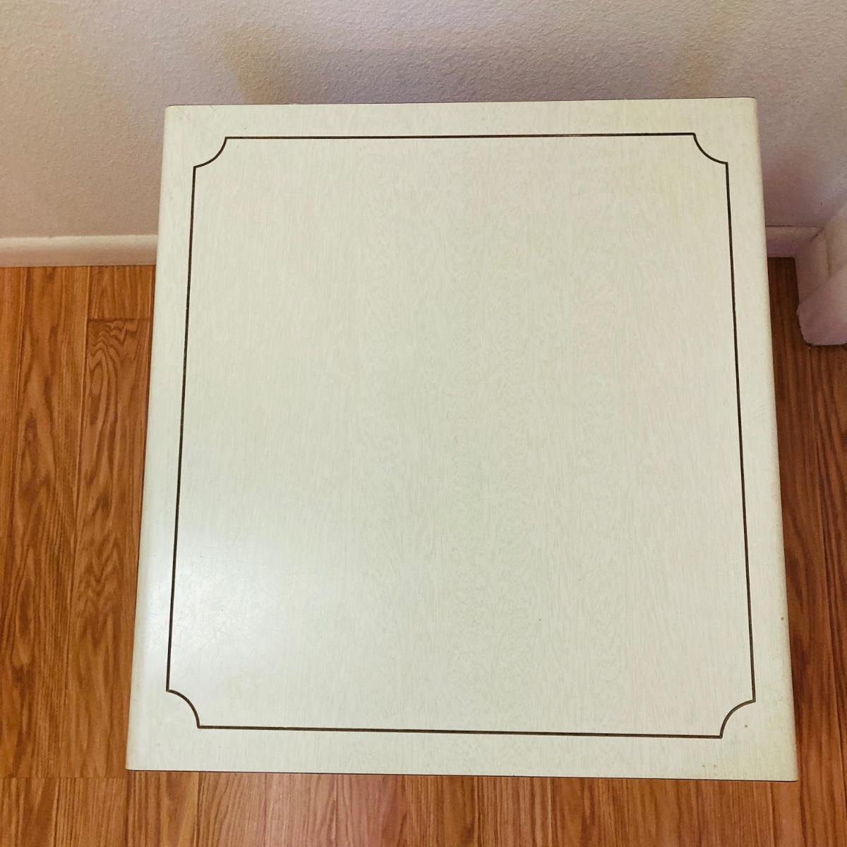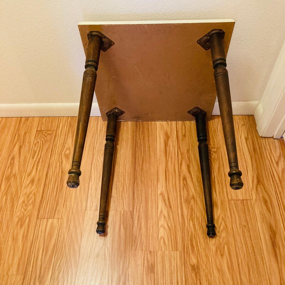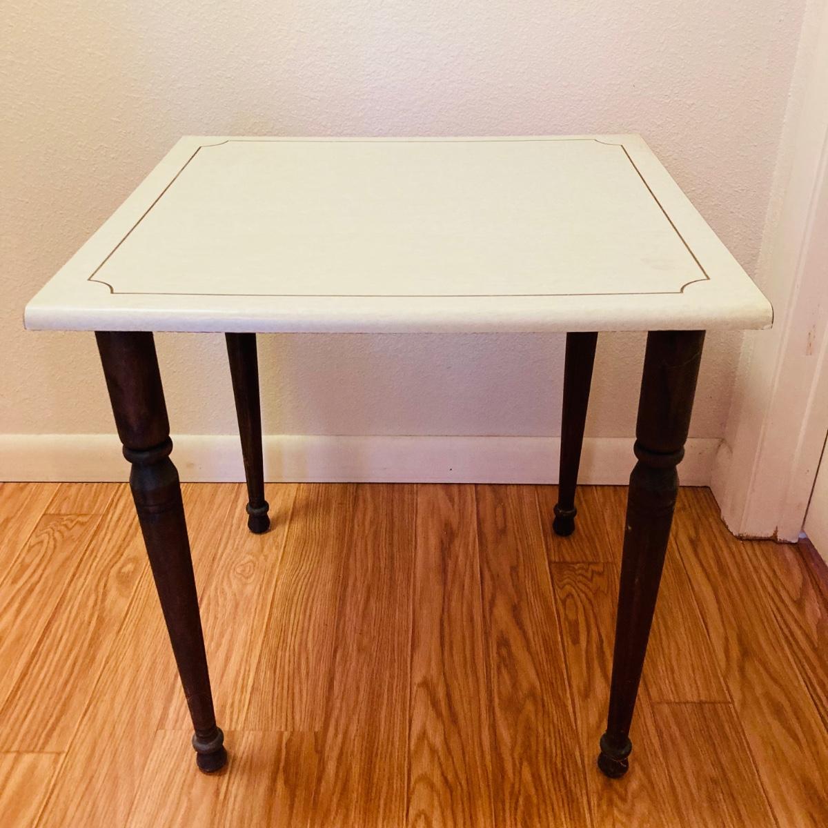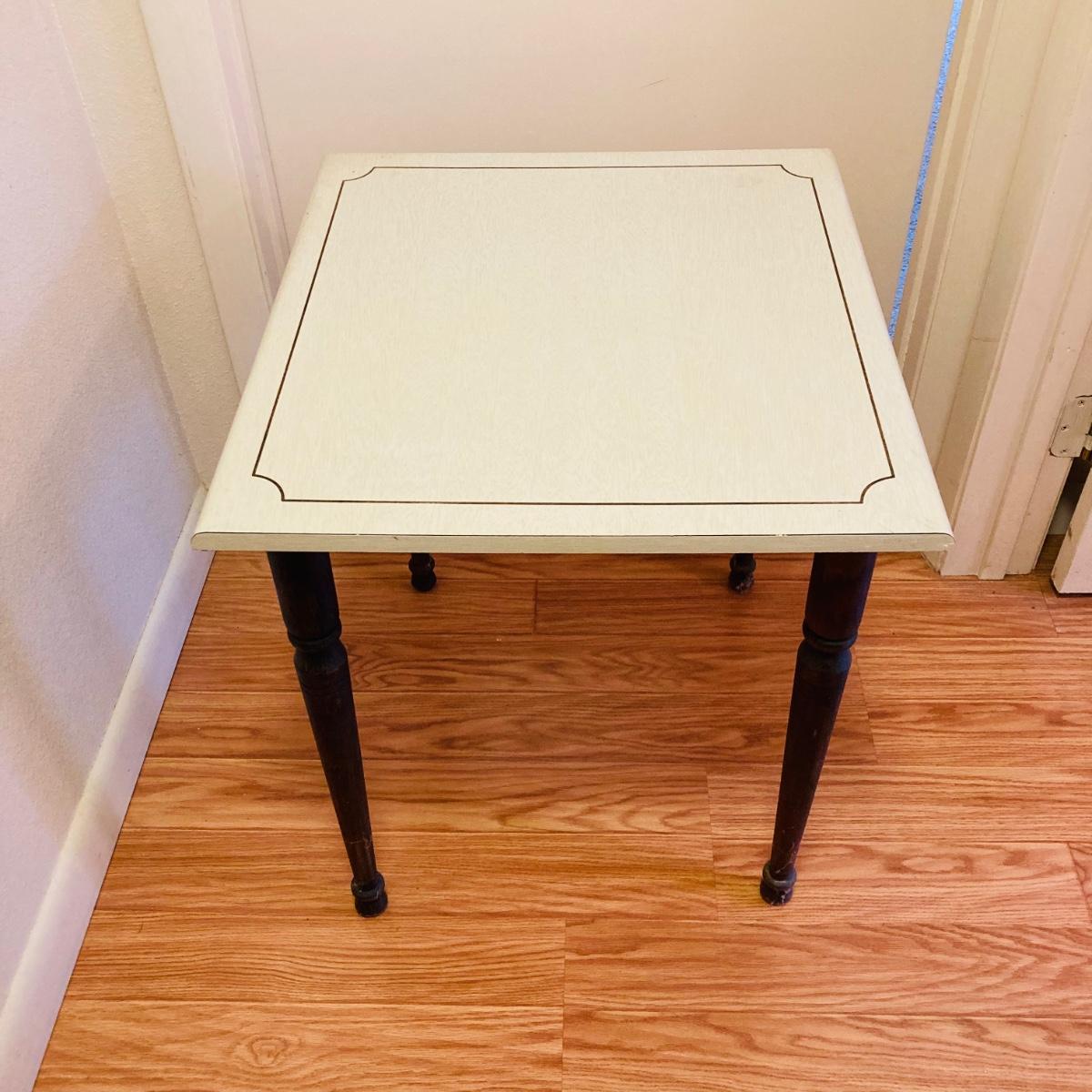 Creamy colored formica type end table with wooden legs. Good condition. 22”L x 20 1/2”W x 23”H.