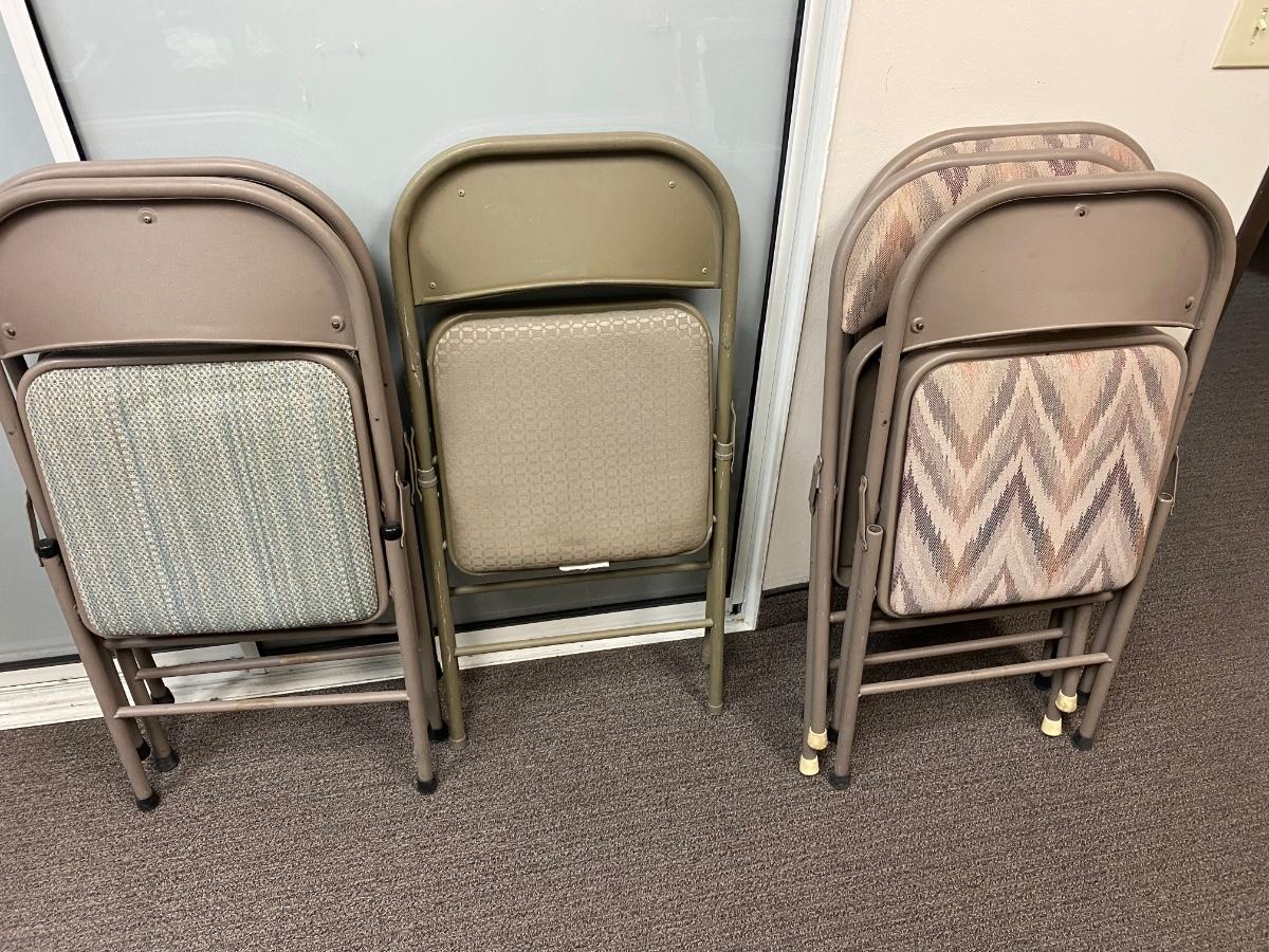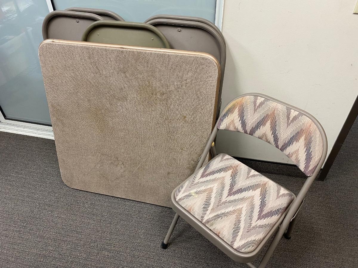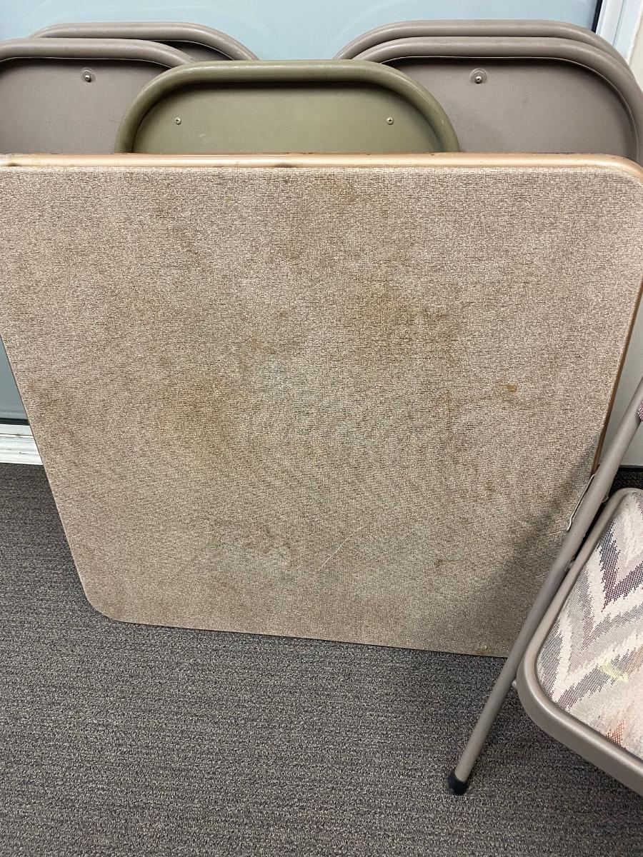Square Folding Card Table with 6 Cushioned Metal Chairs Different Fabric Patterns. In good useable condition. No holes in chair upholstery but they have some light discoloring. Table is sturdy, small tear in top.