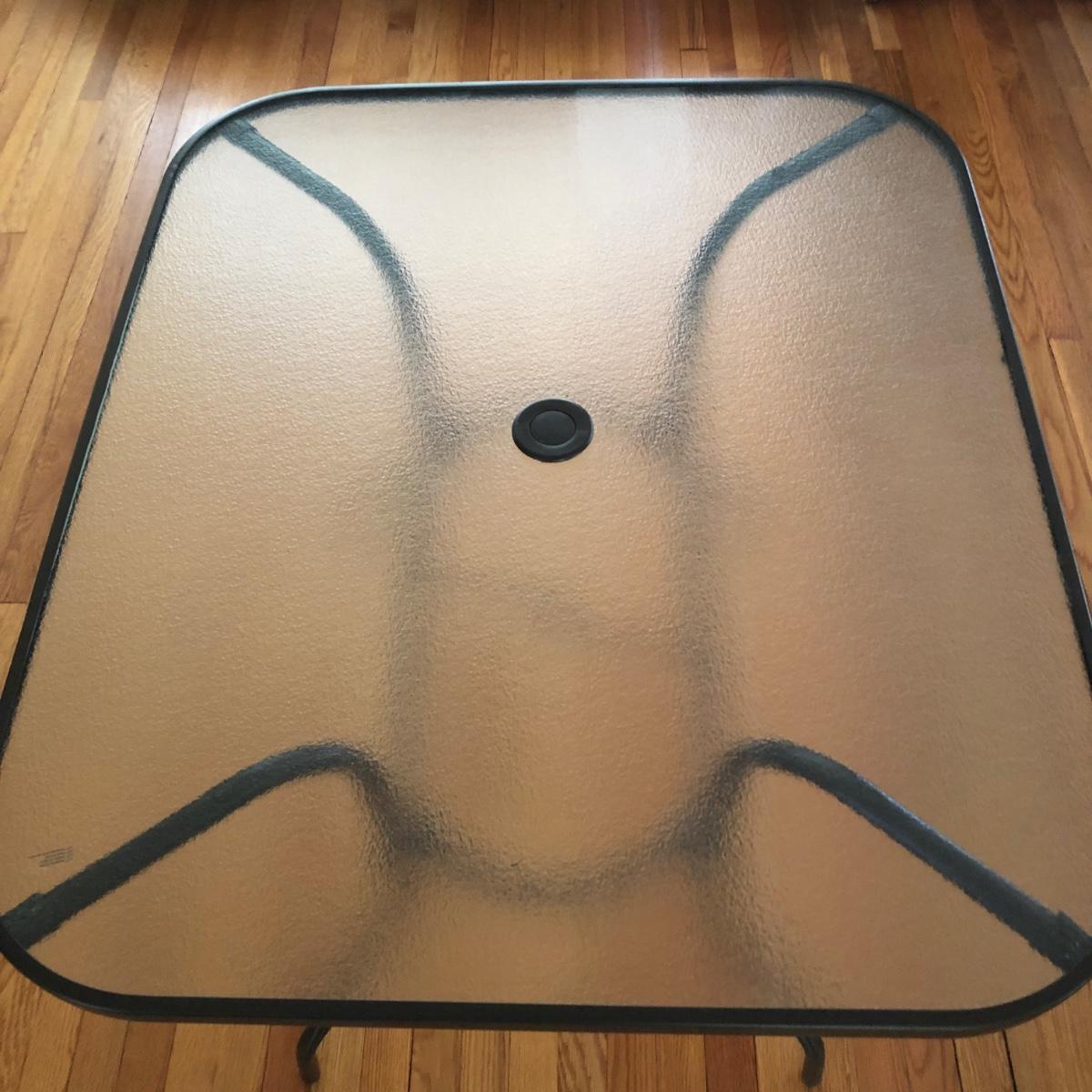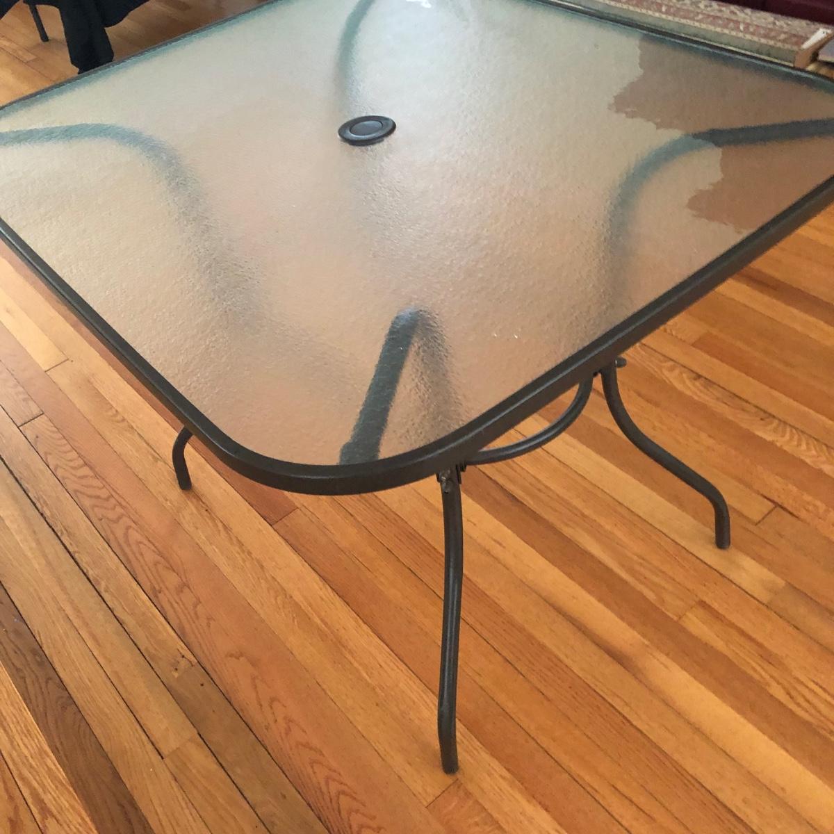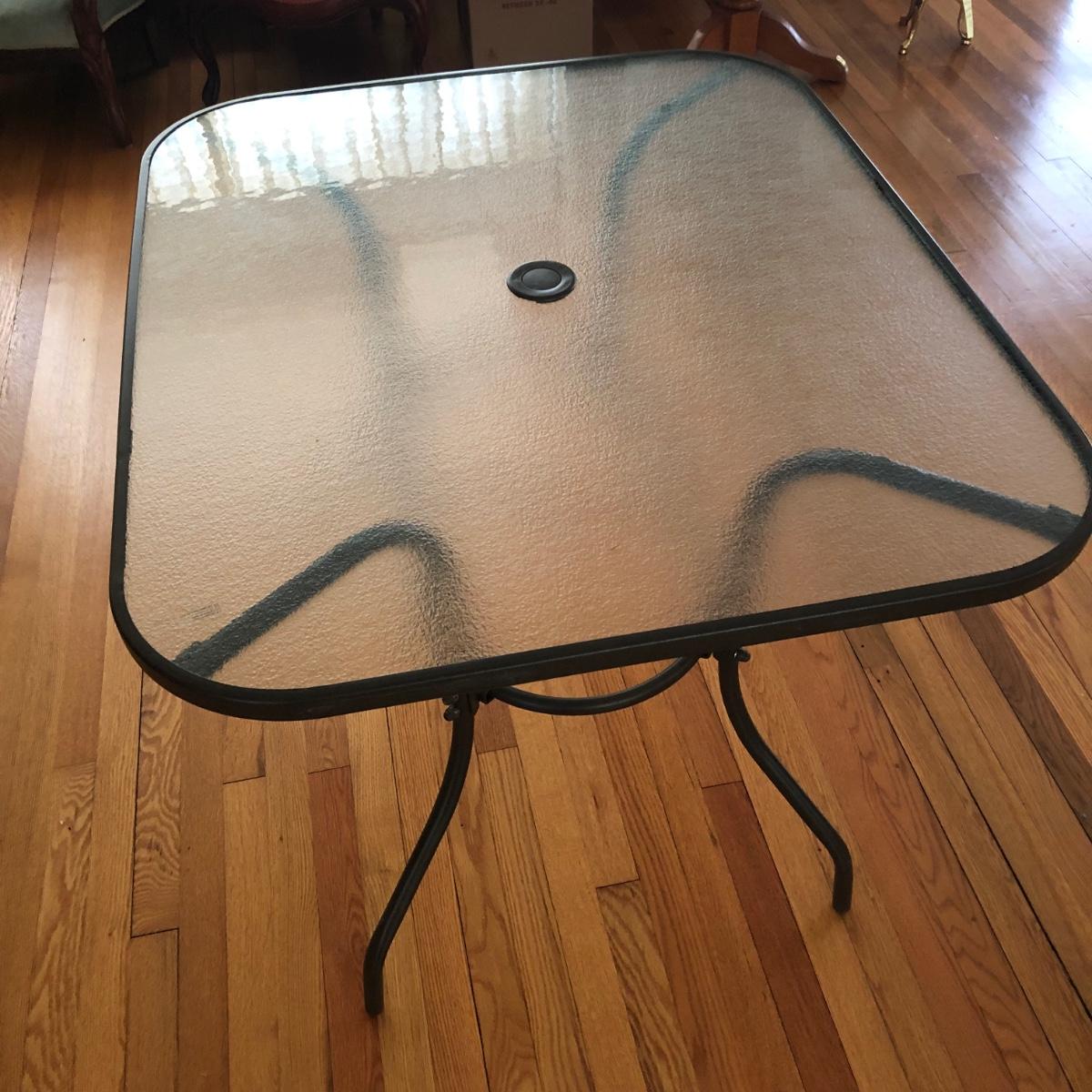This square glass top and metal table measures 38” x 32” x 28”. The table is equipped to hold an umbrella. Local pick up only.