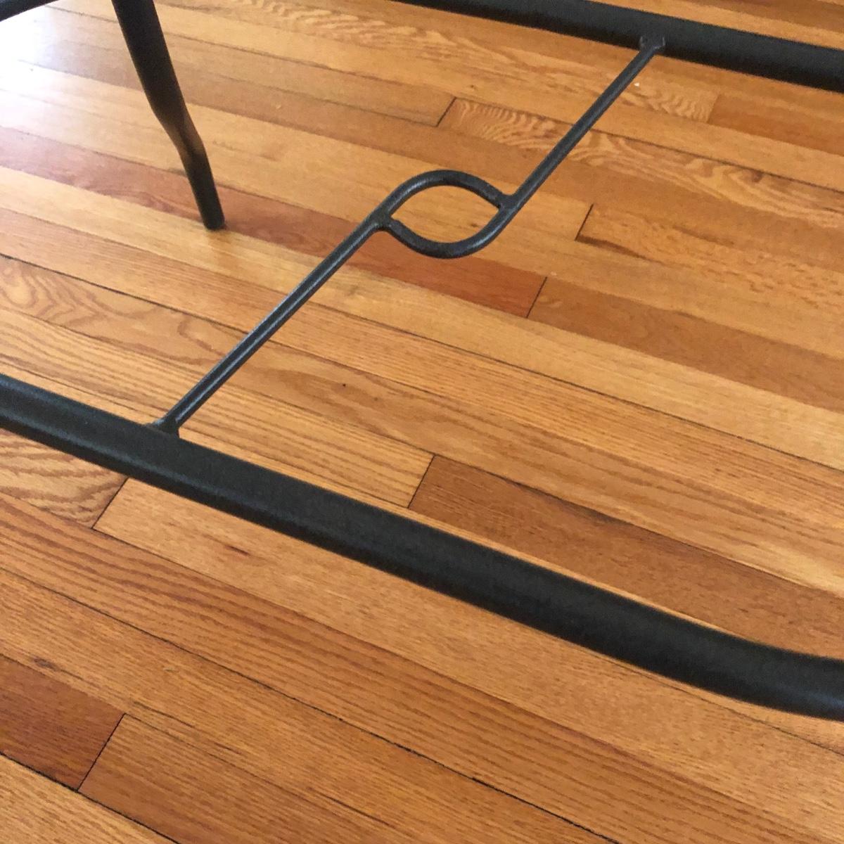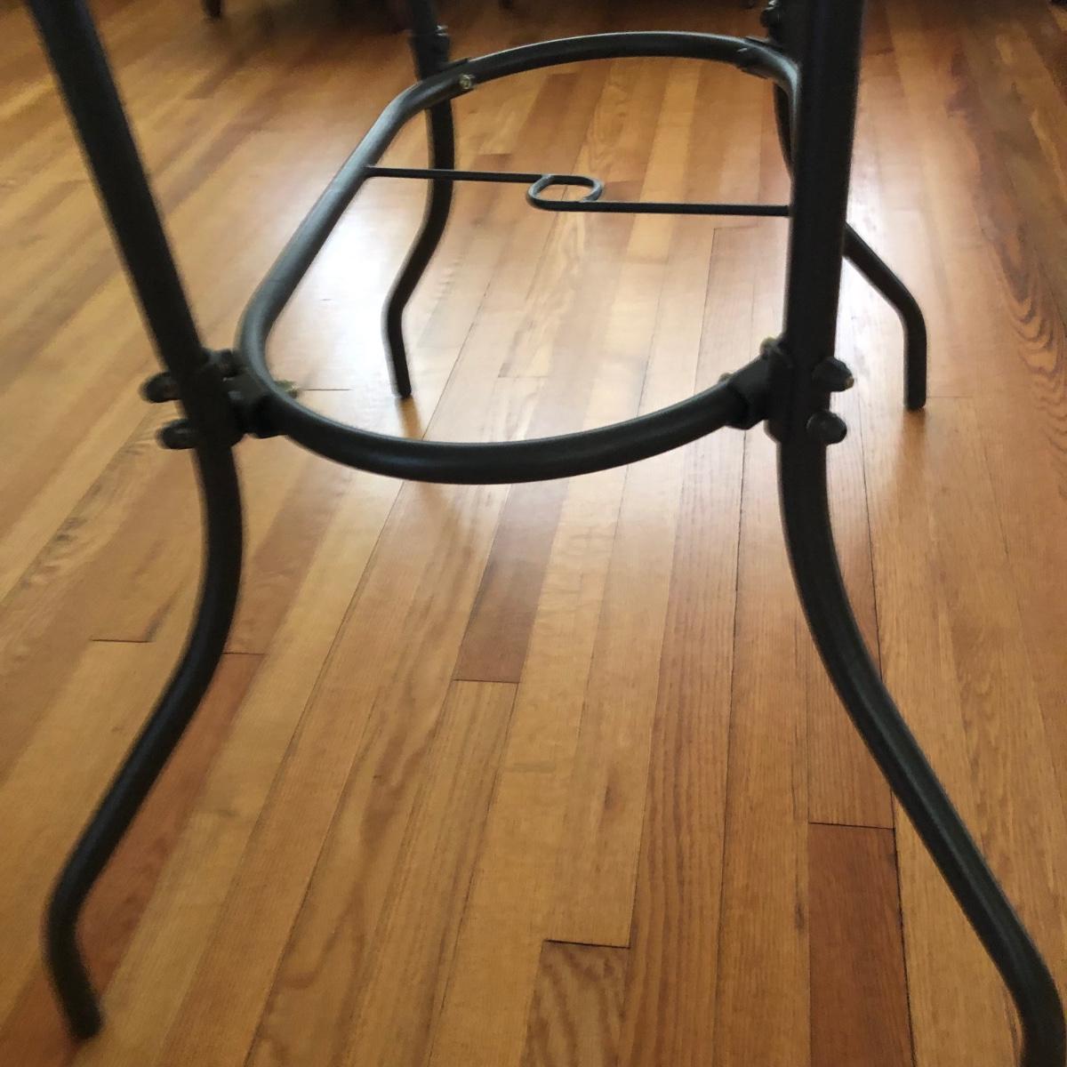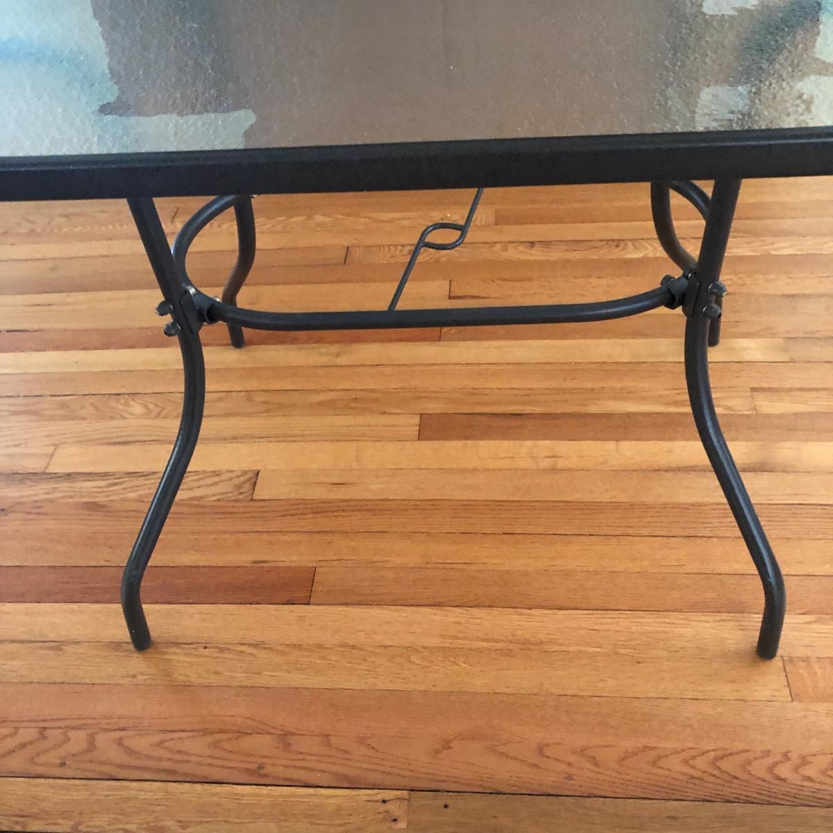 This square glass top and metal table measures 38” x 32” x 28”. The table is equipped to hold an umbrella. Local pick up only.