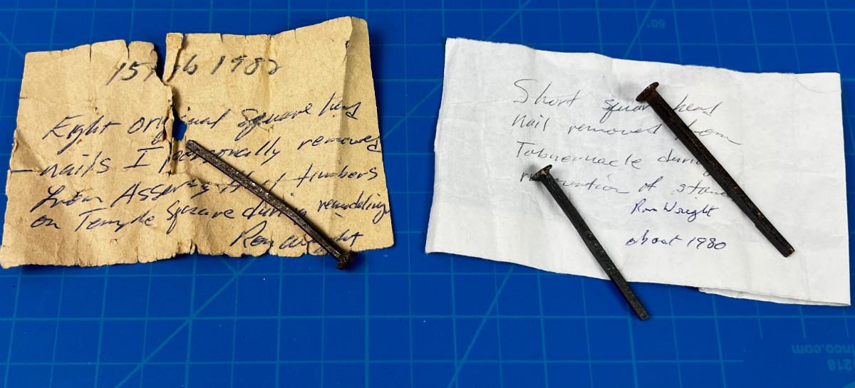Square Headed NAILS, From the SLC TEMPLE REMODELED FROM 1982 and 2 NAILS from the Tabernacle Remodel 1980.