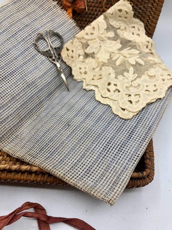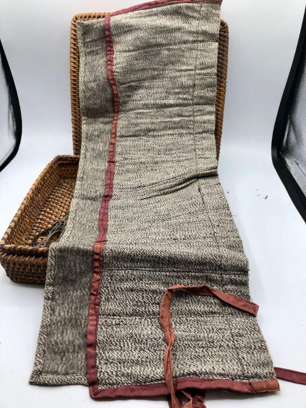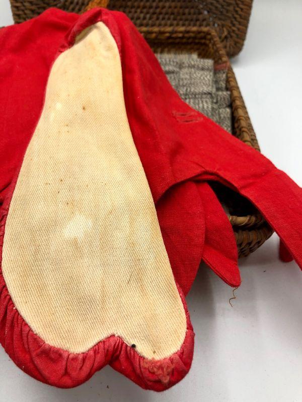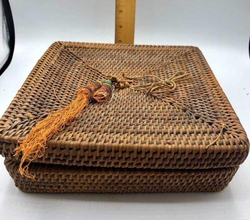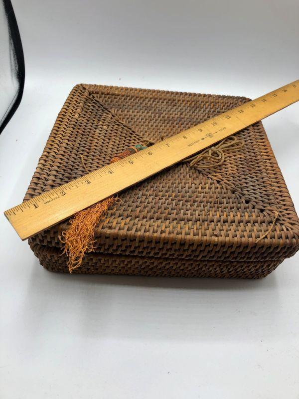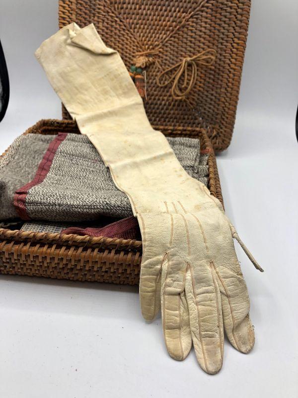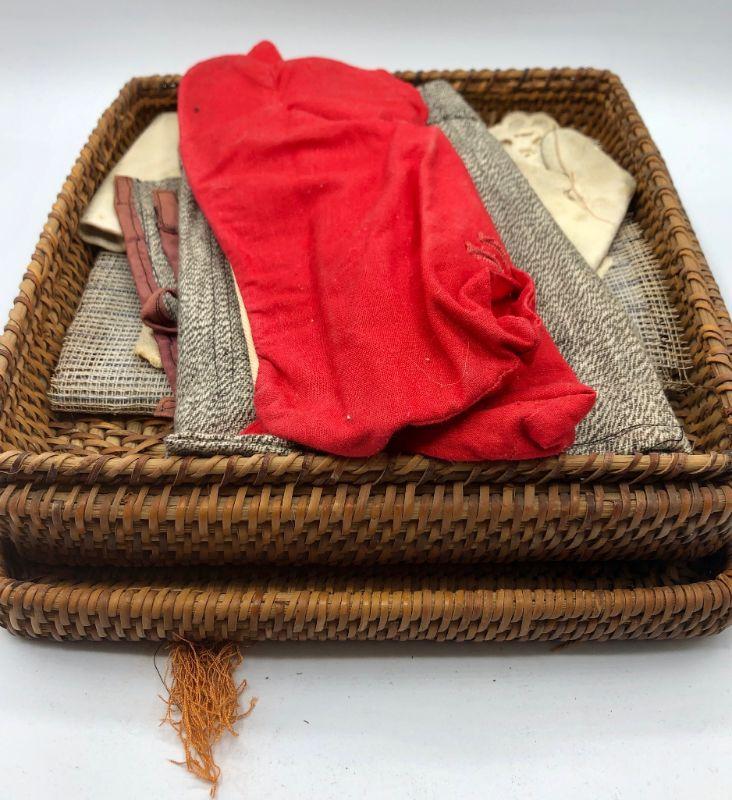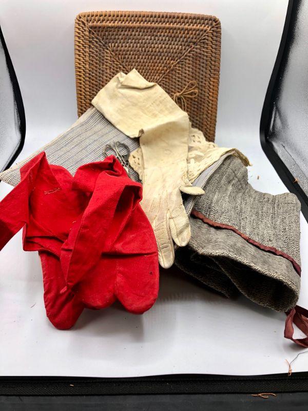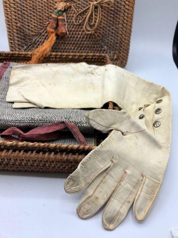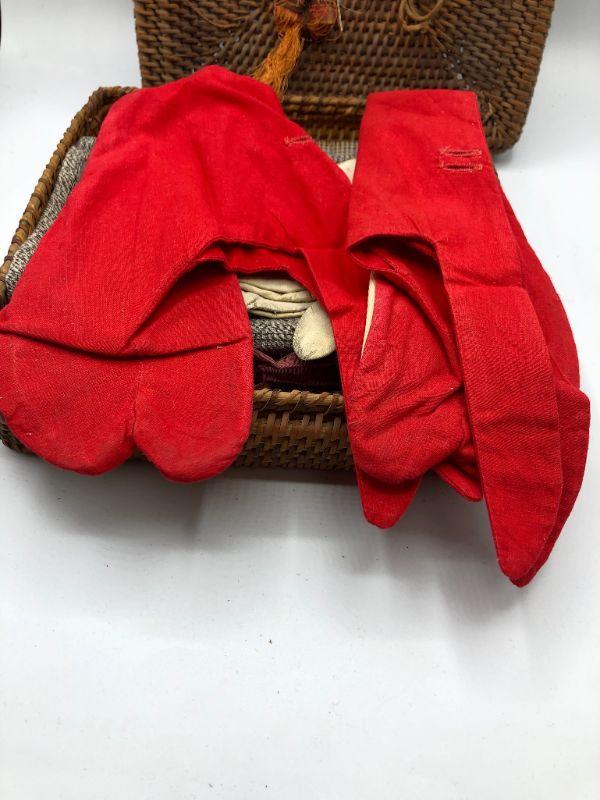 Vintage square basket with some interesting contents. Inside is an antique looking pair of scissors from Germany, a vintage leather glove, a lace doily, a silverware storage pouch, and a pair of Tabi sock slippers. Interesting combination of things in this great lidded basket.
