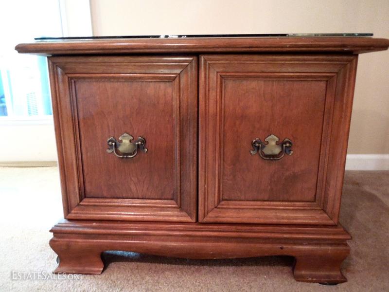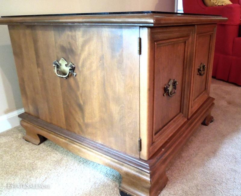 Early american style. Has glass top. No manufacturers mark. Matches all Ethan Allen. Batwing brass hardware. Contents not included. In very nice condition.