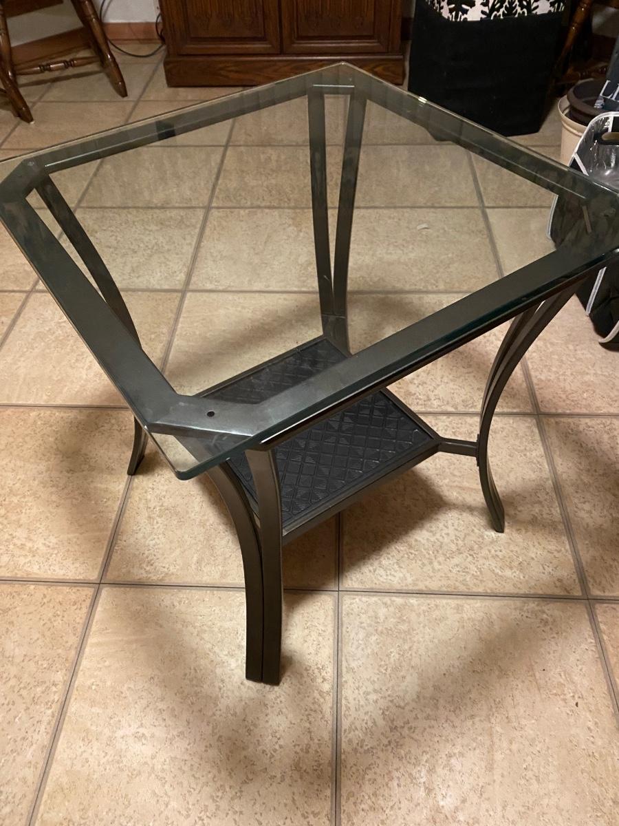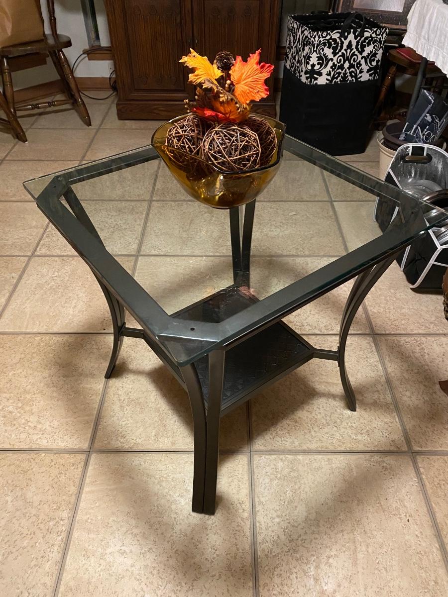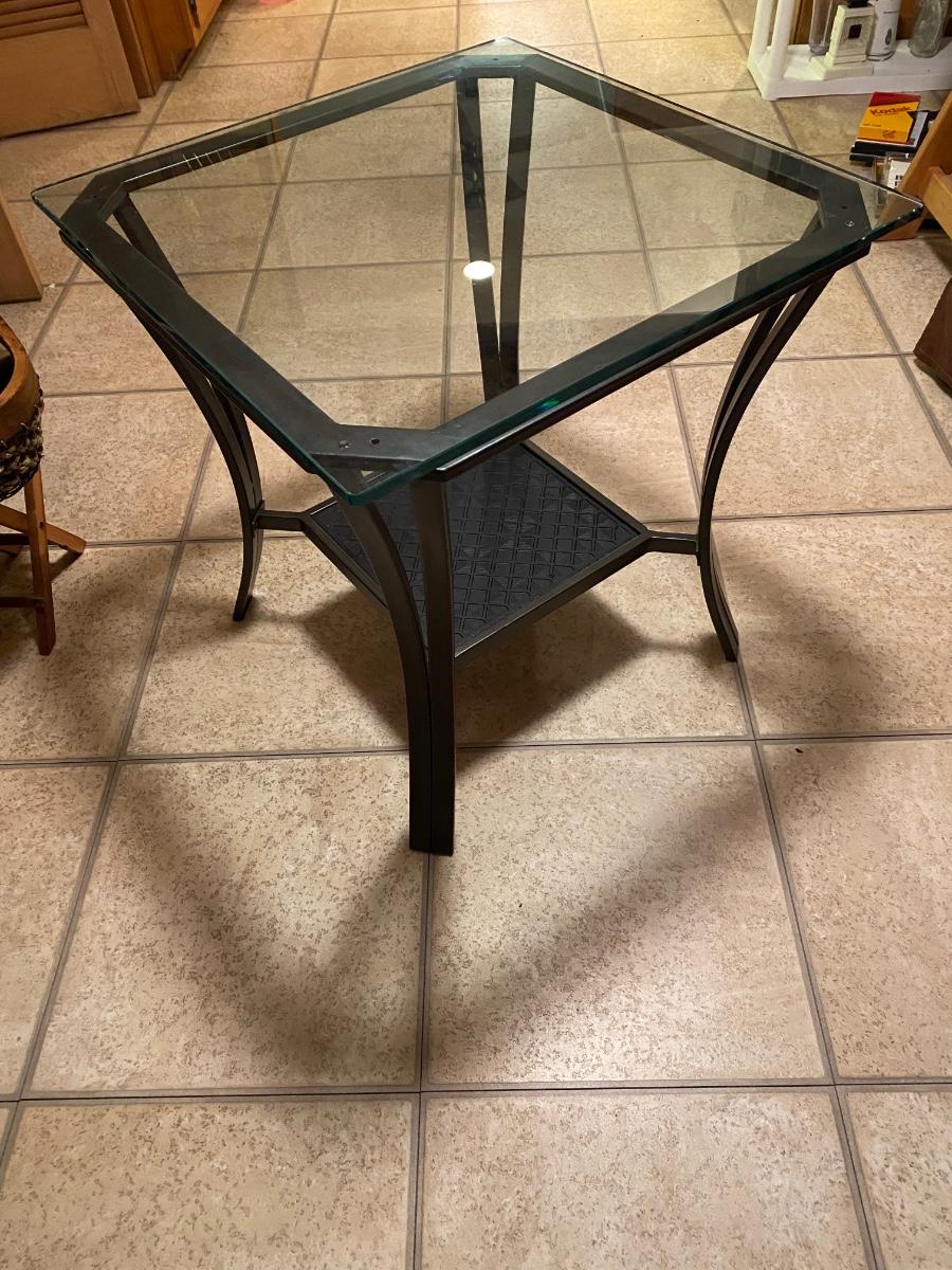 Square metal glass top table with shelf. Approx 23-1/2”w x 24”h. Excellent condition.