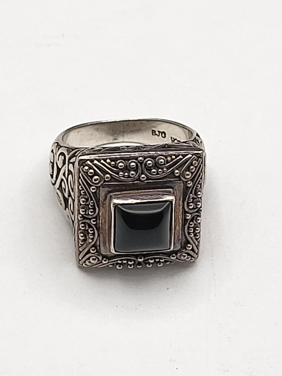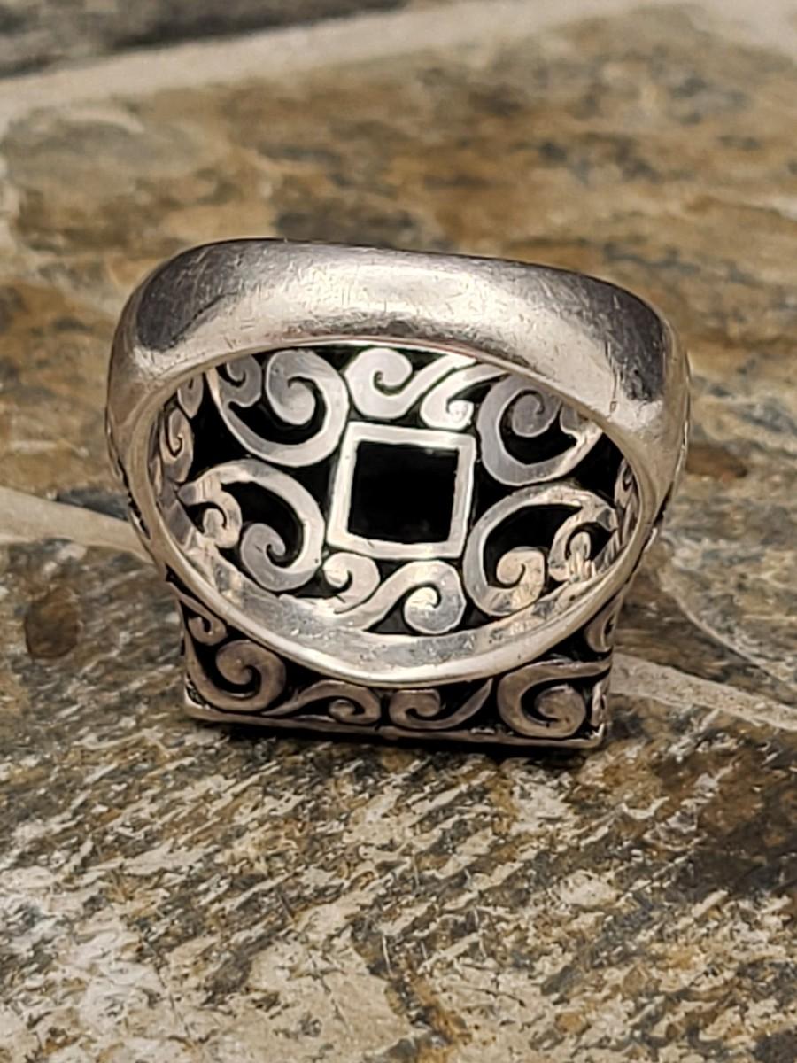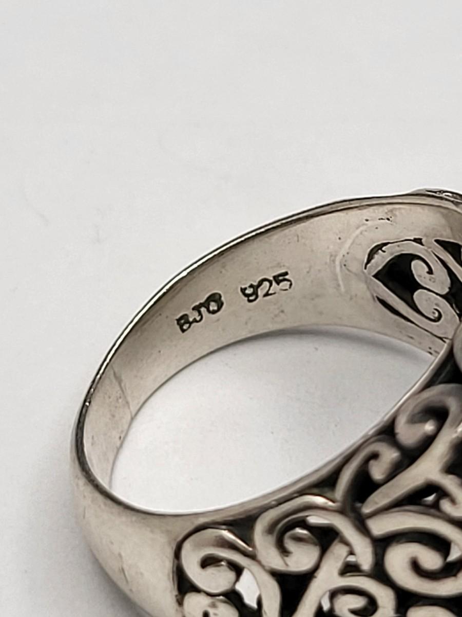 Stamped BJO 925. Scroll & open work. The inside of the ring is also fully finished, making it very comfortable to wear. It is a size 7. Total weight is 10.1 grams.