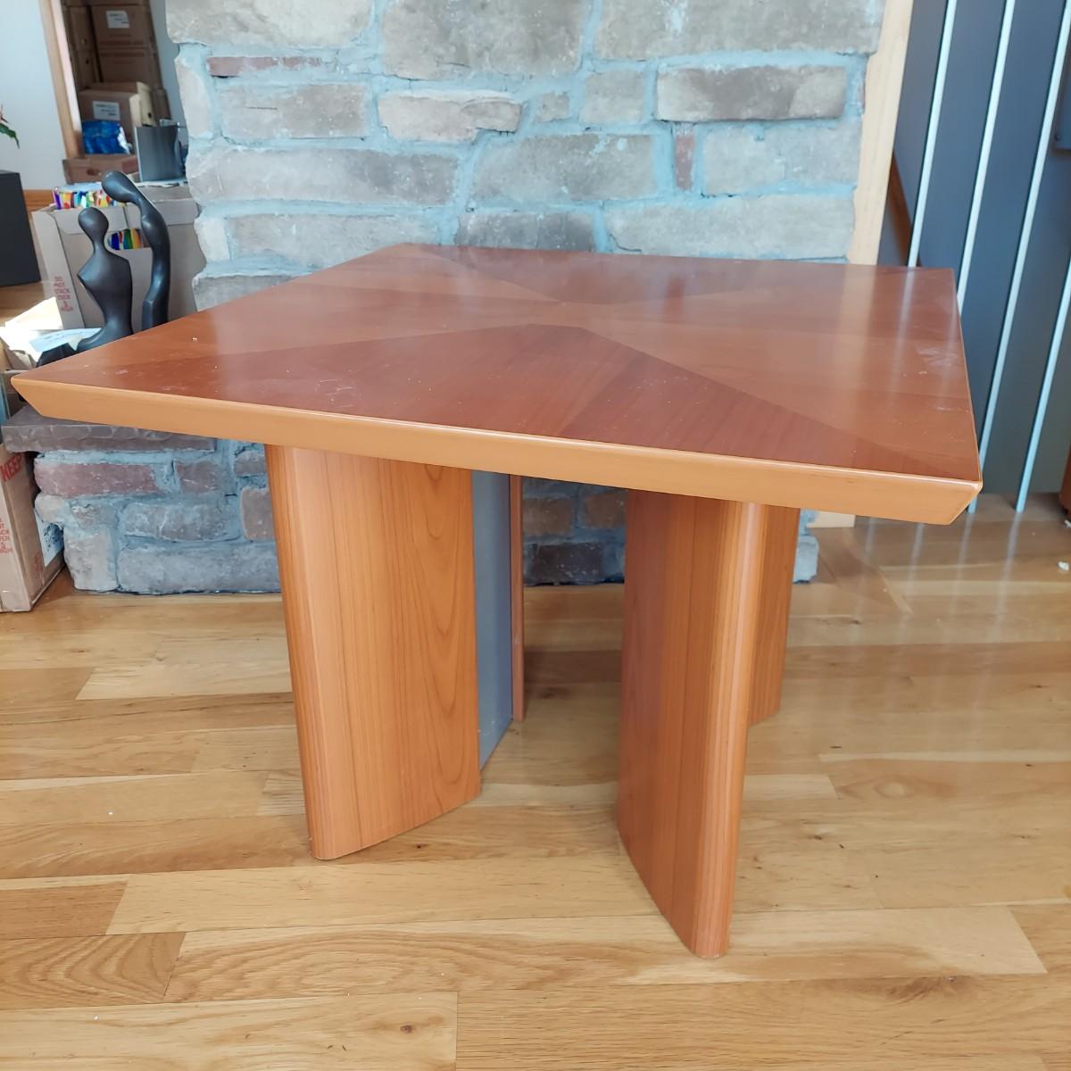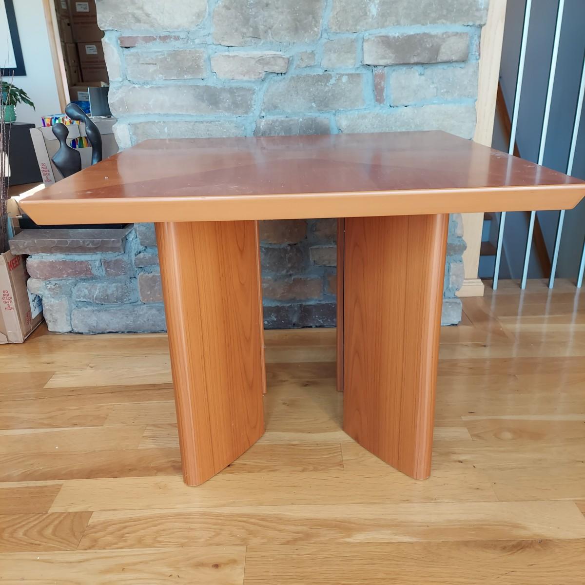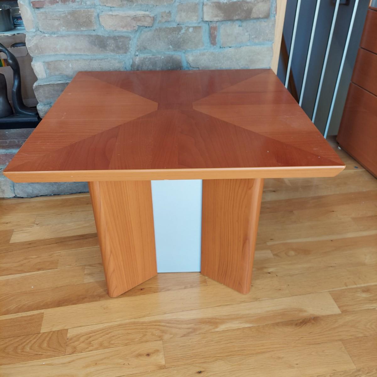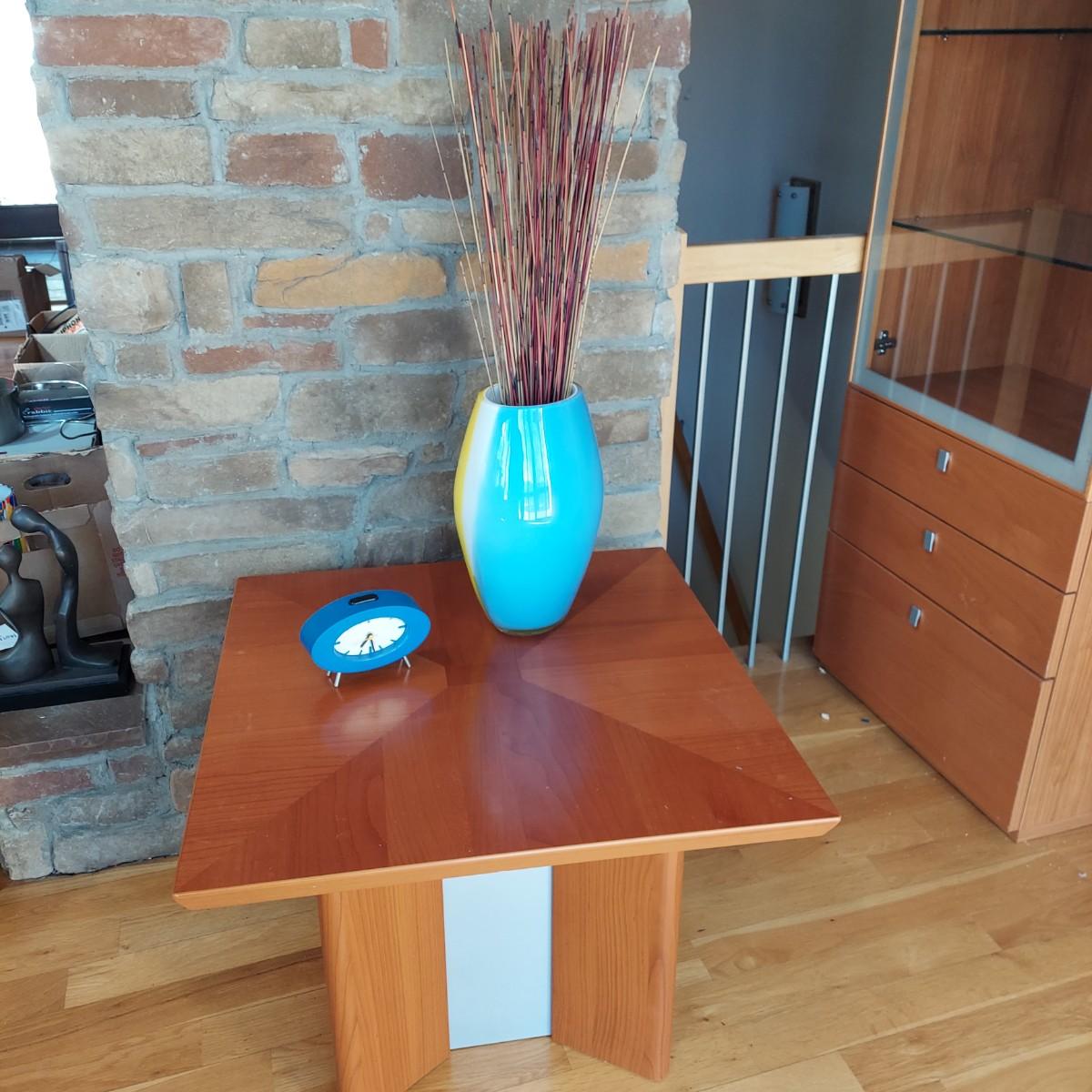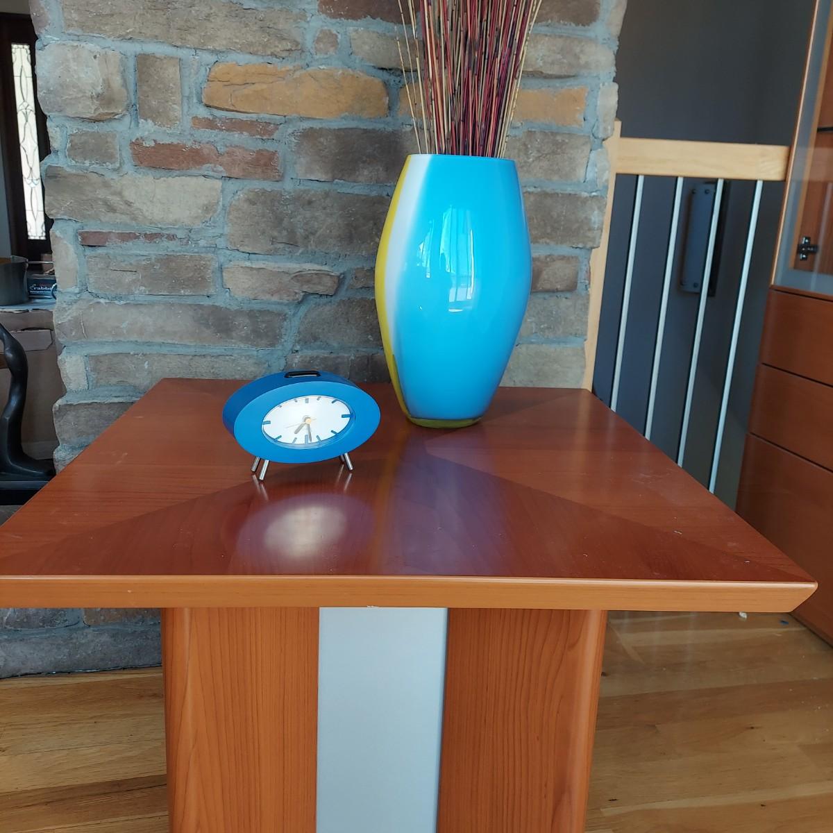 Side table is wood with a vaneer style finish. There is a square top and x style base with metal accents. It is stamped made in Italy on bottom. It is 27.5" square and 21.5"H. There is also a blue plastic retro style Quartz clock and a large blown glass vase. The vase is yellow and blue and measures approximately 9 x 7 x 14"H. Clock needs a AA batteries and was not tested. Local Pickup Only.
