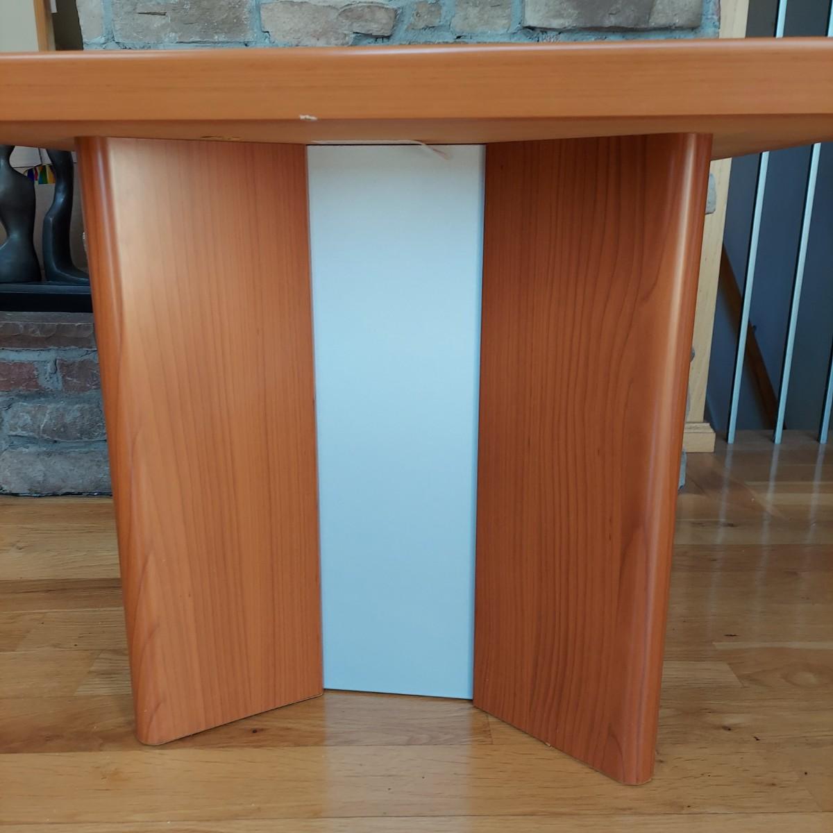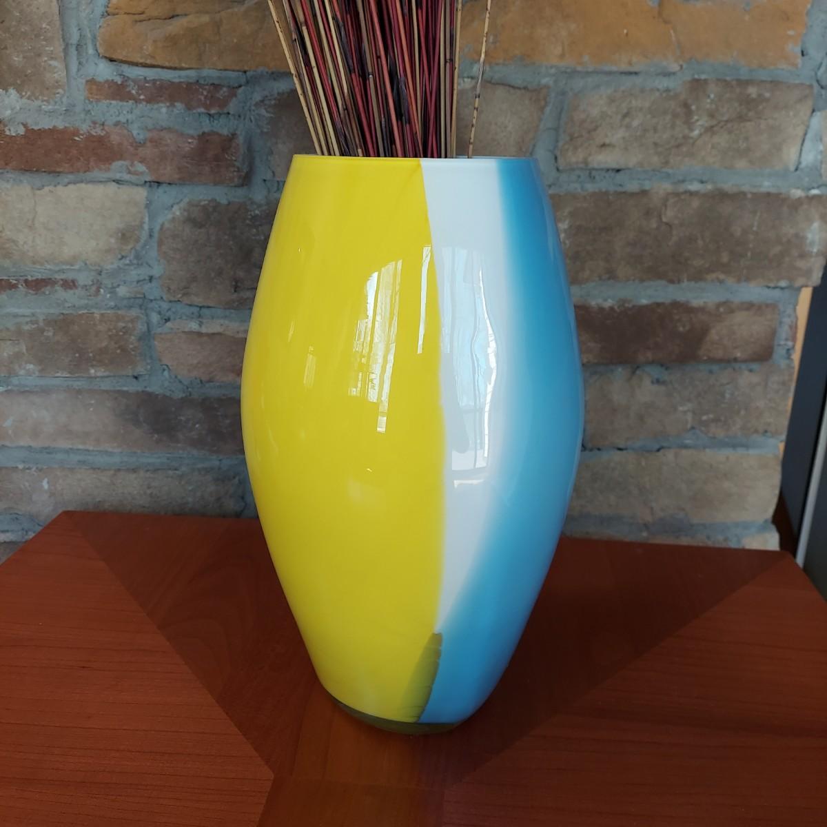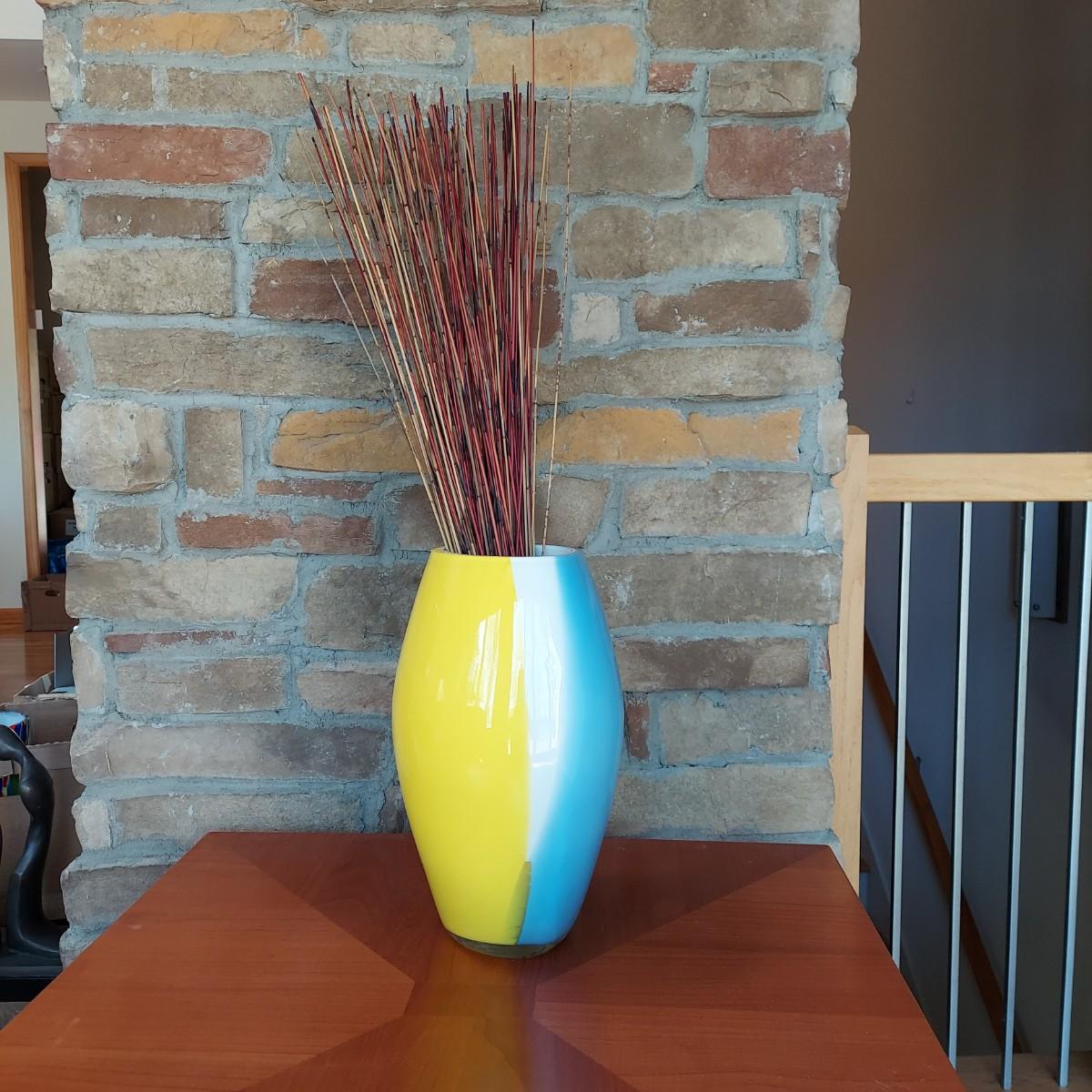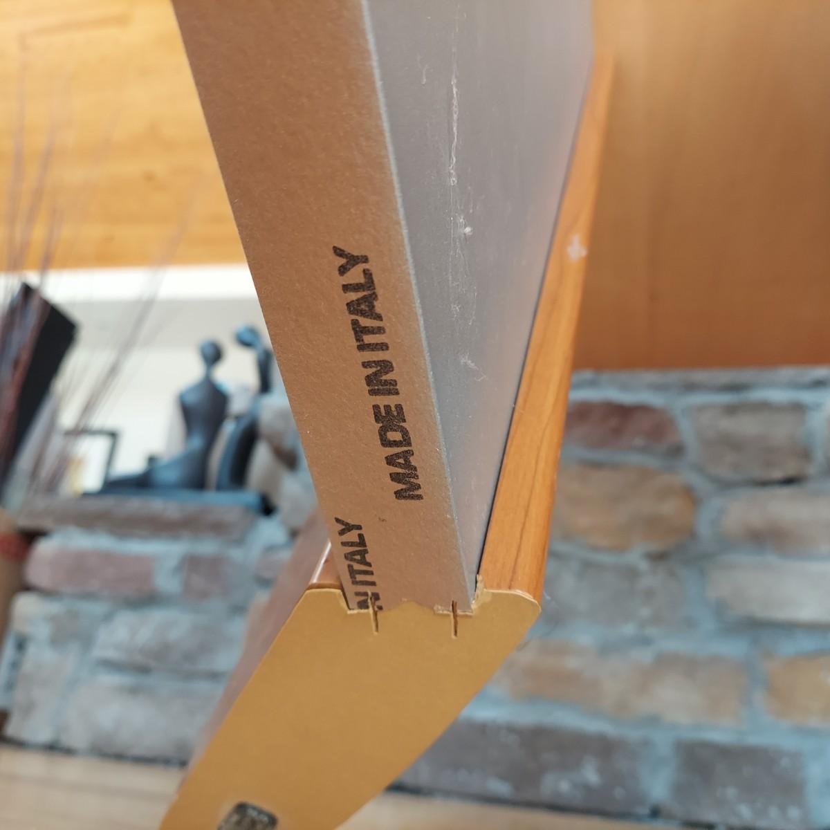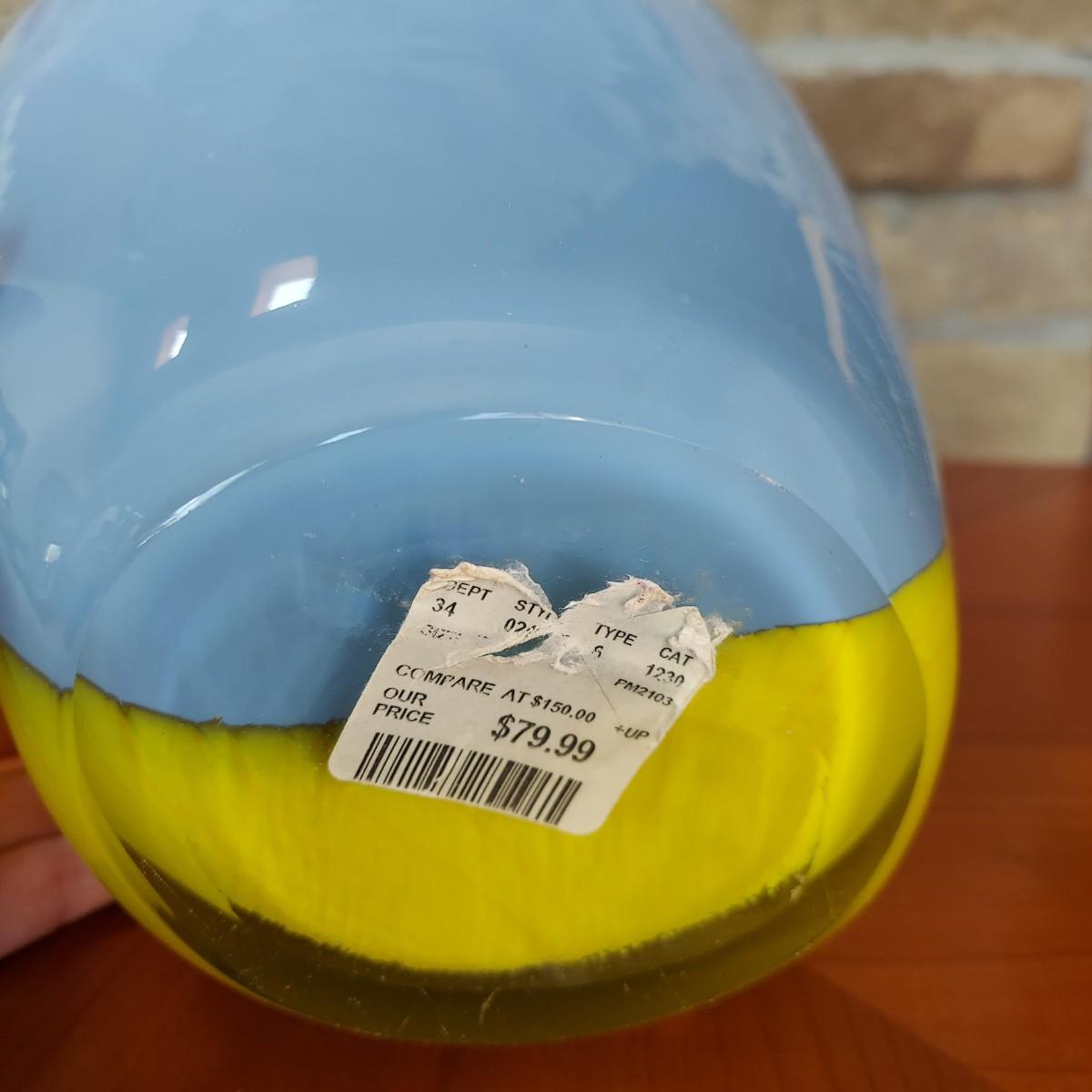 Side table is wood with a vaneer style finish. There is a square top and x style base with metal accents. It is stamped made in Italy on bottom. It is 27.5" square and 21.5"H. There is also a blue plastic retro style Quartz clock and a large blown glass vase. The vase is yellow and blue and measures approximately 9 x 7 x 14"H. Clock needs a AA batteries and was not tested. Local Pickup Only.