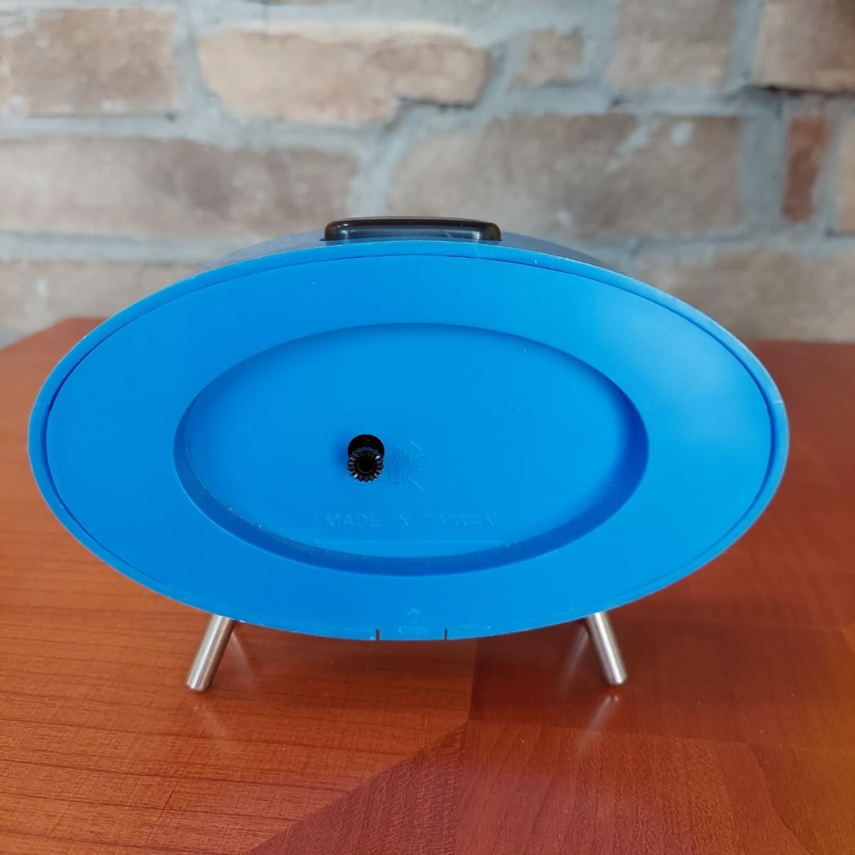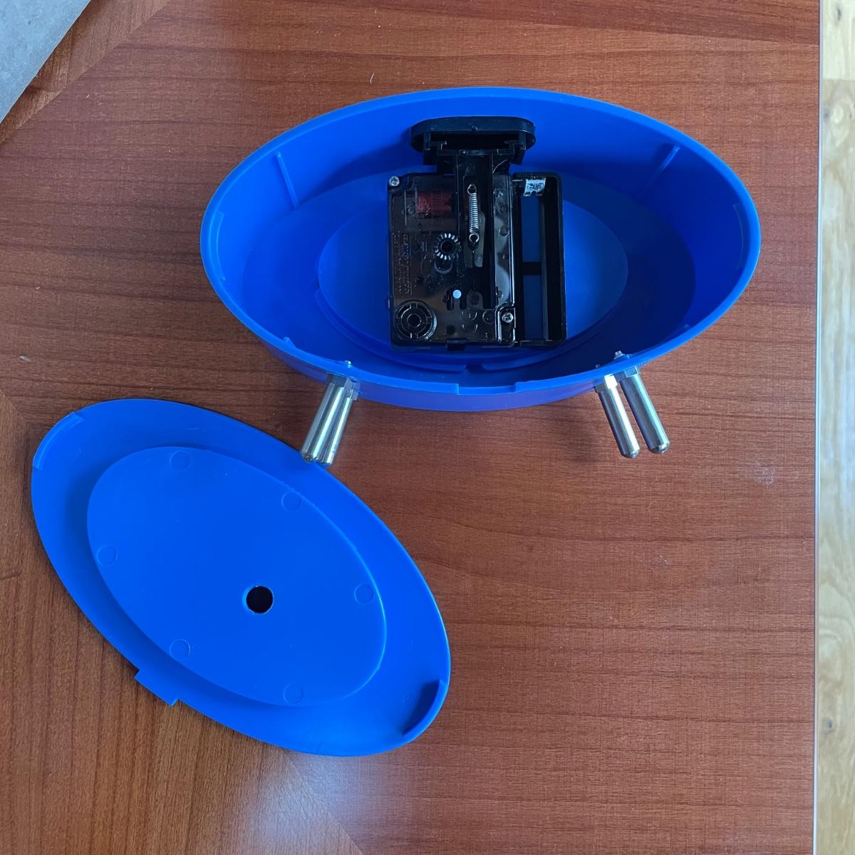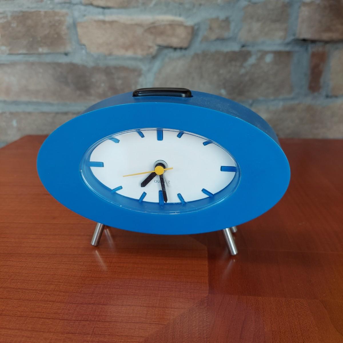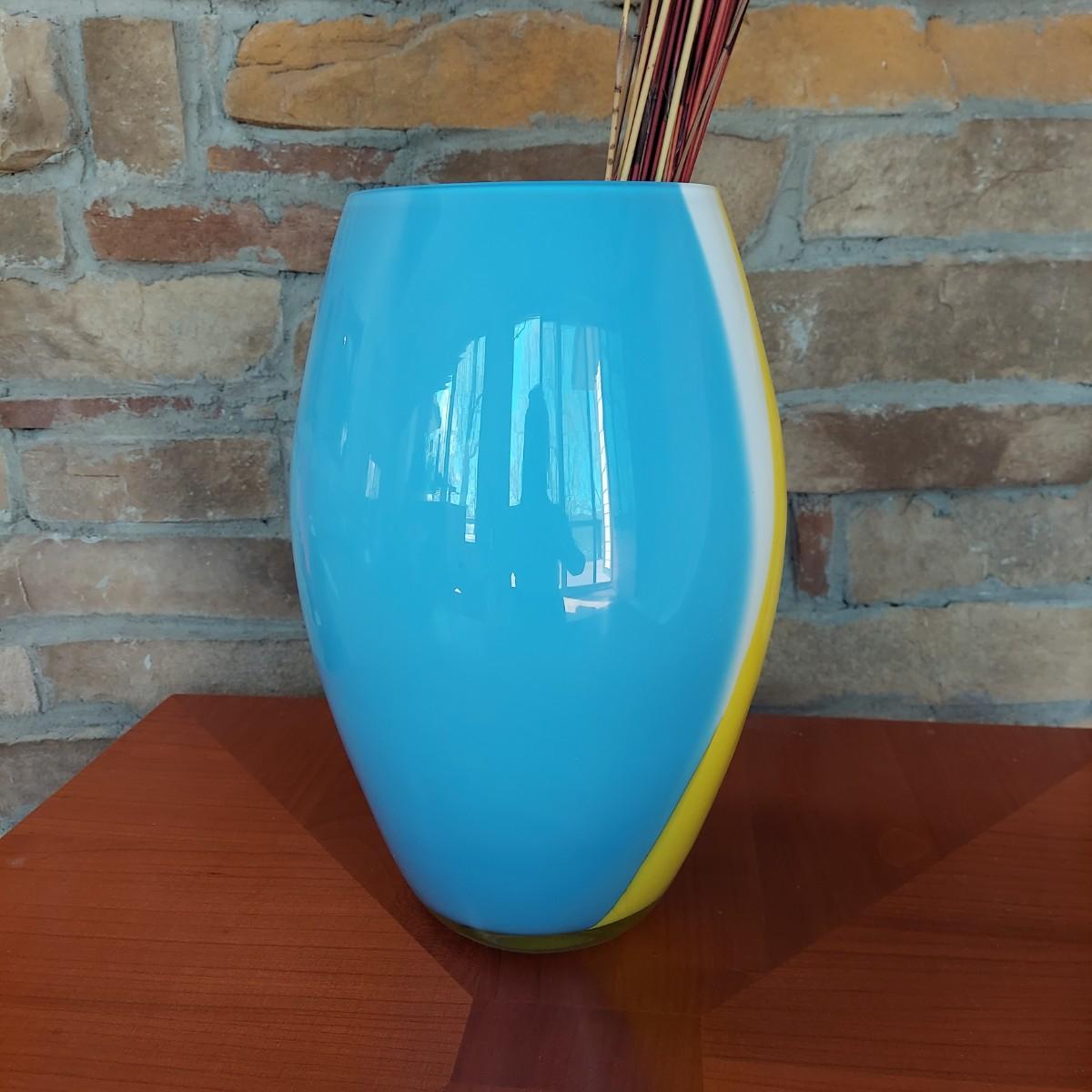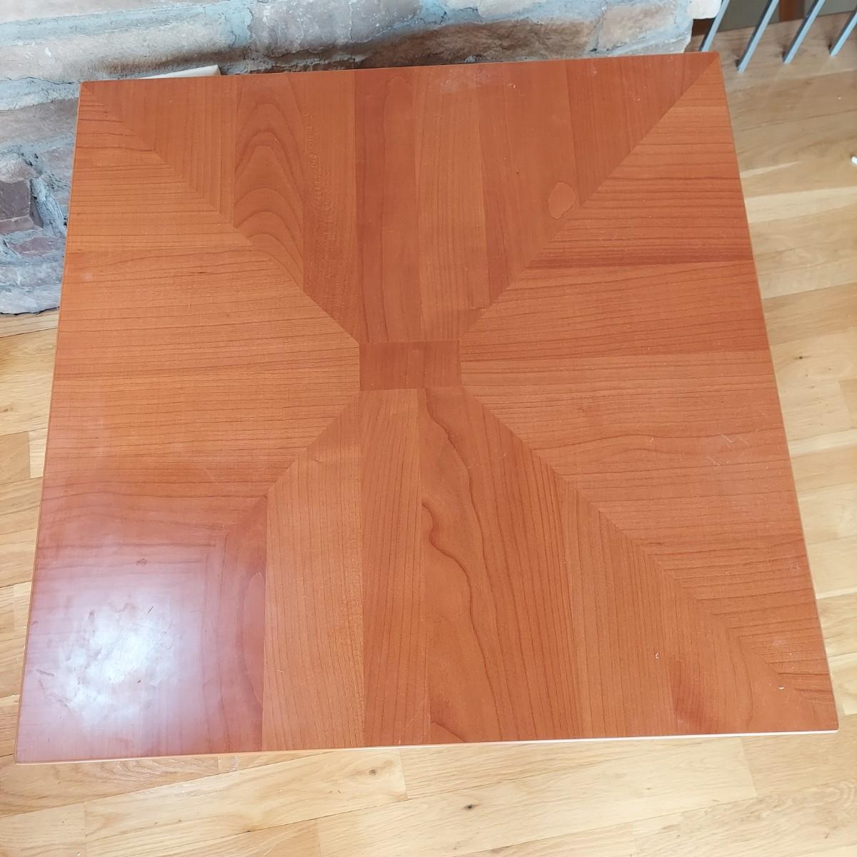 Side table is wood with a vaneer style finish. There is a square top and x style base with metal accents. It is stamped made in Italy on bottom. It is 27.5" square and 21.5"H. There is also a blue plastic retro style Quartz clock and a large blown glass vase. The vase is yellow and blue and measures approximately 9 x 7 x 14"H. Clock needs a AA batteries and was not tested. Local Pickup Only.