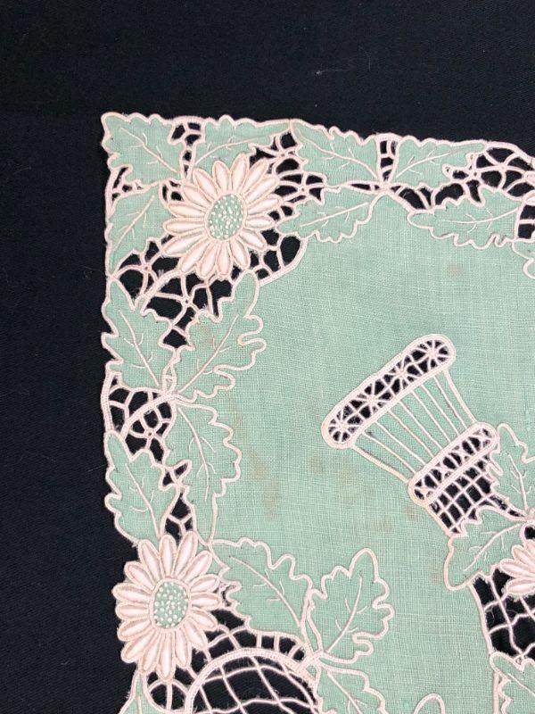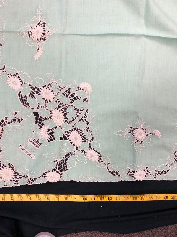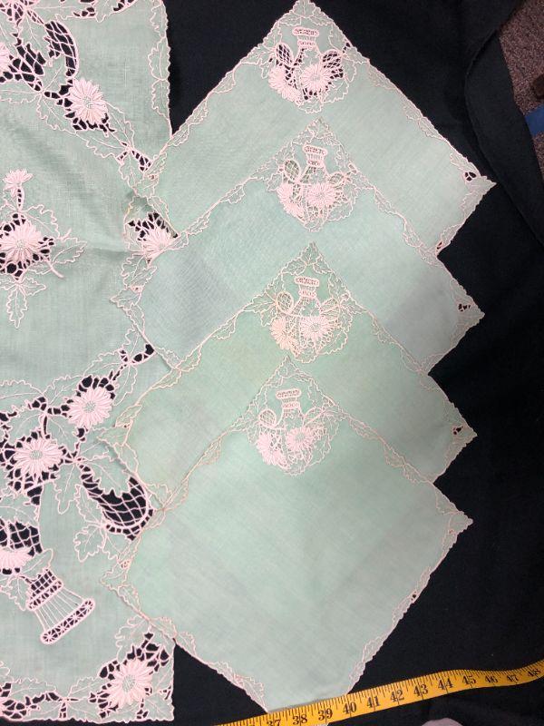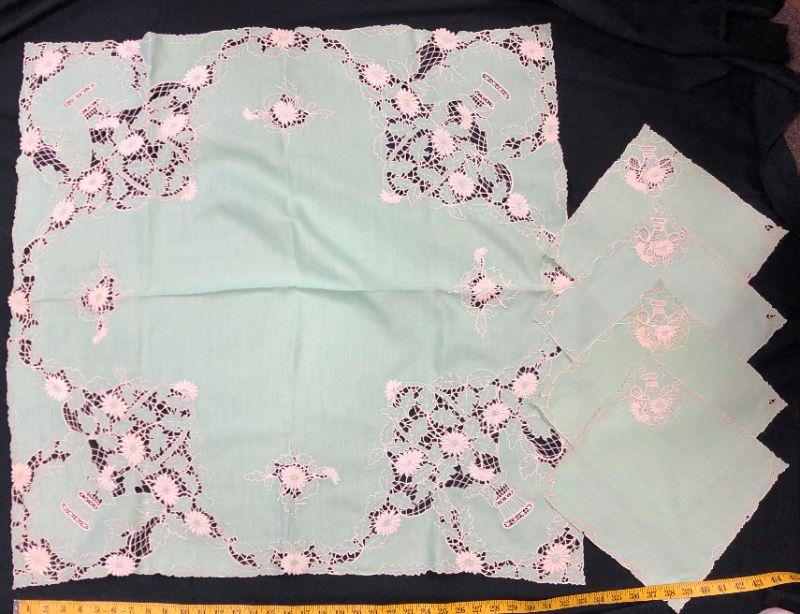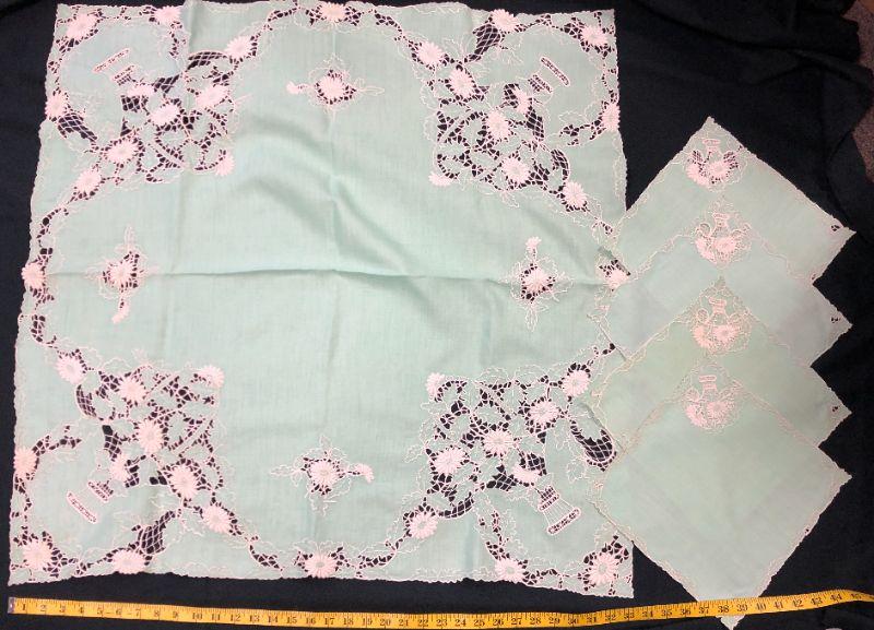 Vintage tablecloth and napkin set. Mint green with white embroidered lace cut outs . Light discoloration/ spots from age and use. No holes. Tablecloth is 34" square, the napkins are 10".