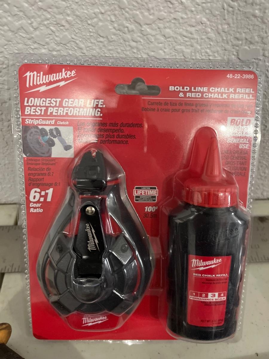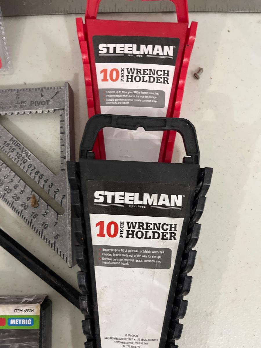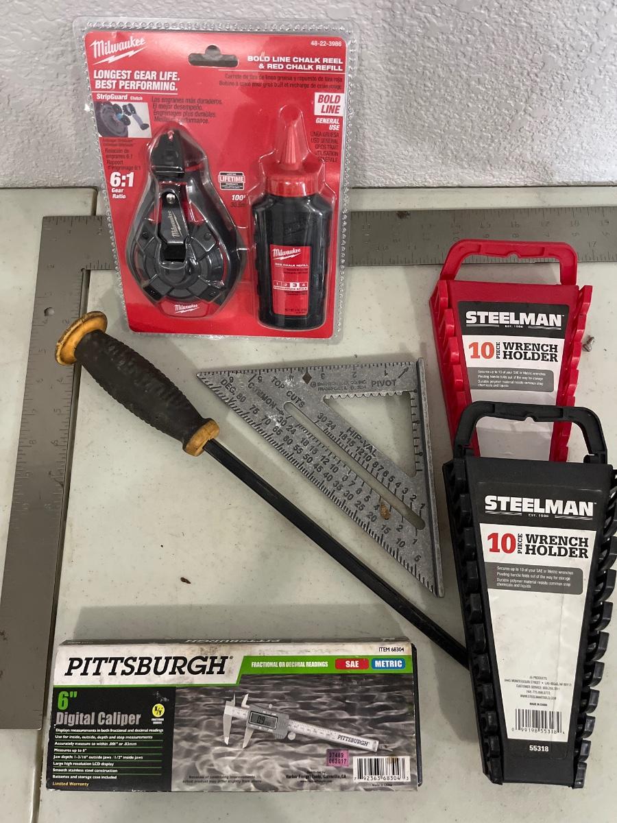 Square, triangle, chalk, reel, wrench holders, and caliper