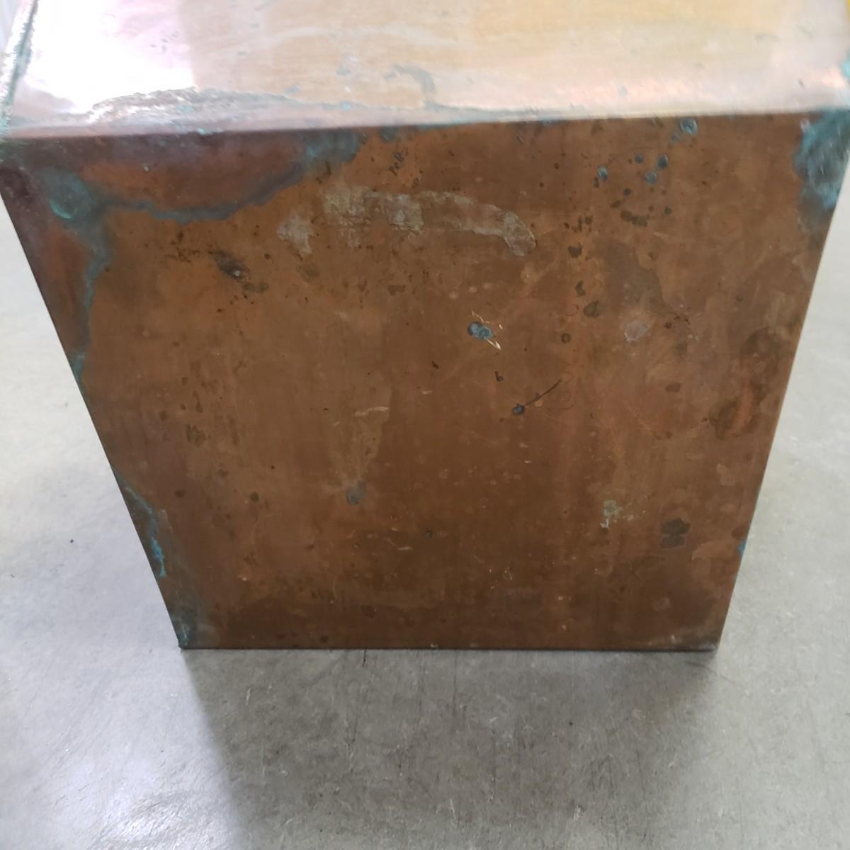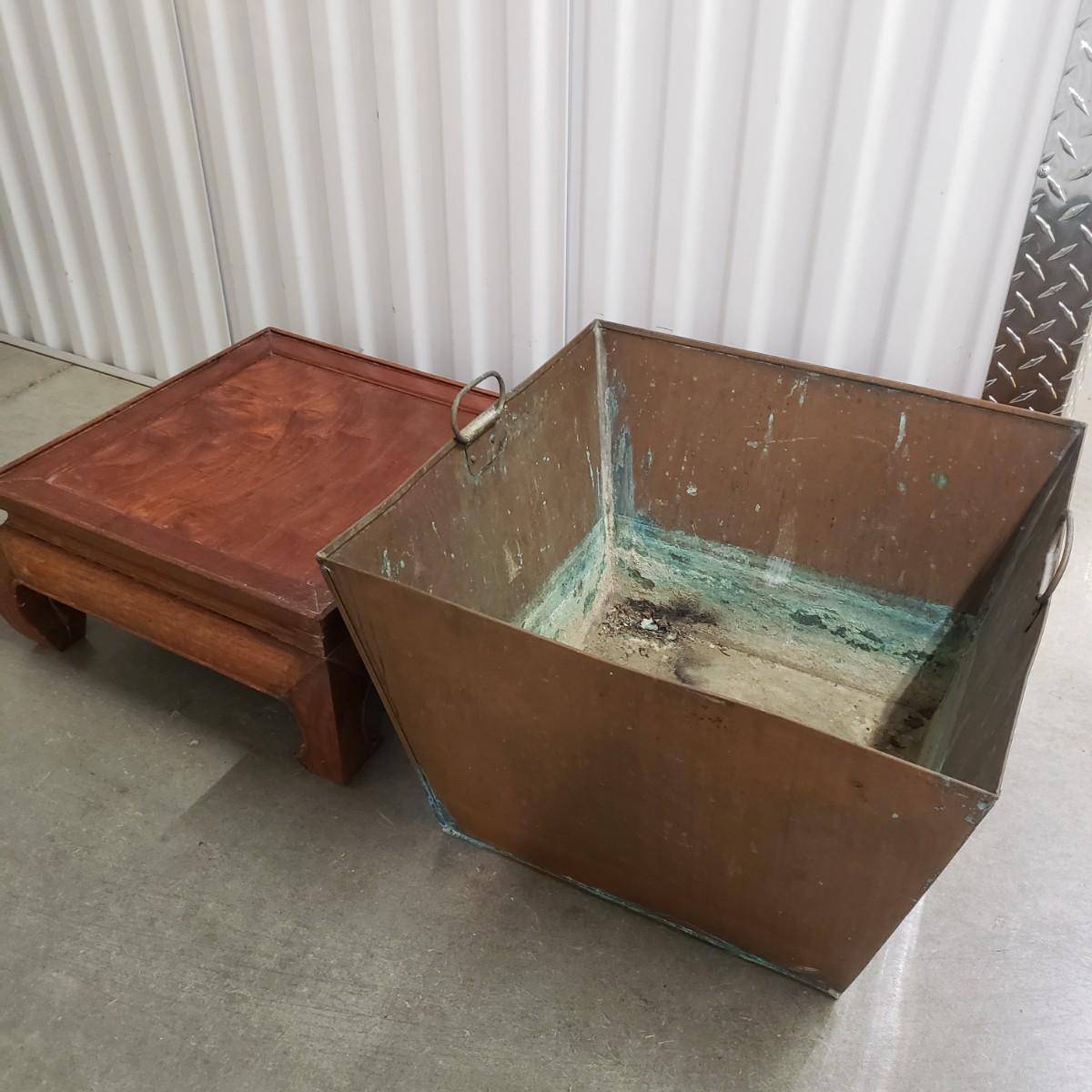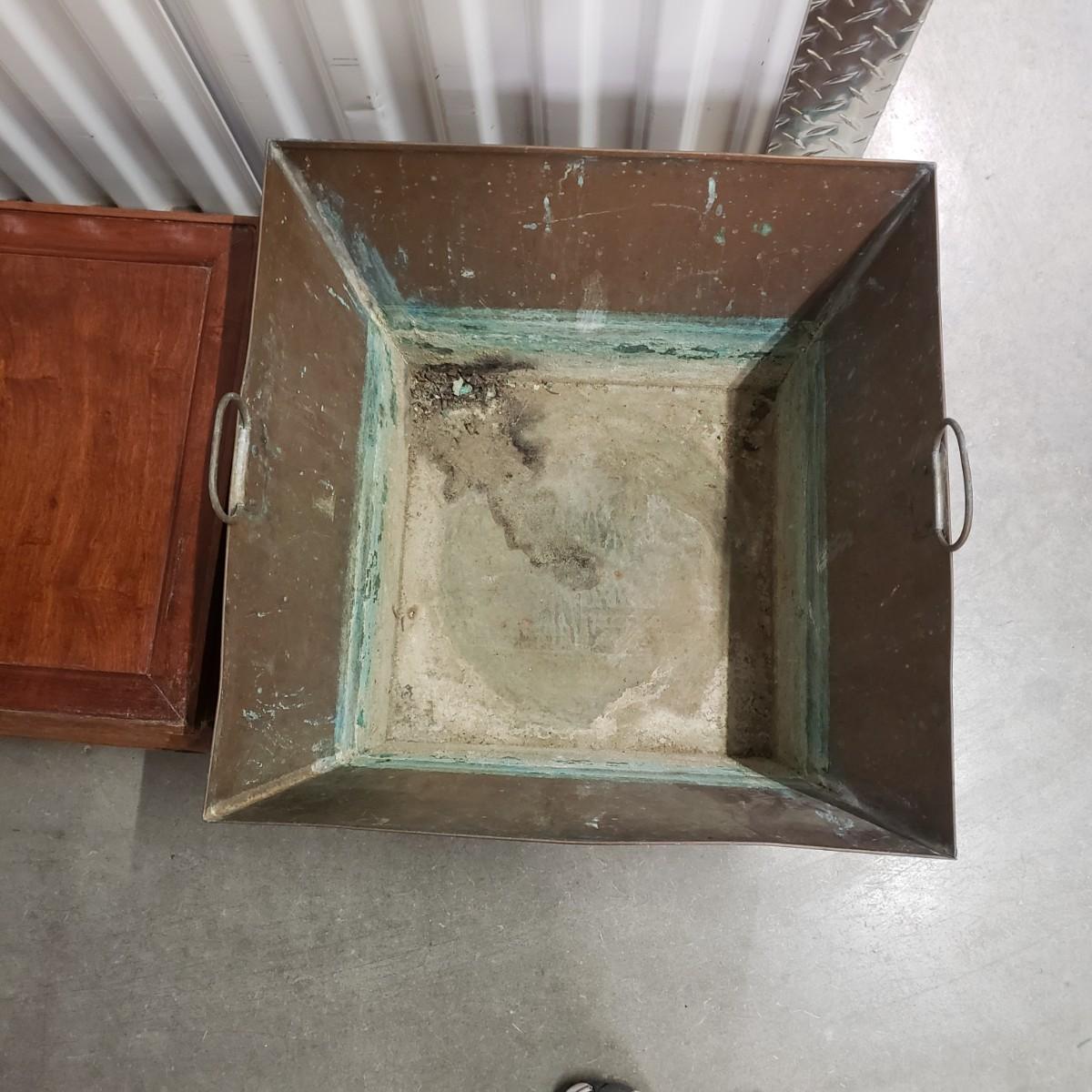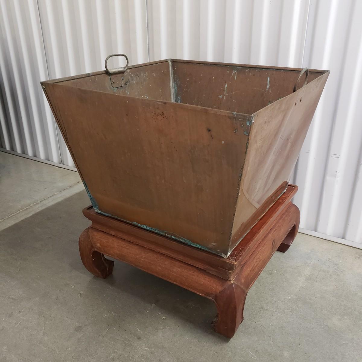 This square copper bin appears to be a planter on a wooden stand with Asian accents. The piece measures 18" x 18" x 20" all together. The wooden stand measures 17" x 17" x 8"H. There is some copper color changes on the inside of the bin. Please see photos for details.
