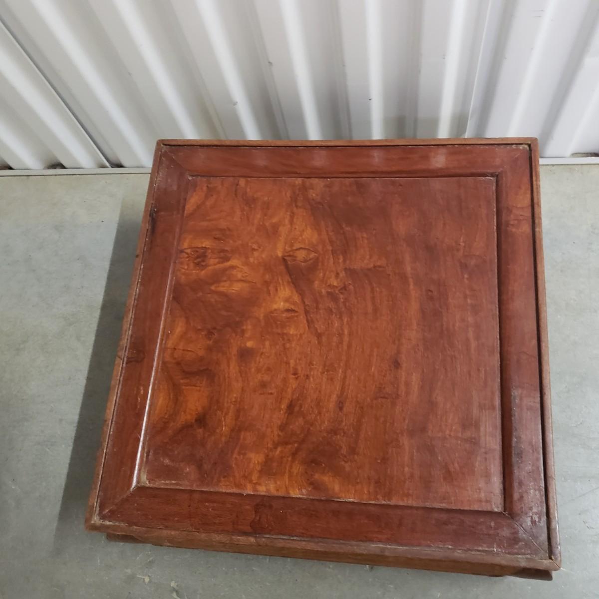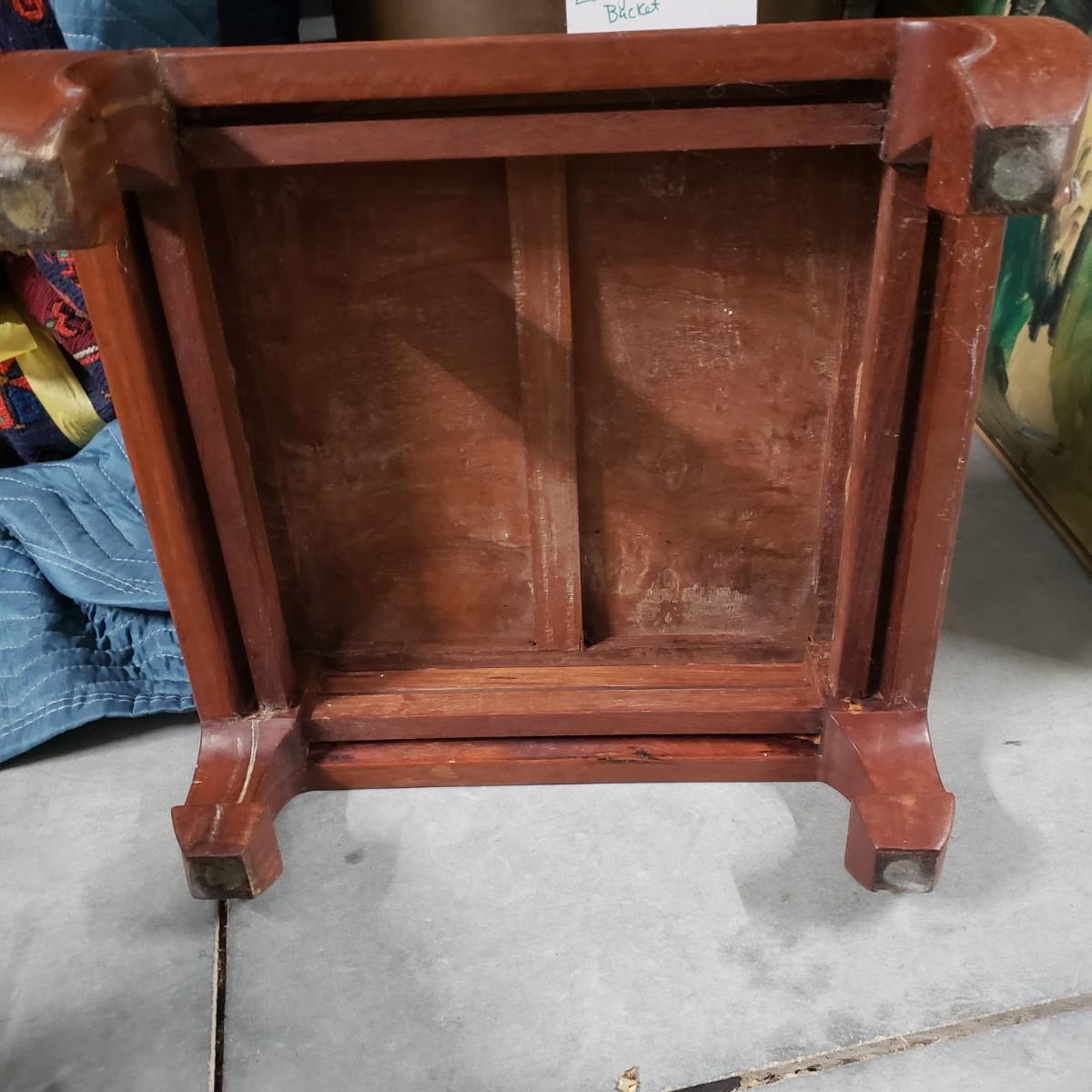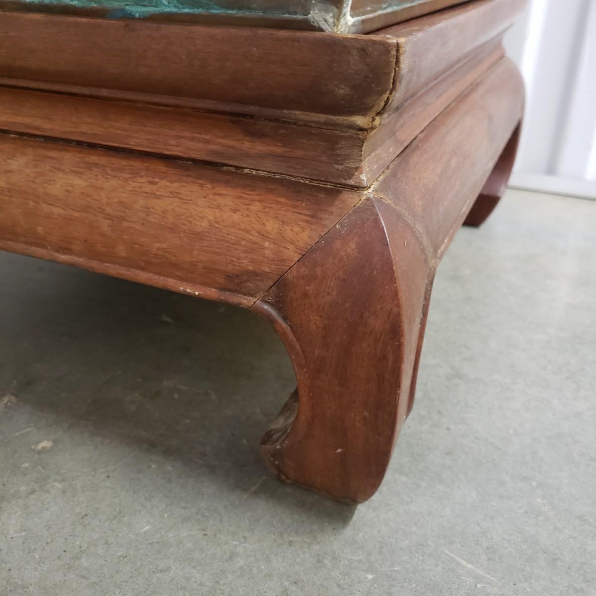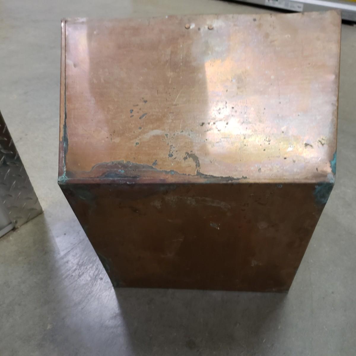 This square copper bin appears to be a planter on a wooden stand with Asian accents. The piece measures 18" x 18" x 20" all together. The wooden stand measures 17" x 17" x 8"H. There is some copper color changes on the inside of the bin. Please see photos for details.