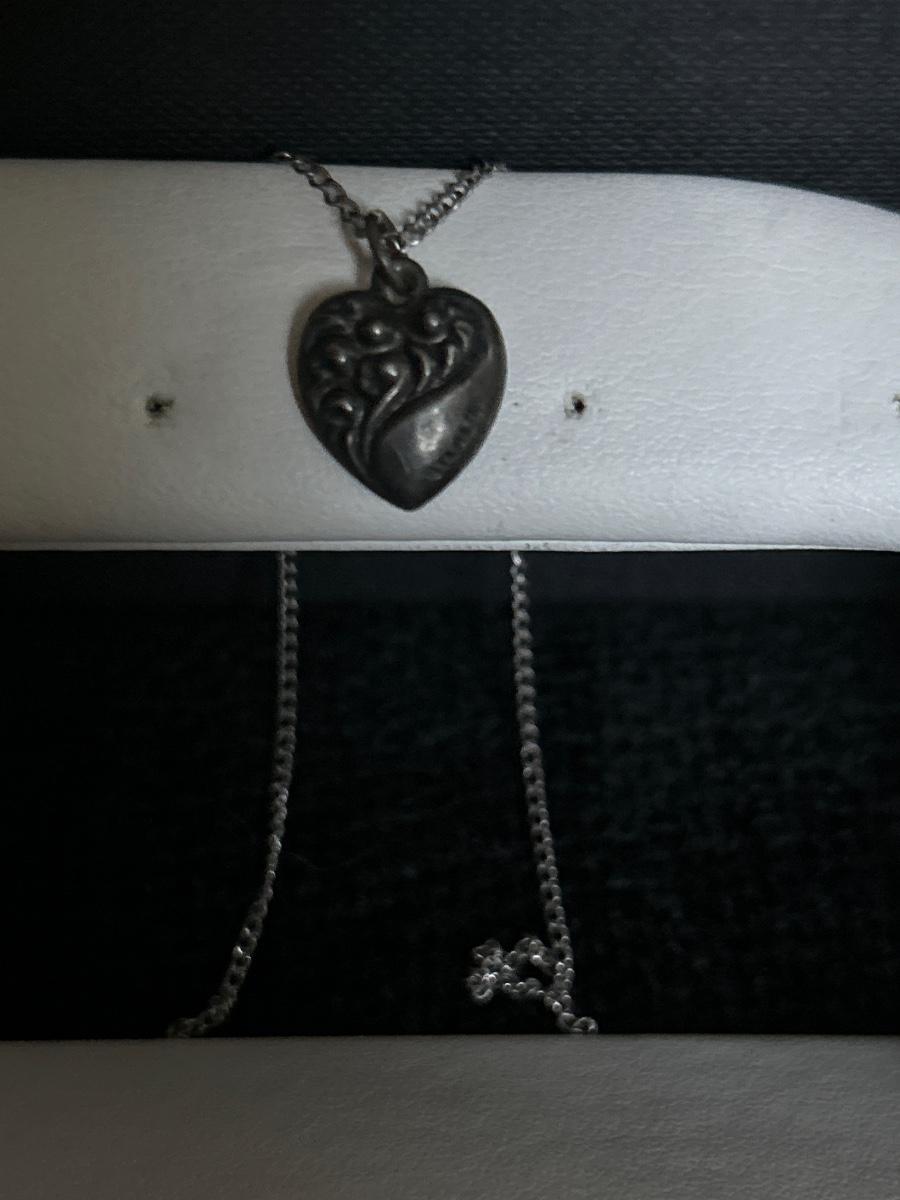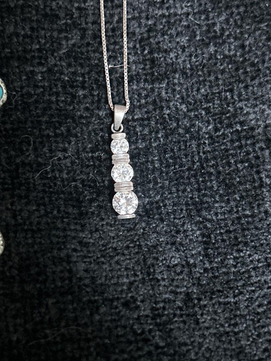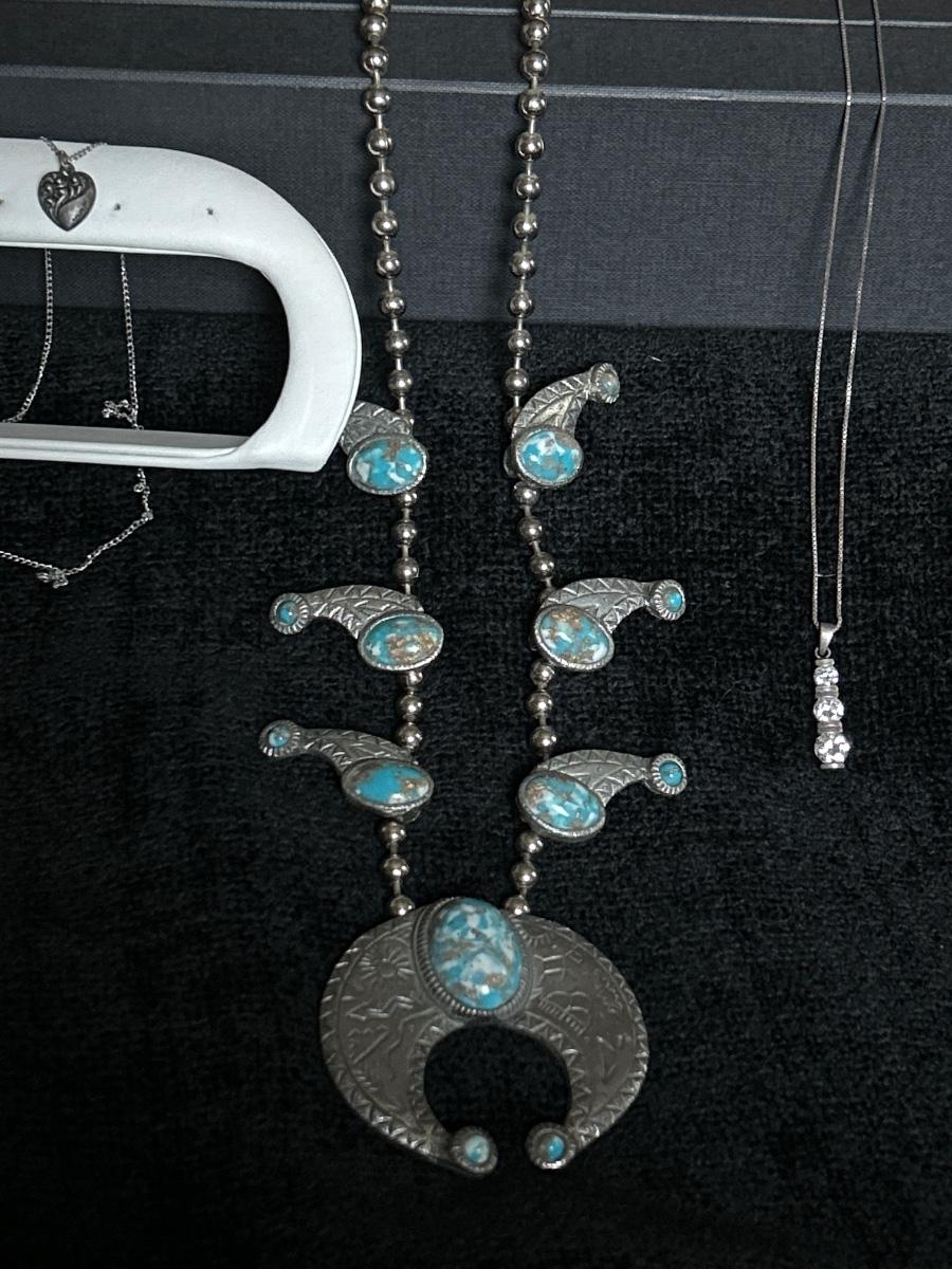 The squash blossom is not stamped. It is heavy. The heart necklace is stamped sterling and the three stone necklace is also stamped 9 to 5.
