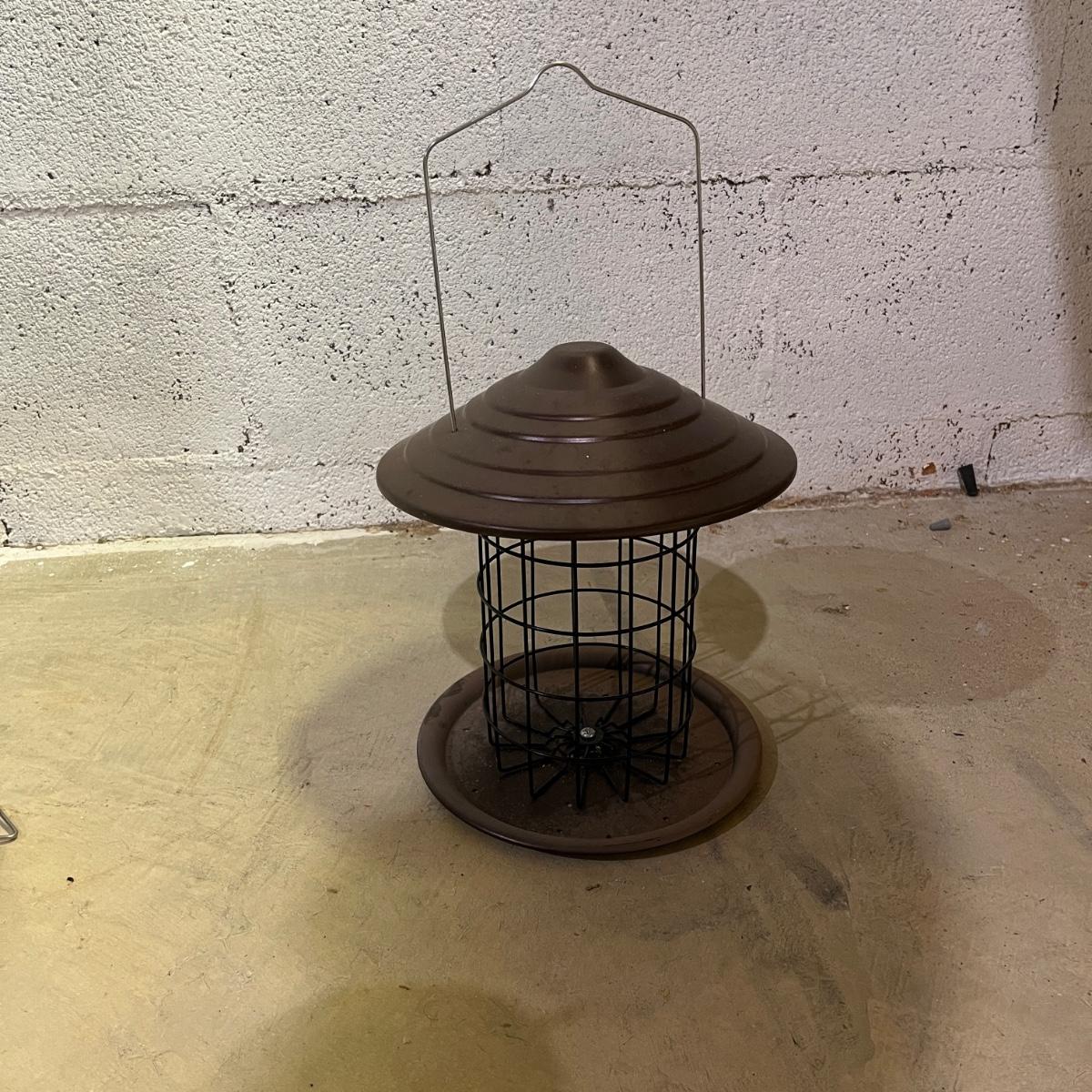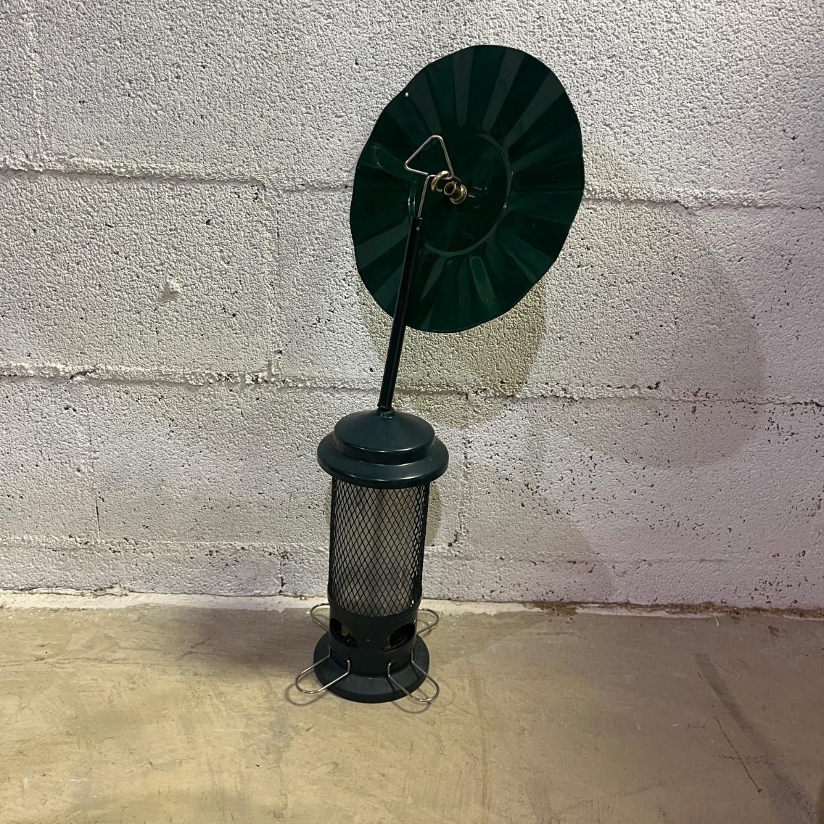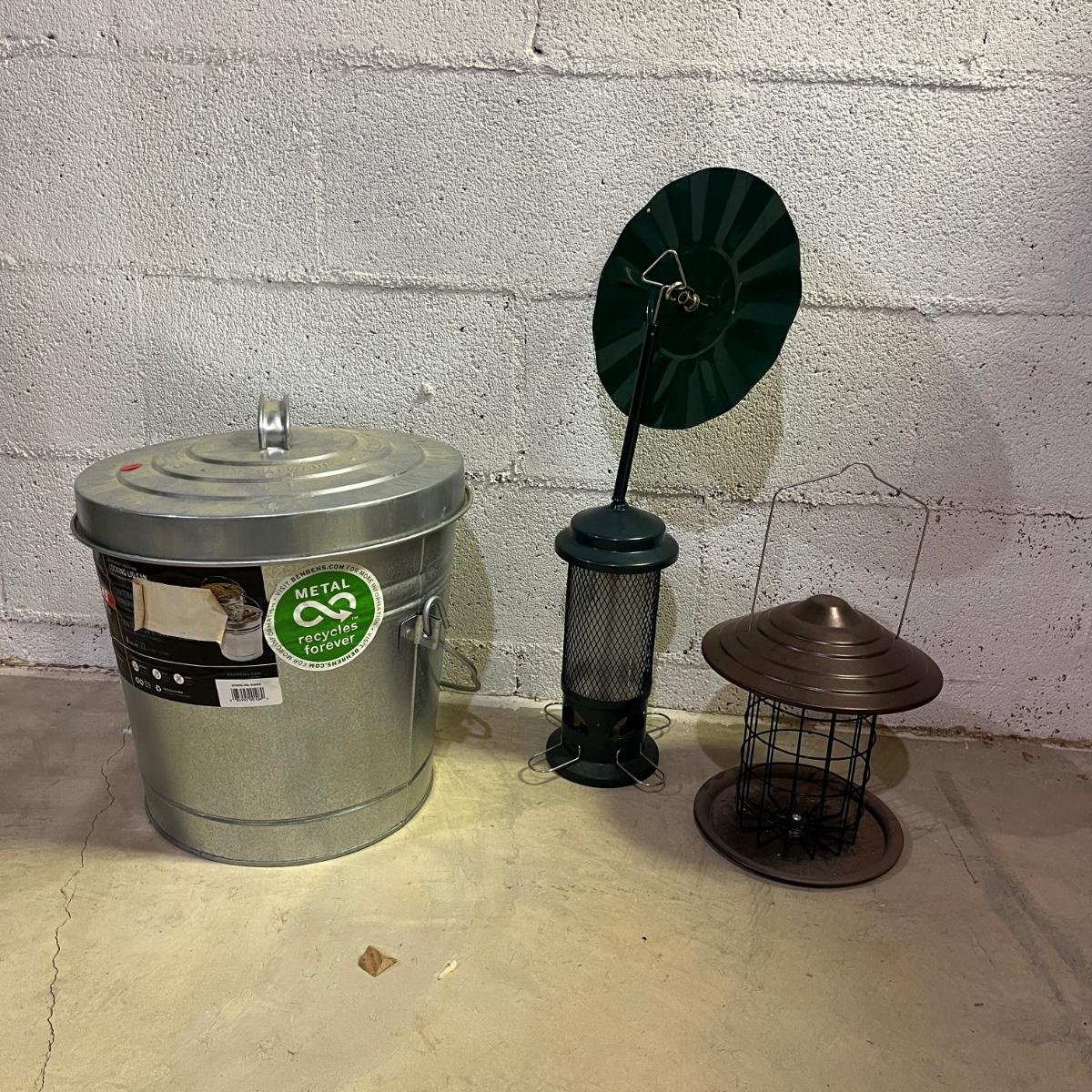 Lot includes a Squirrel Buster bird feeder that measures 8"D x 12"H, Behrens Six gallon metalware can with locking lid, and a second bird feeder.