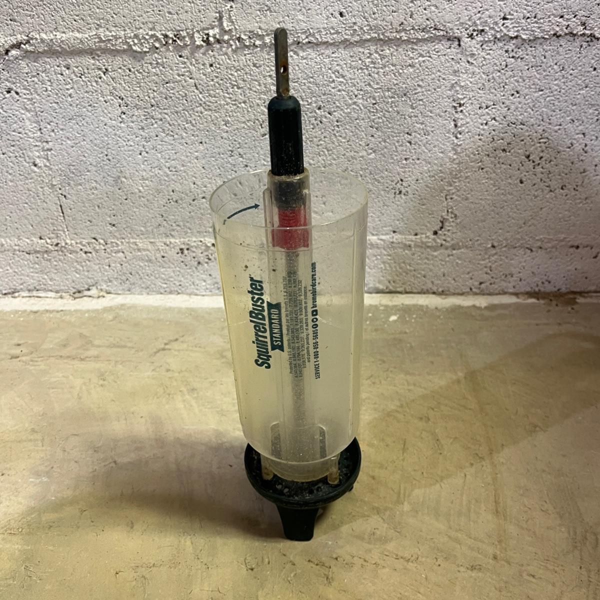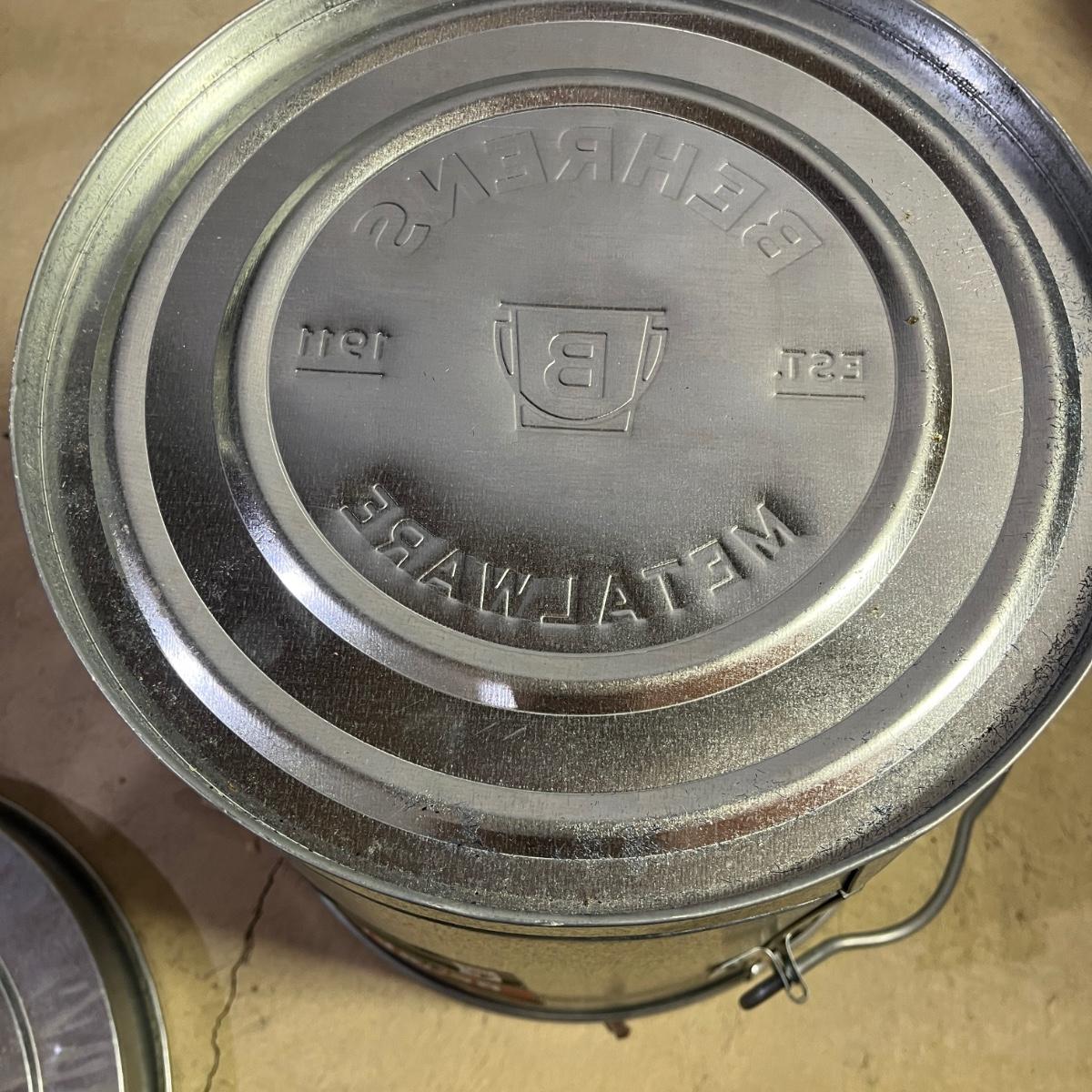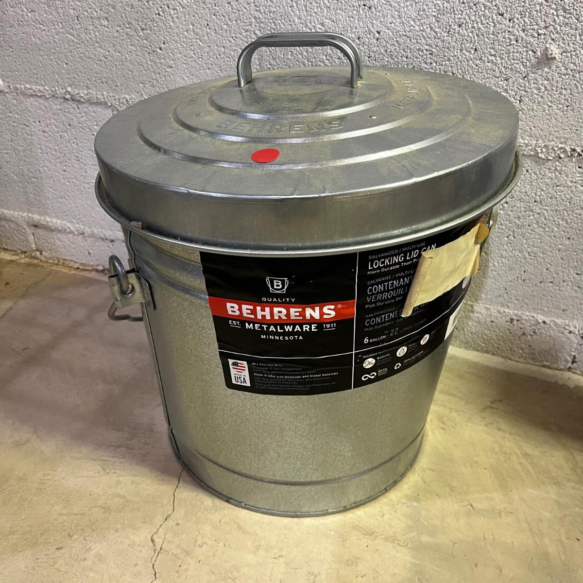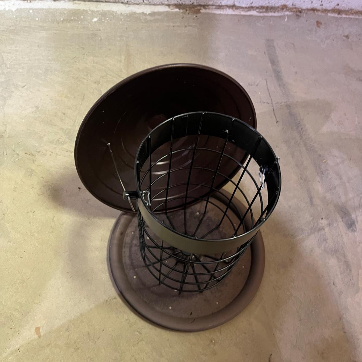 Lot includes a Squirrel Buster bird feeder that measures 8"D x 12"H, Behrens Six gallon metalware can with locking lid, and a second bird feeder.