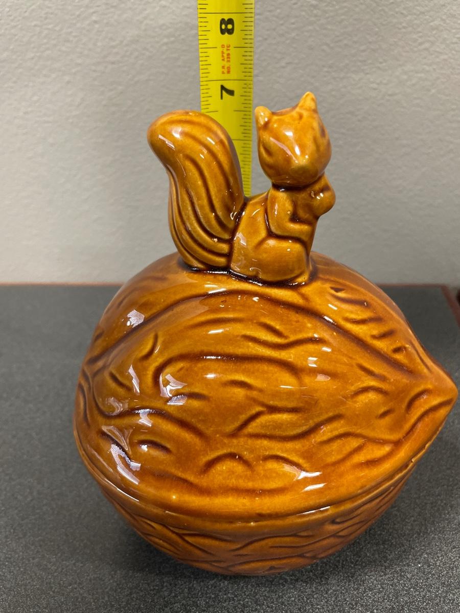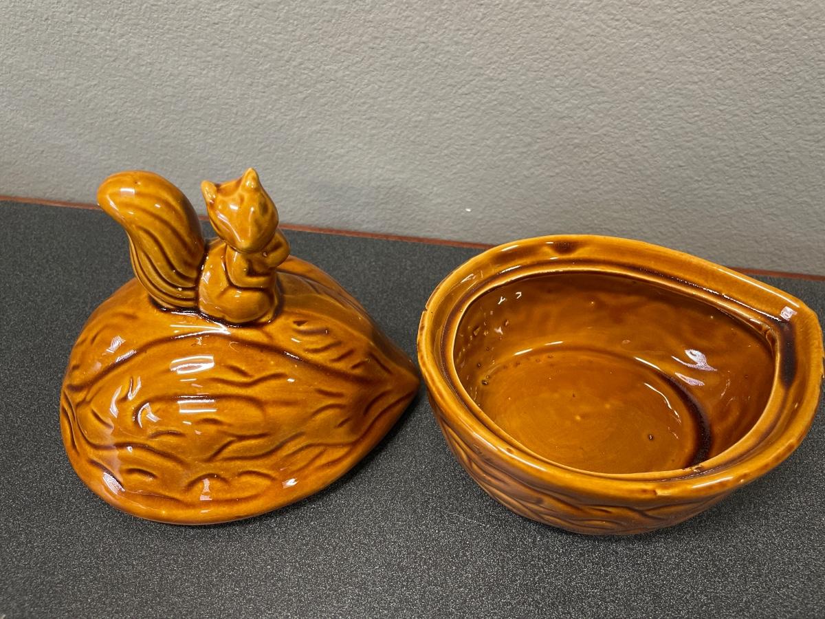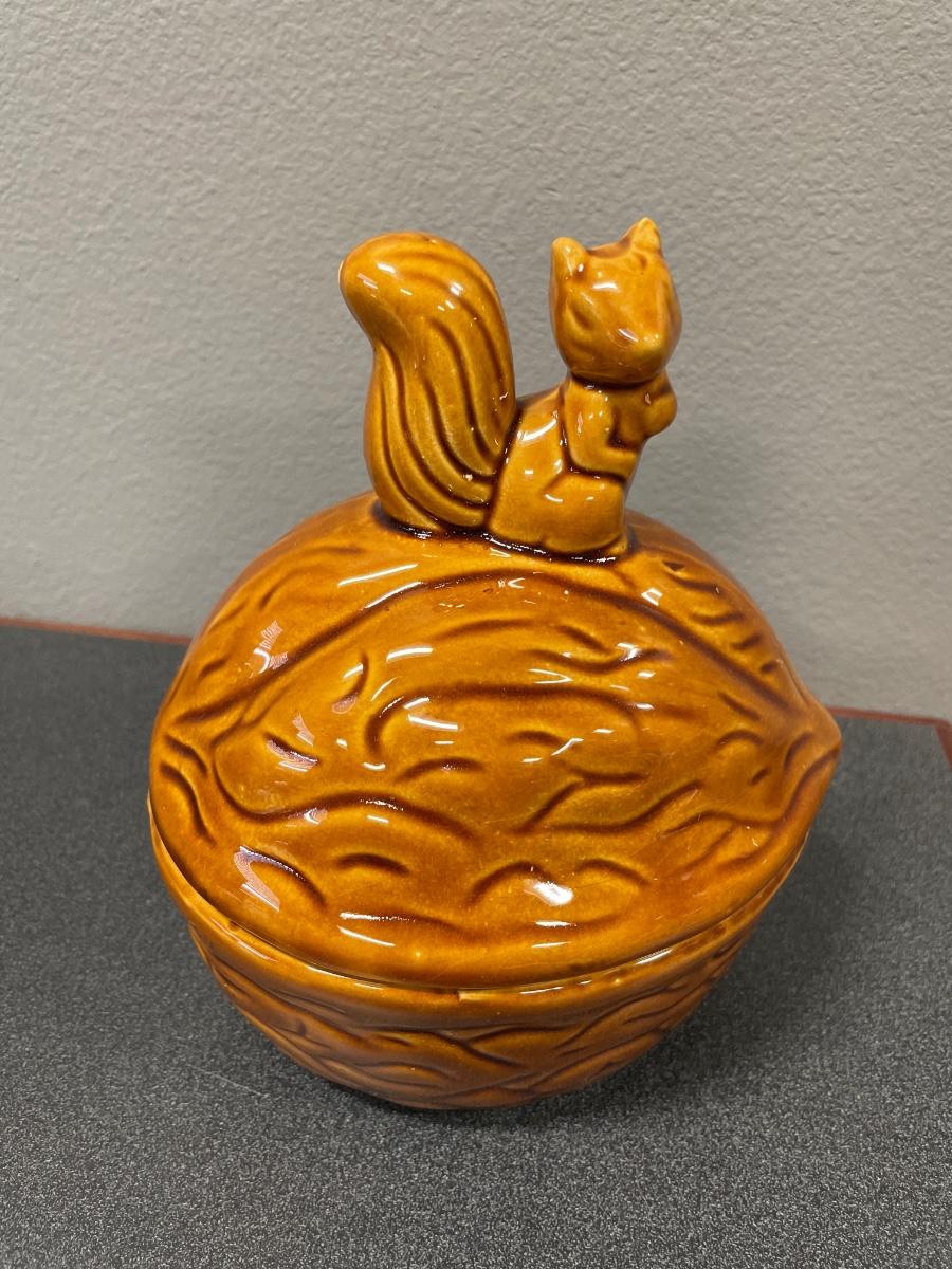 Ceramic nut with squirrel on top. Jewelry holder