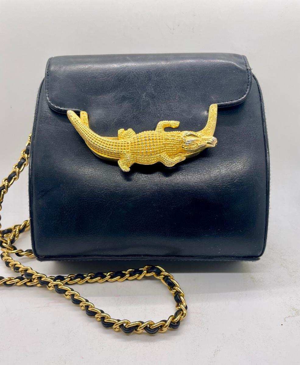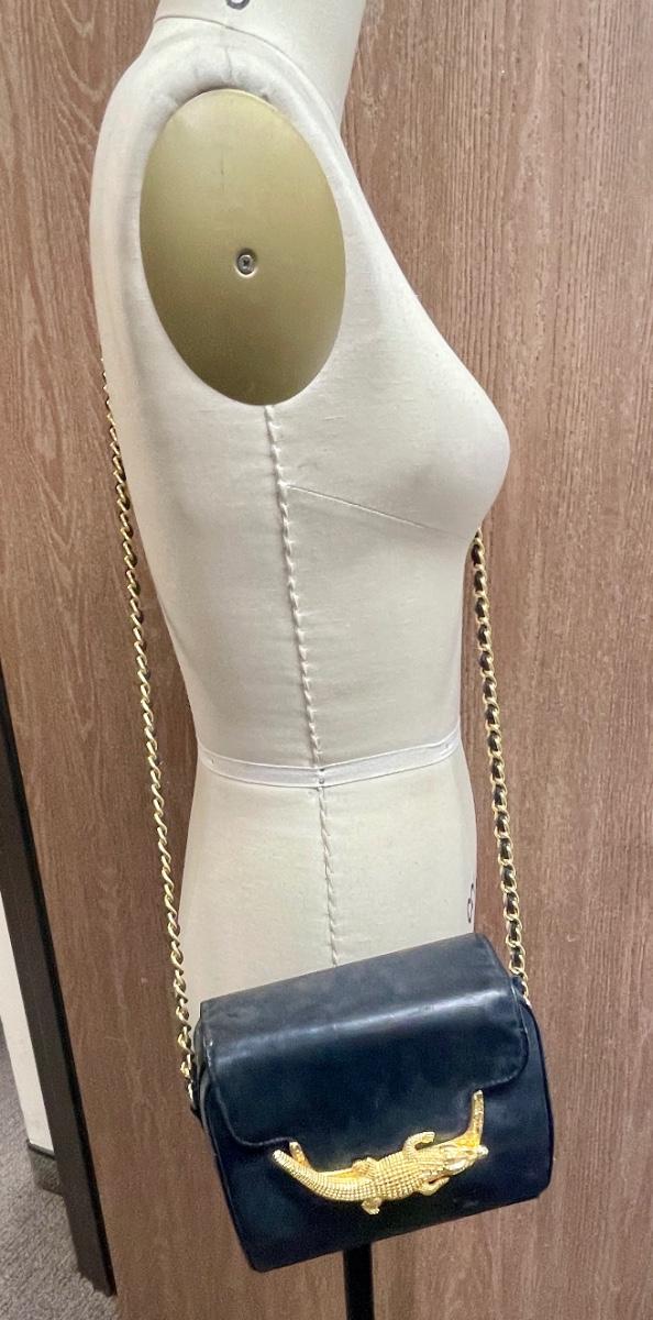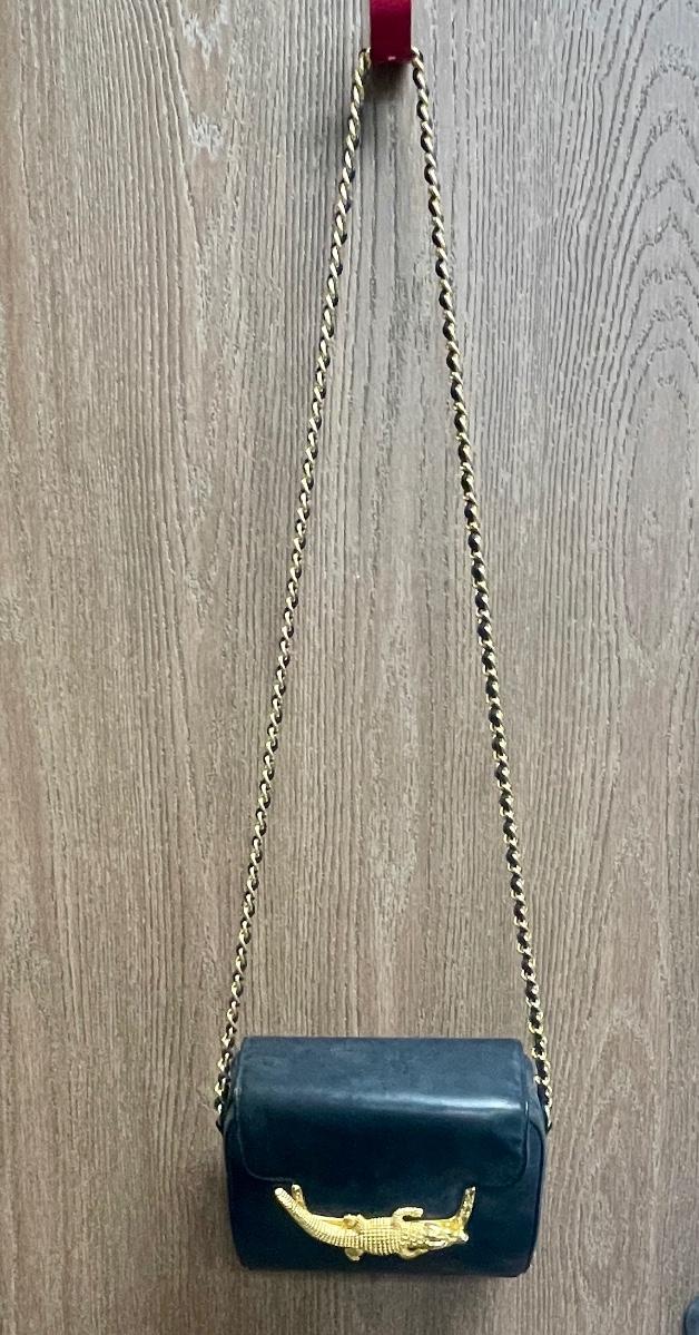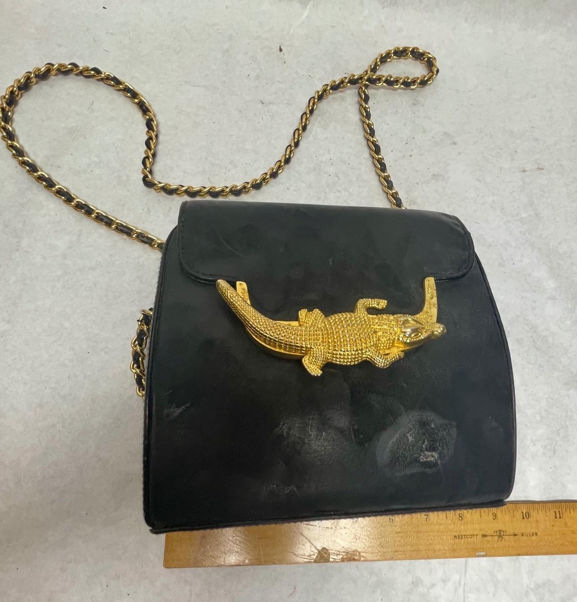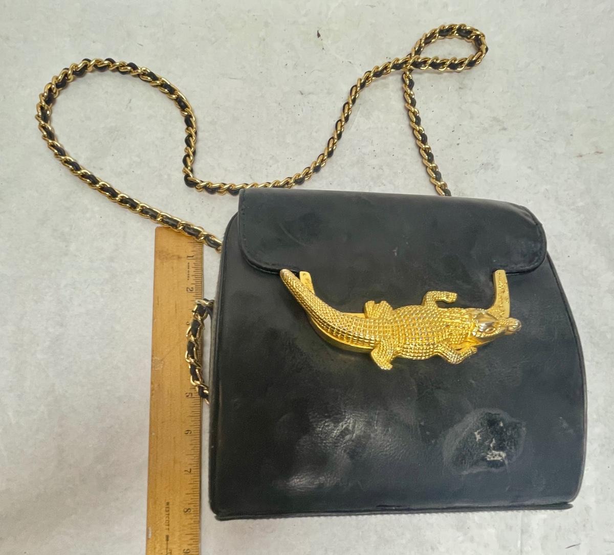 Black leather-like material with a gold tone alligator on the flap. Gold tone chain and leather strap. Good condition.